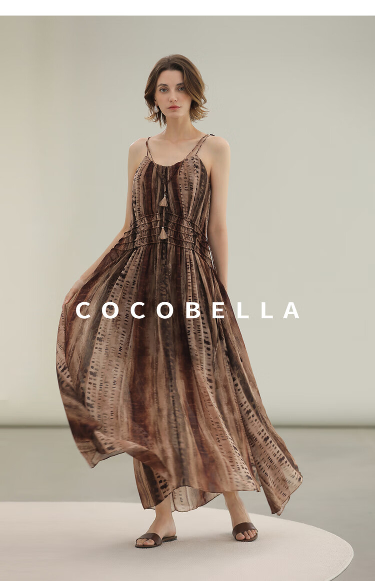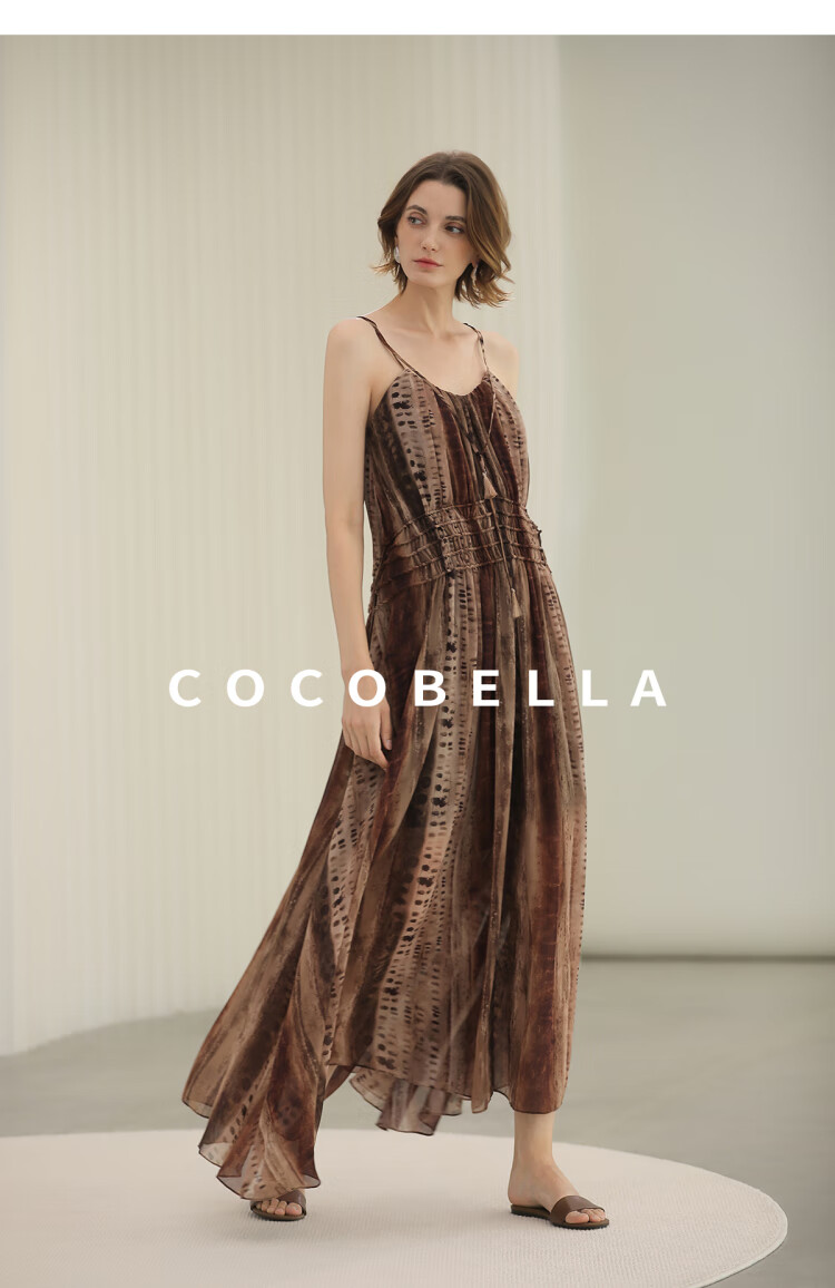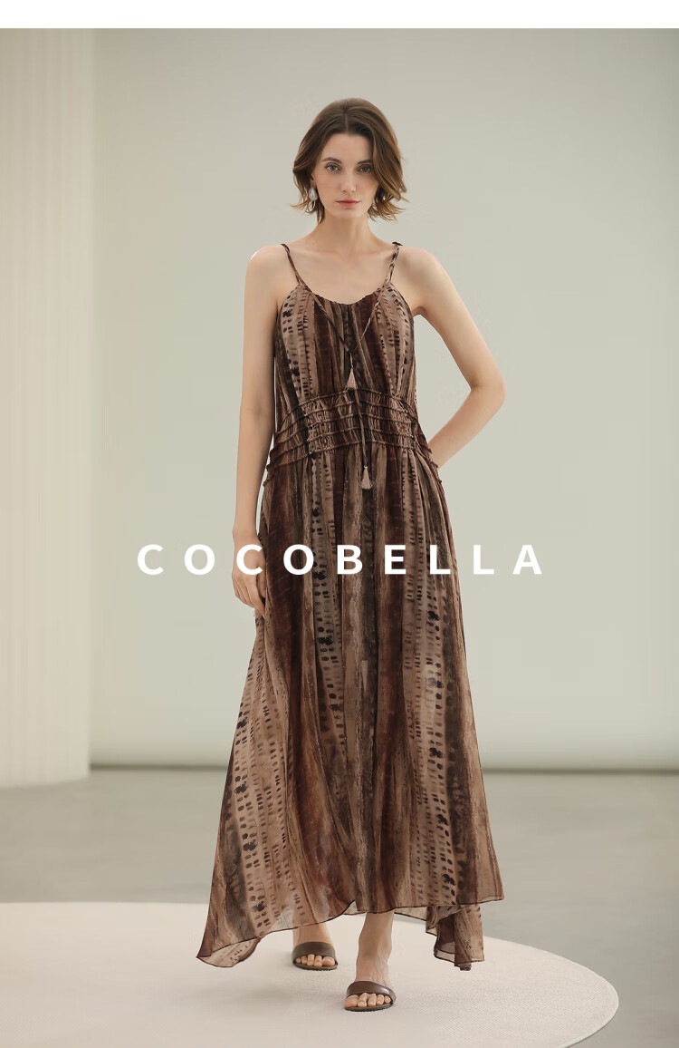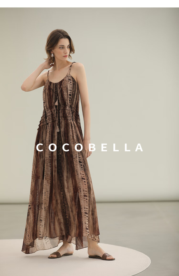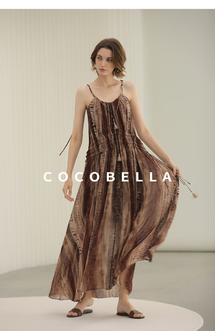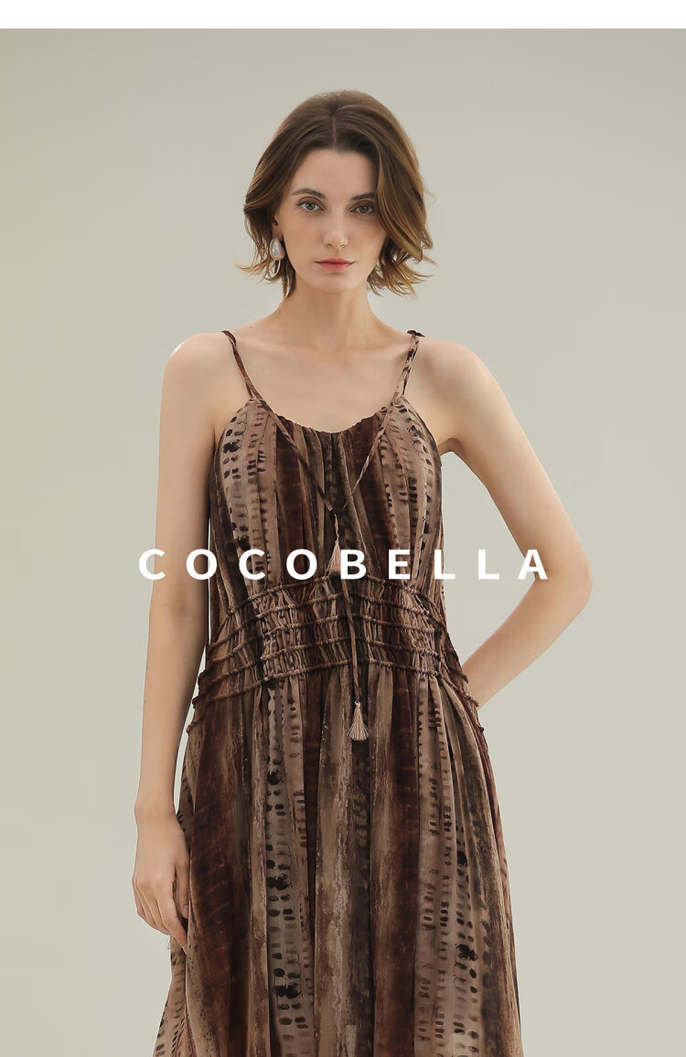 COCOBELLA[水彩摩卡]重工抽褶腰绳流苏度假吊带连衣裙FR3101