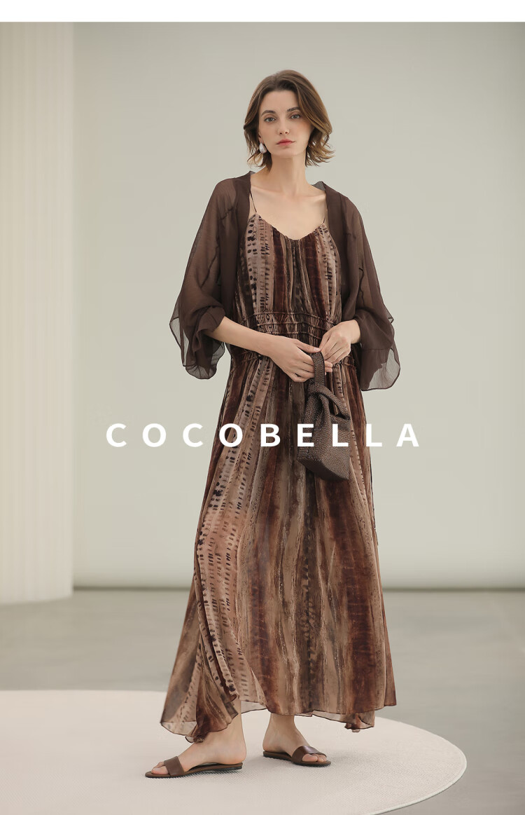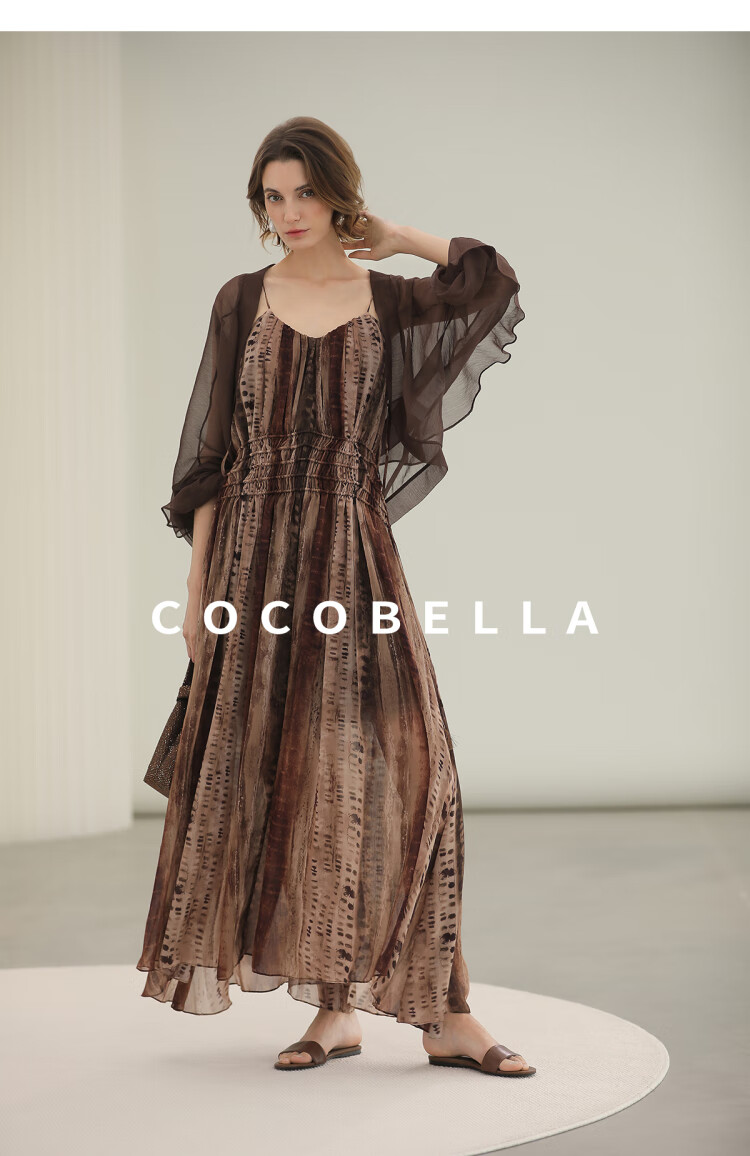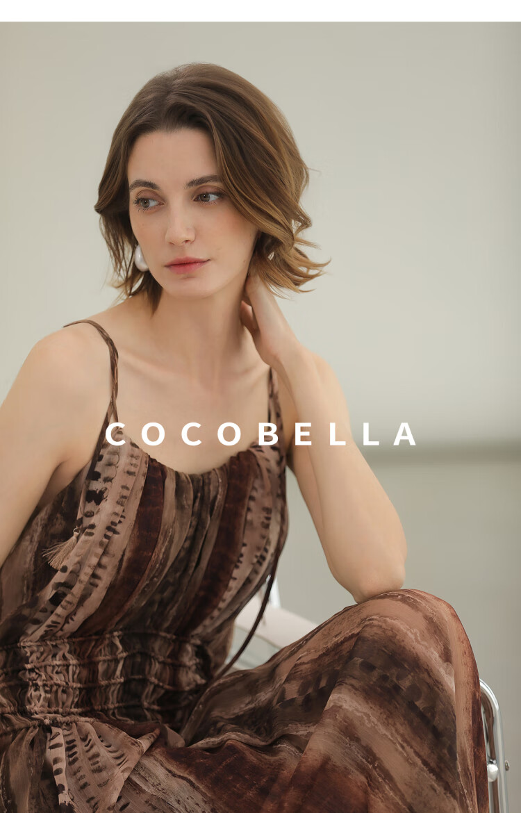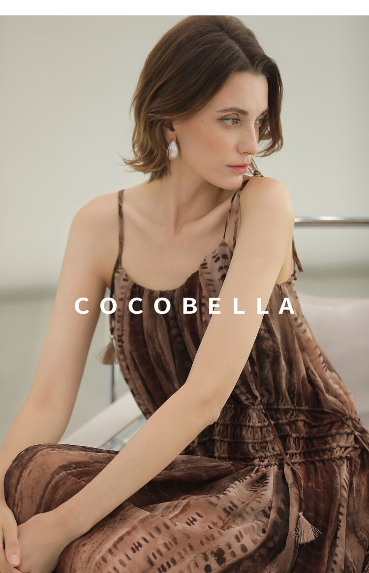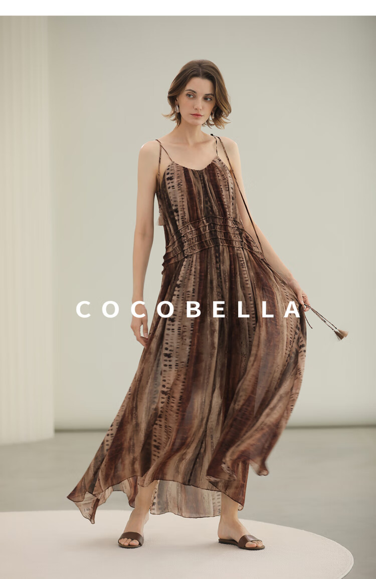 COCOBELLA[水彩摩卡]重工抽褶腰绳流苏度假吊带连衣裙FR3101