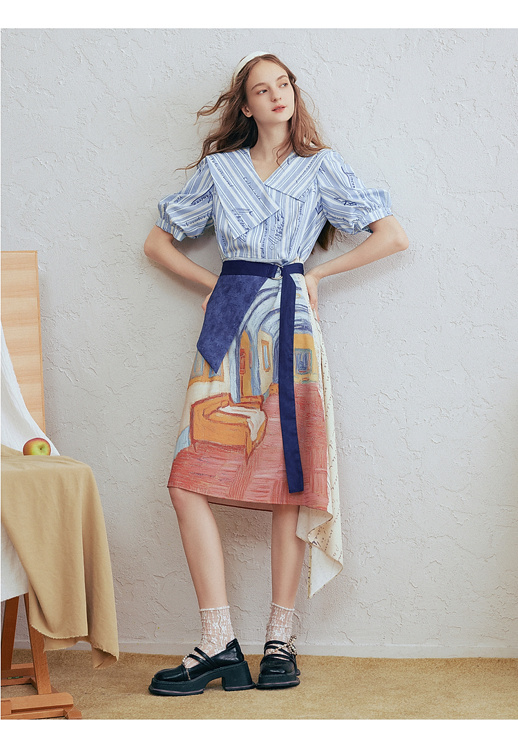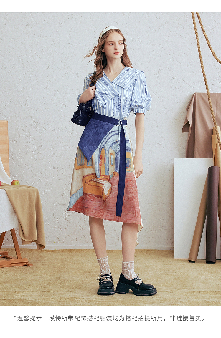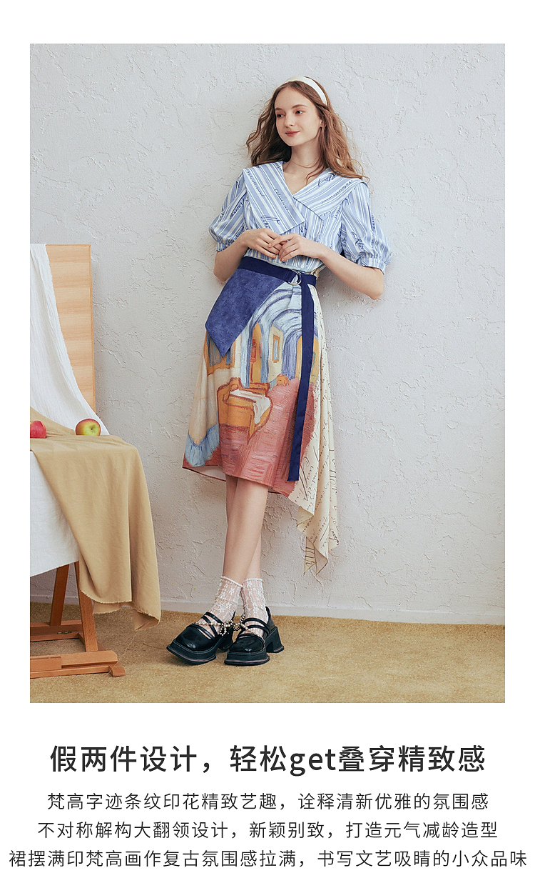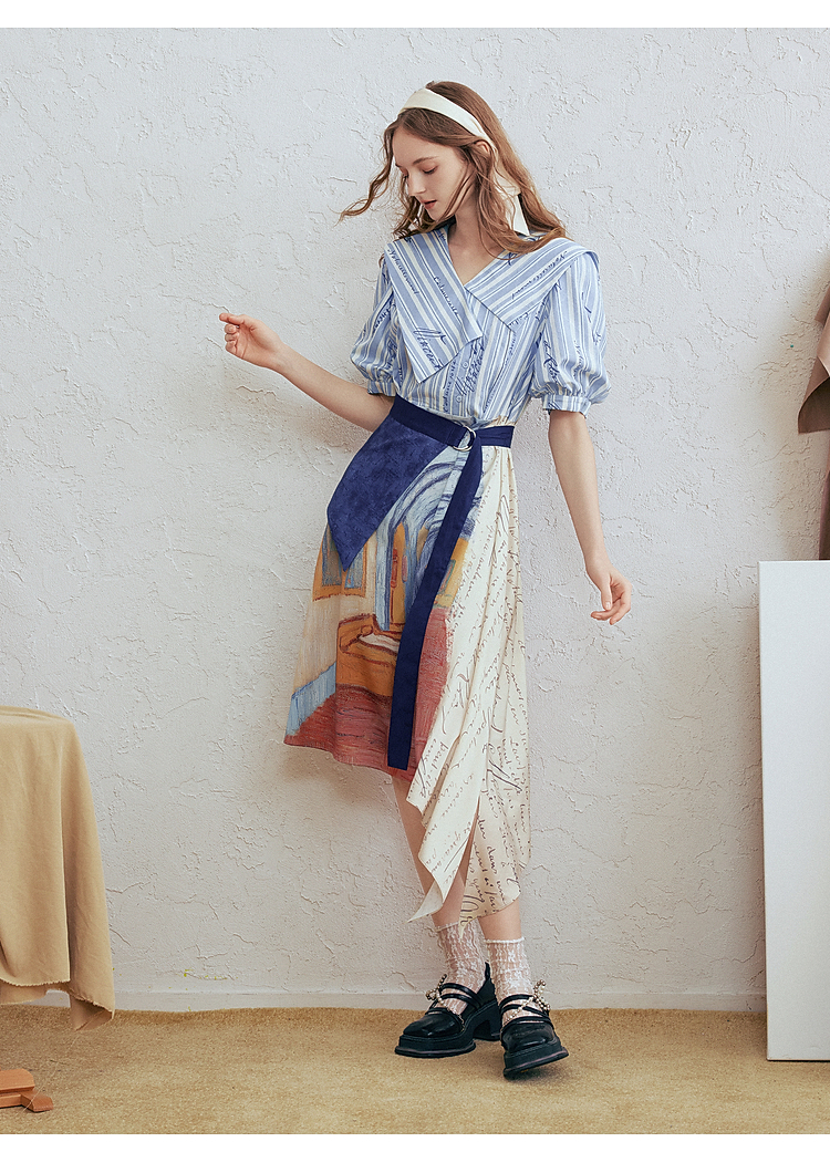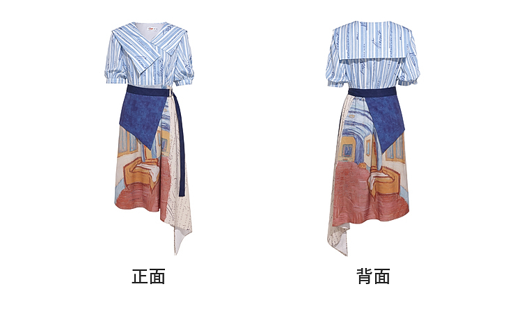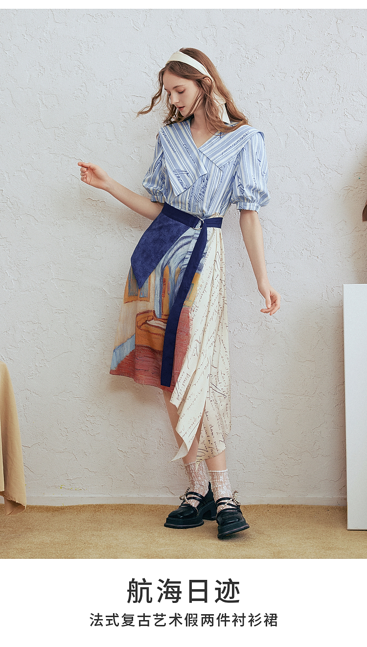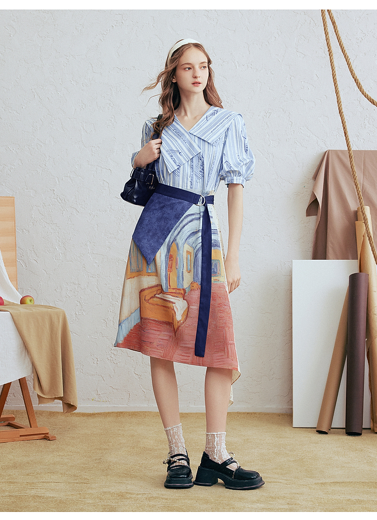 两三事梵高文艺航海日迹2026春新款条纹拼接印花不对称翻领连衣裙