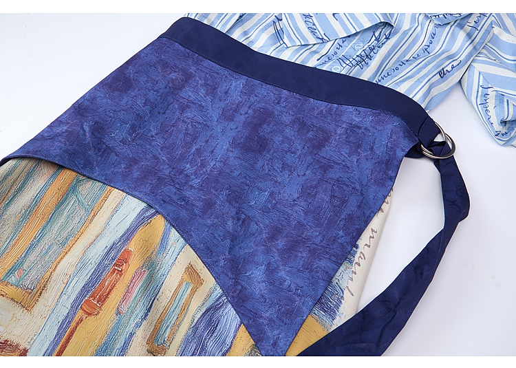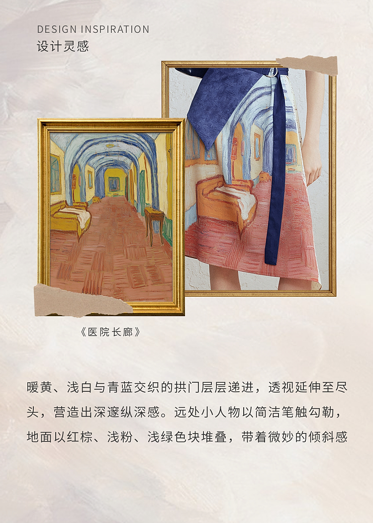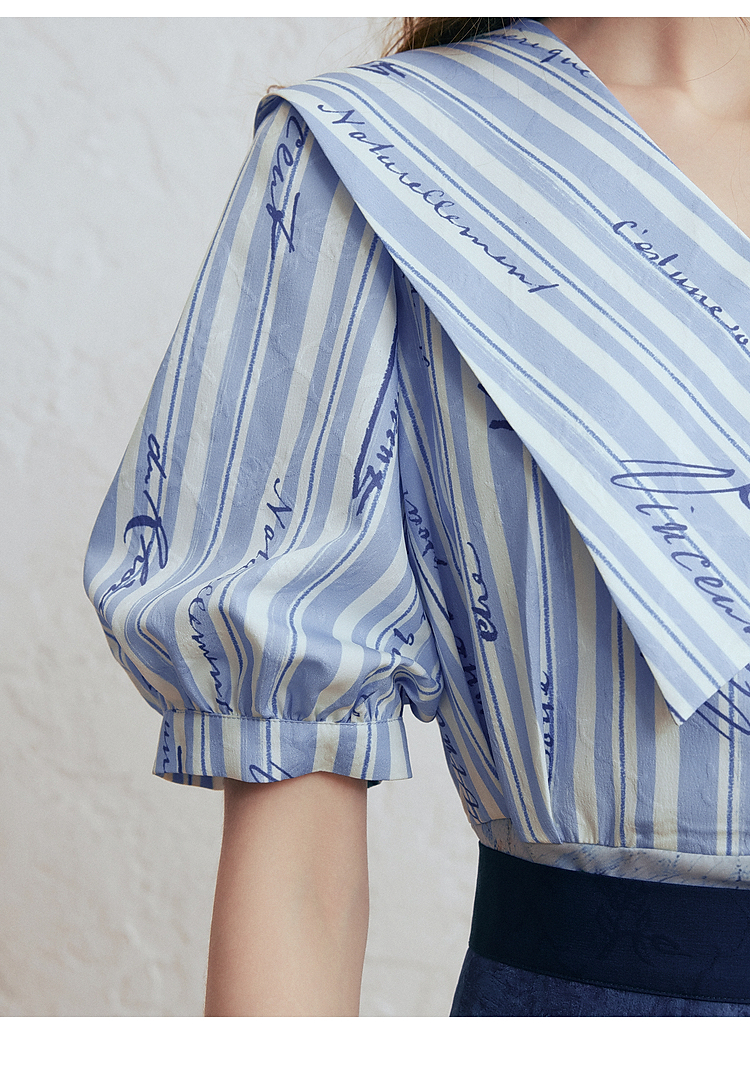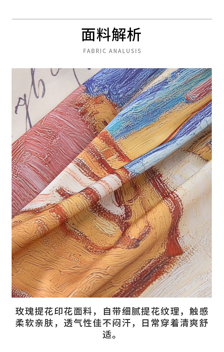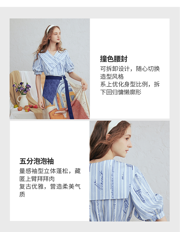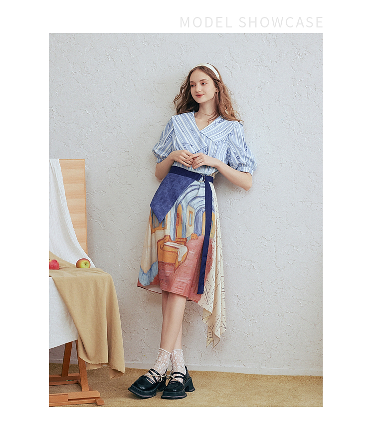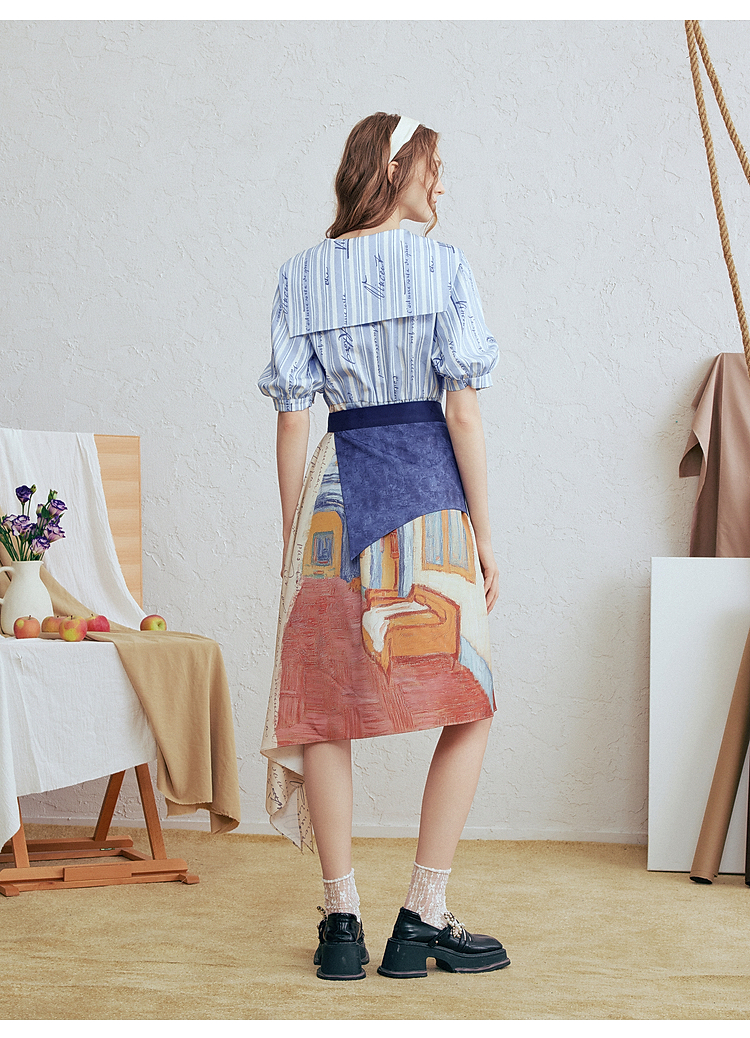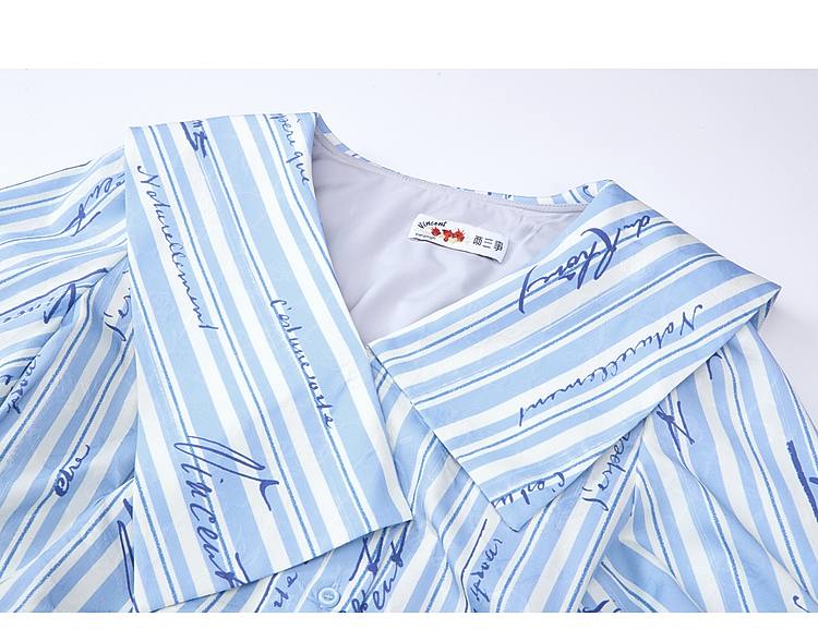 两三事梵高文艺航海日迹2026春新款条纹拼接印花不对称翻领连衣裙