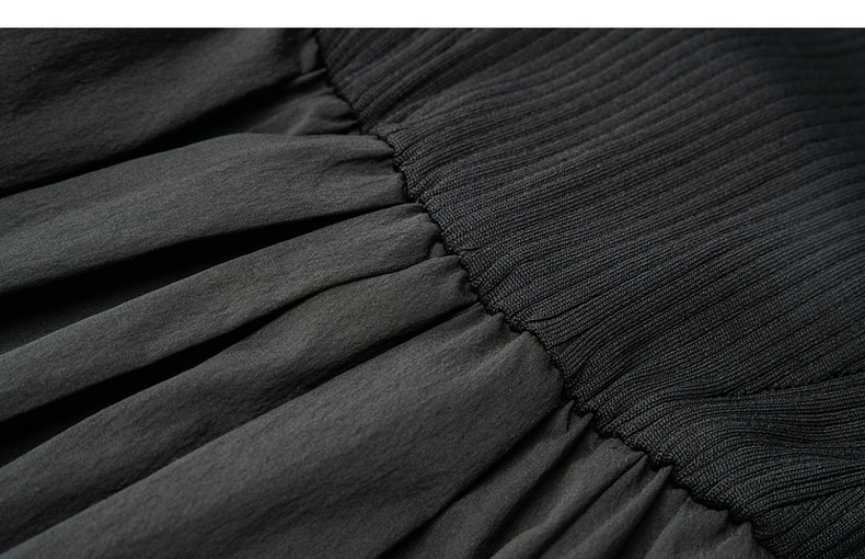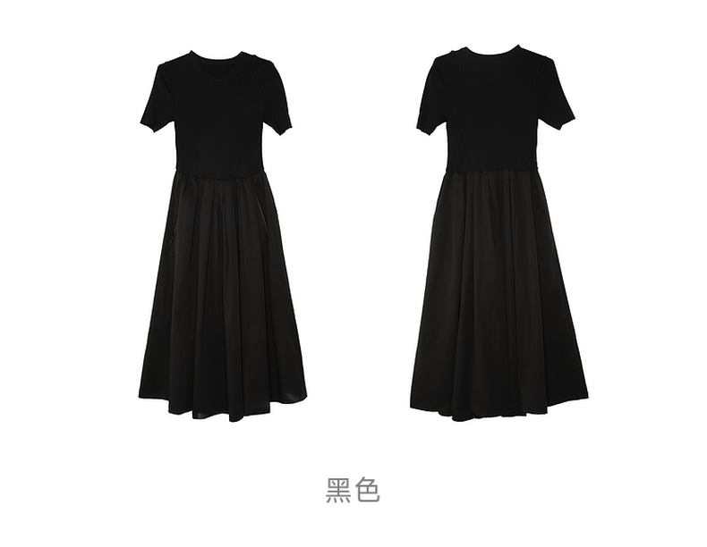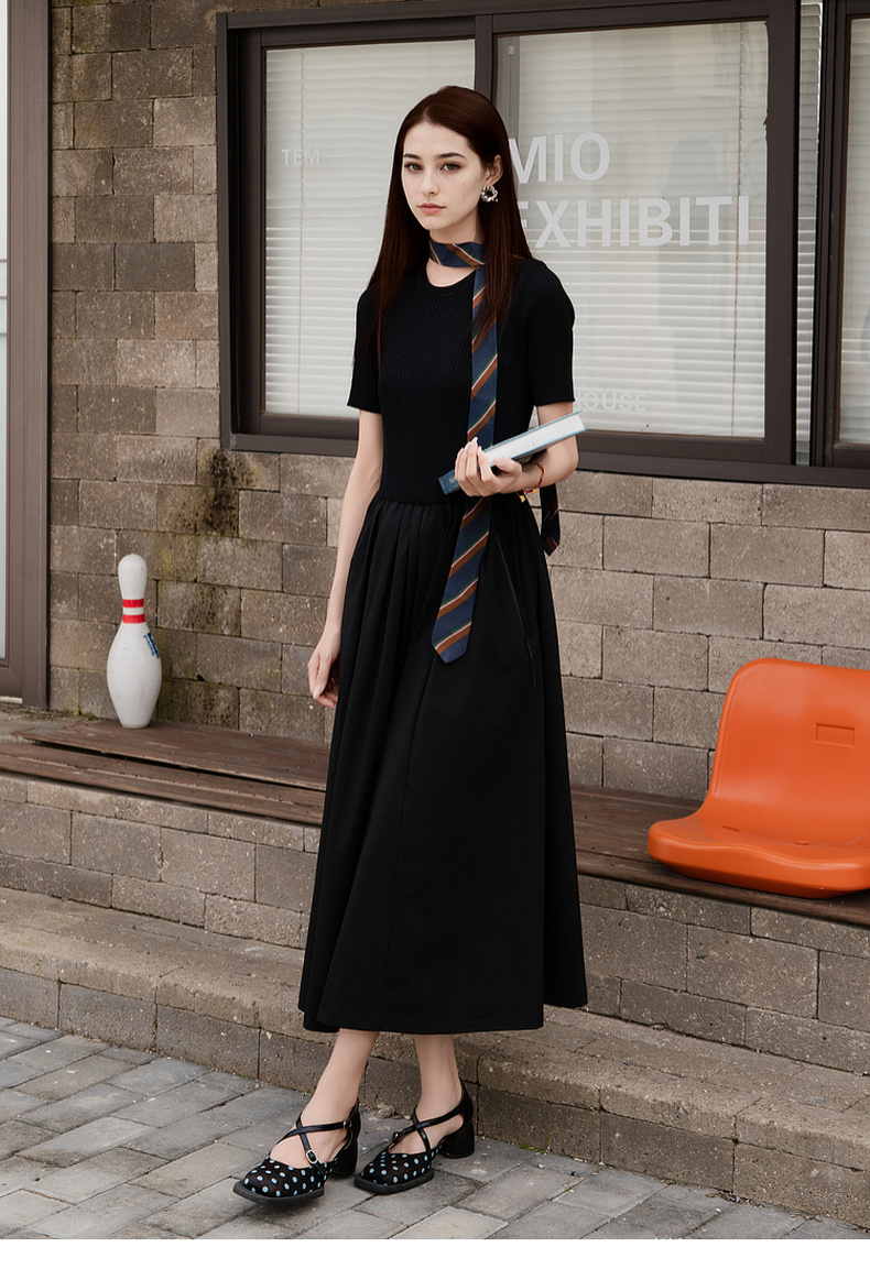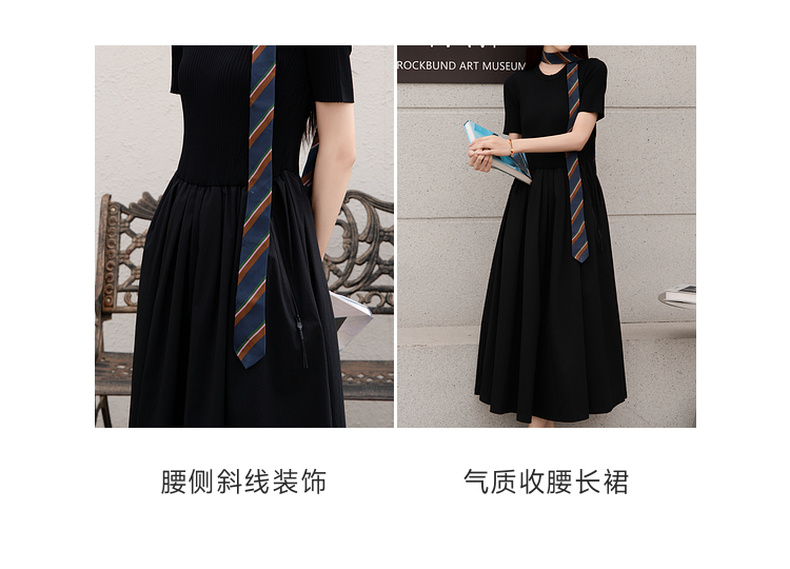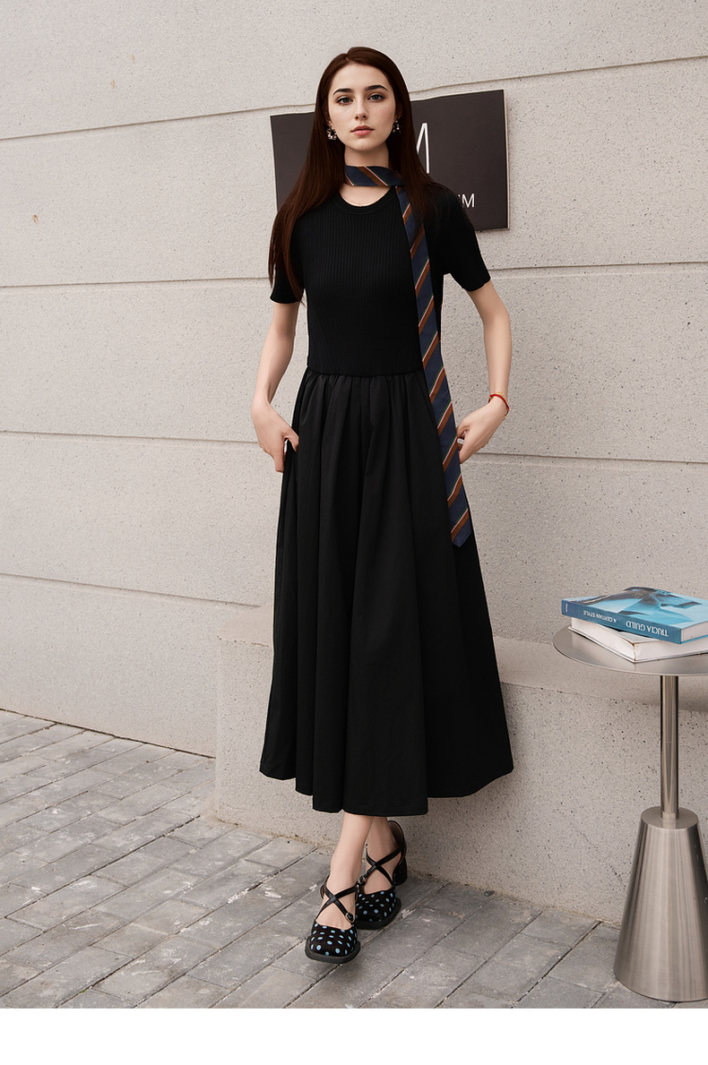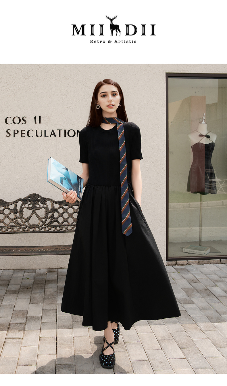 谜底黑色连衣裙2025春季新品气质优雅修身针织长裙短袖251MZ0400