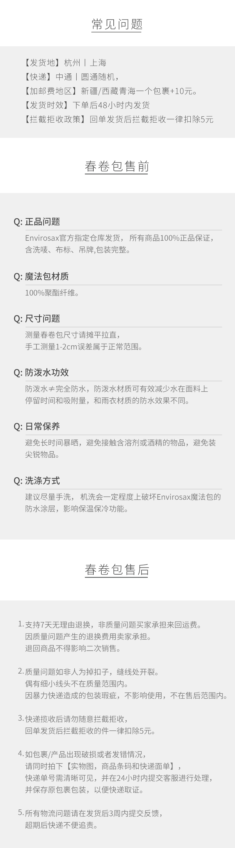 | 【退货要求】 1.支持7天无理由退换,非质量问题自行承担寄回运费。因质量问题产生的退换费用卖家承担。 退回商品不得影响二次销售。 2.质量问题如非人为掉扣子,春卷包开裂。偶有细小线头不在质量范围内。 因暴力快递造成的包装瑕疵,不影响使用,不在售后范围内。 3.快递揽收后请勿随意拦截拒收,如遇疫情自然灾害等特俗情况可能中转速度放慢,请耐心等待。 4.如包裹/产品出现破损或者发错情况,请同时拍下【实物图,商品条码和快递面单】,快递单号需清晰可见,并在24小时内提交客服进行处理,并保存原包裹包装,以便快递取证。 |