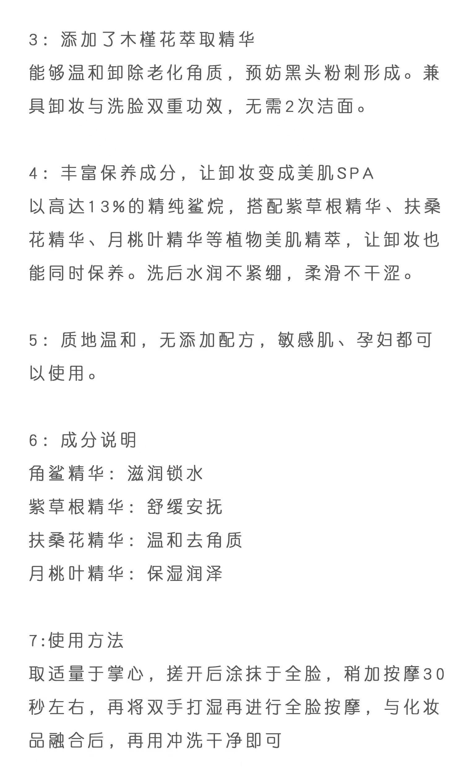 特别适合秋冬天啊!含鲨烯、橄榄油、甘油、天然蚕丝精华、维他命E等成分, 在轻松卸妆同时使肌肤滋润及柔软零负担。用后皮肤依然滋润舒适,可以无需再次清洁