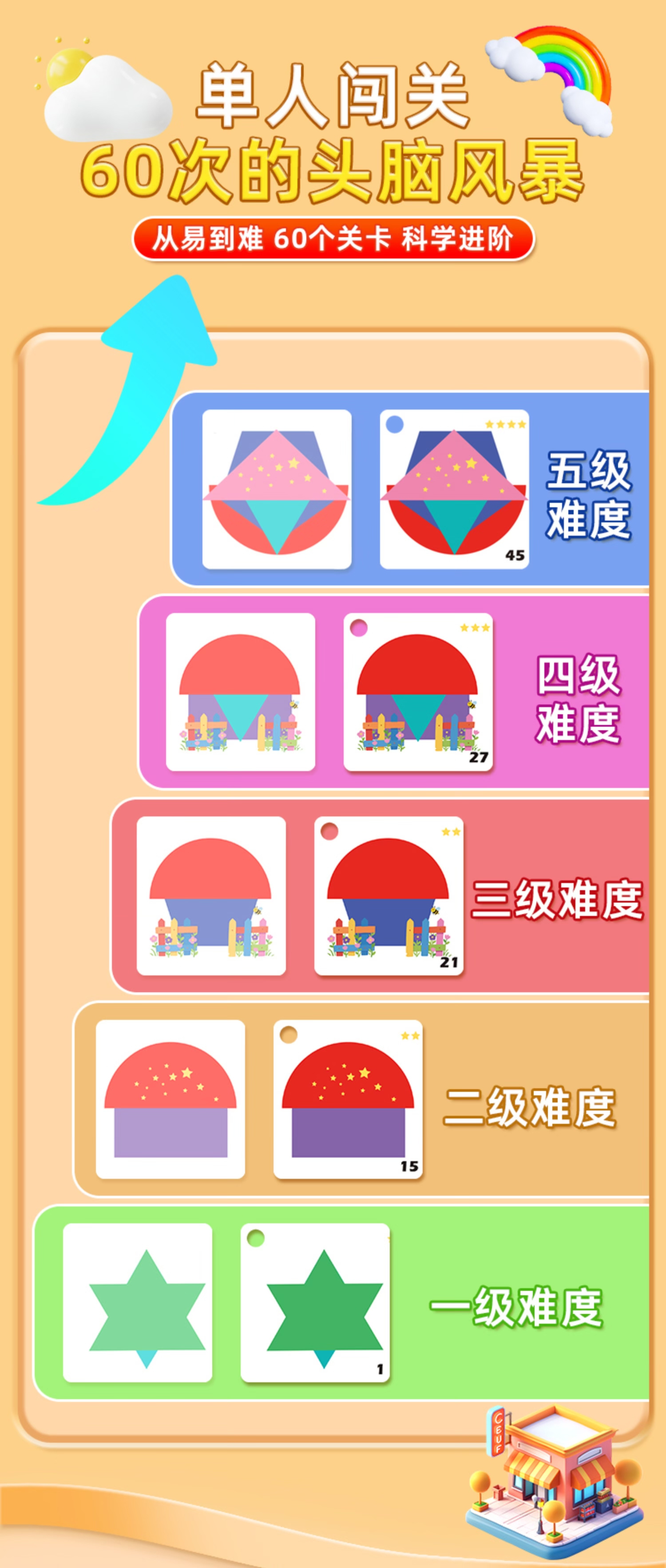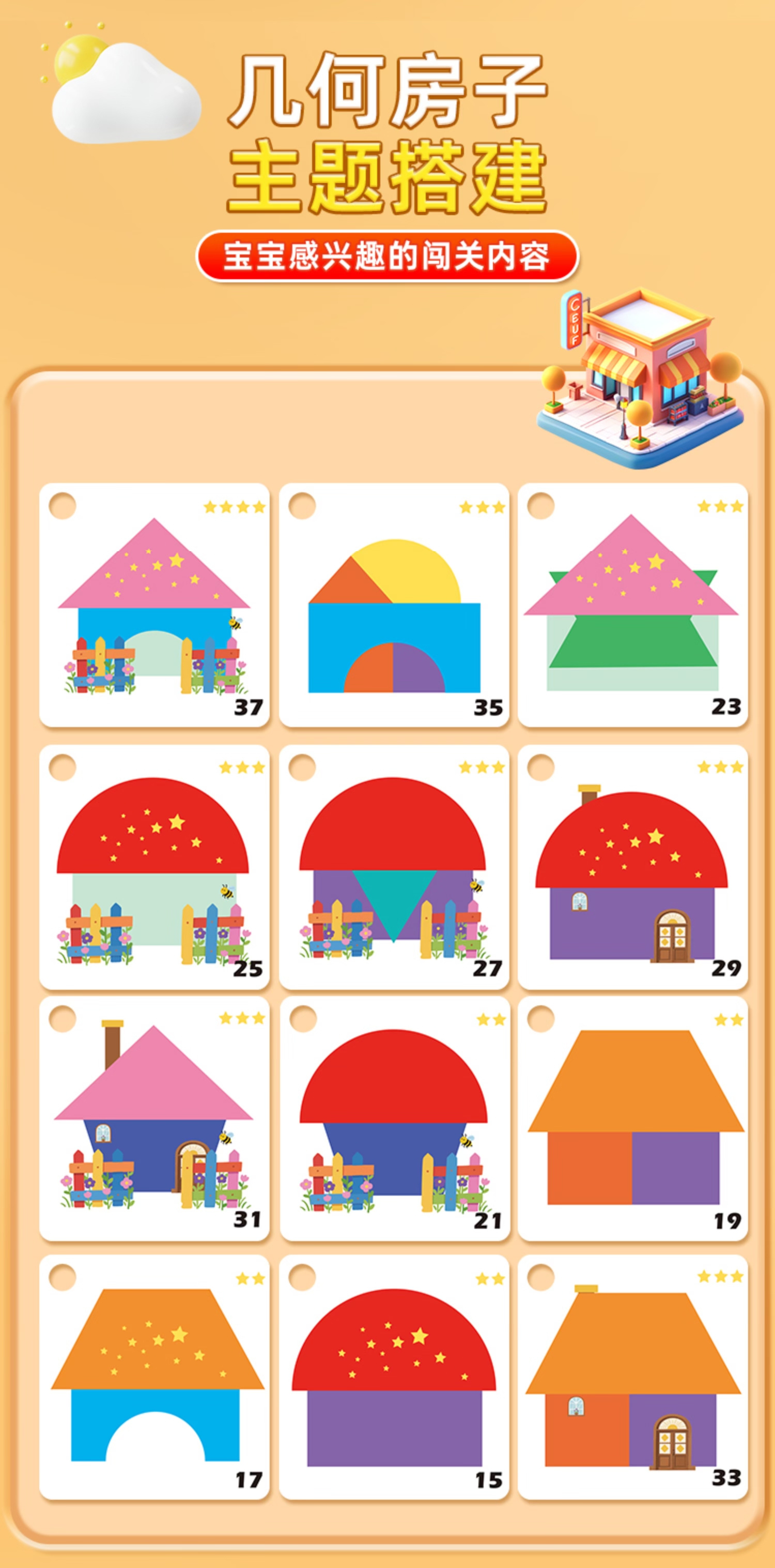 🍩60多道关卡,根据题卡拼出目标图形,充满挑战又好玩