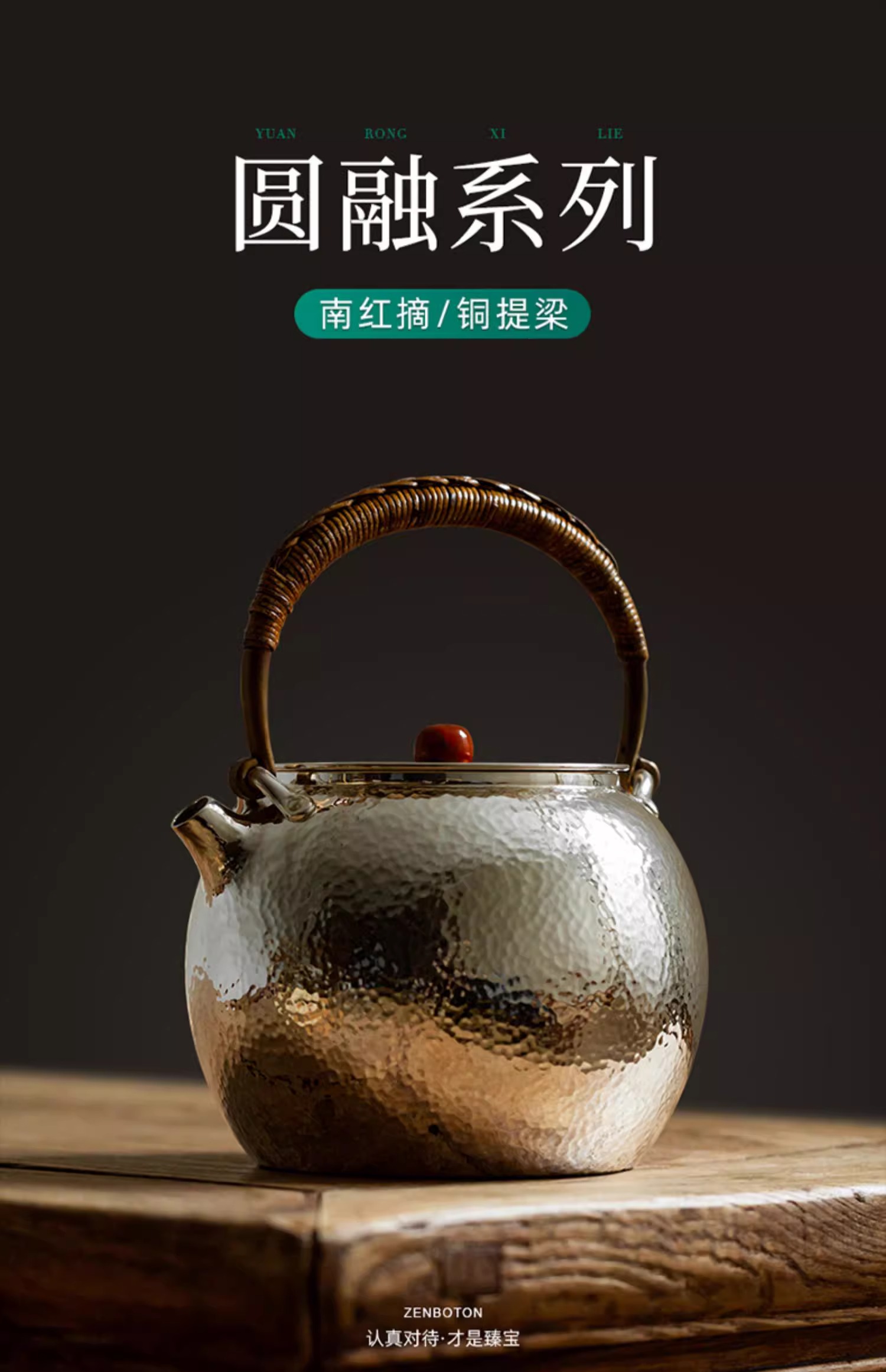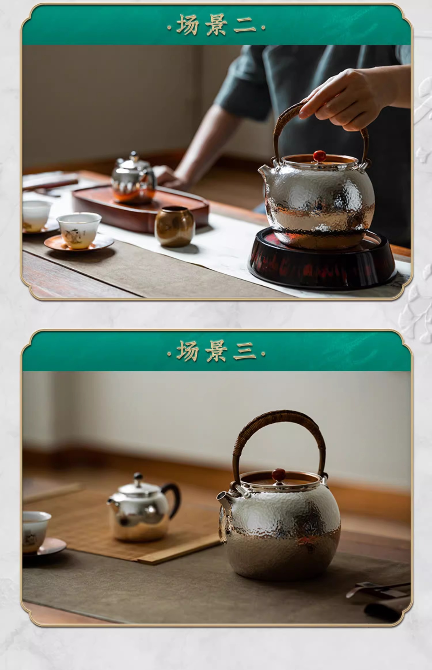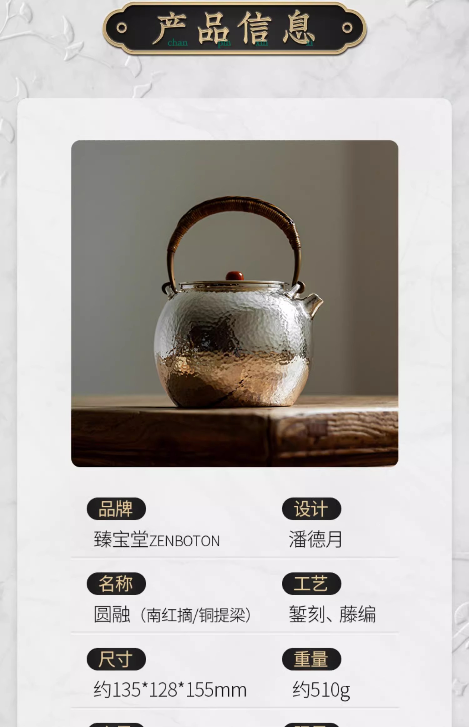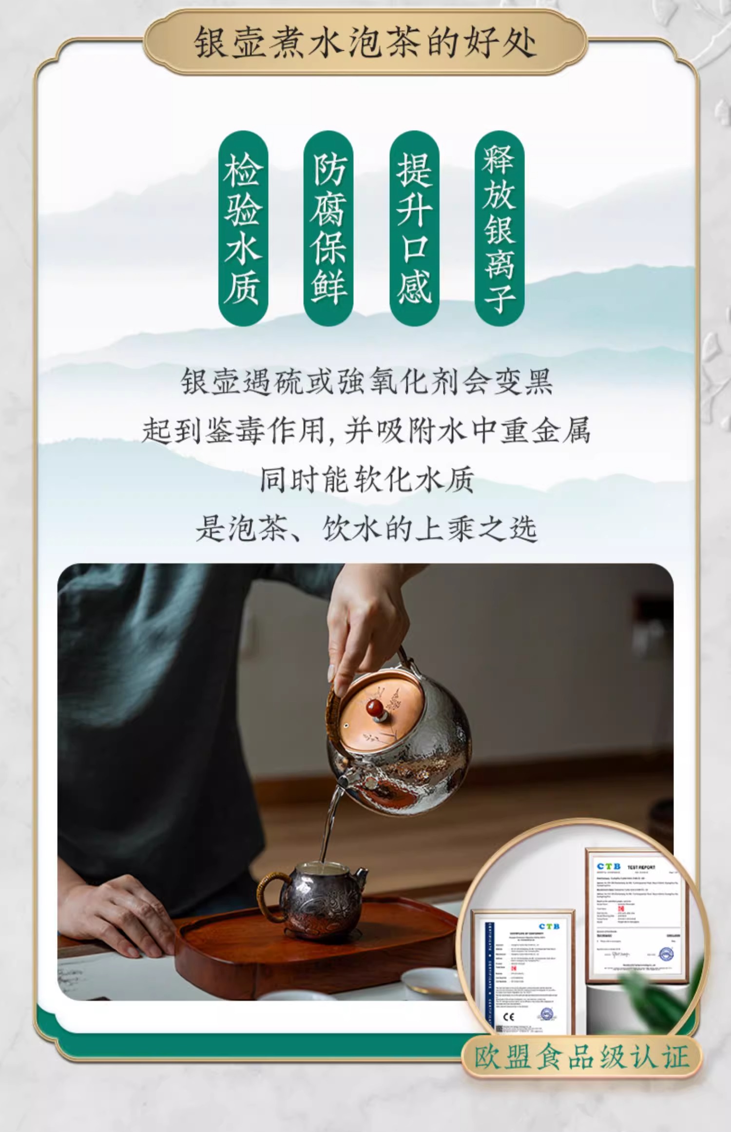 臻宝堂银壶 999纯银一张打烧水壶纯手工煮茶壶南红摘家用中式茶具南红摘圆融银壶900ml