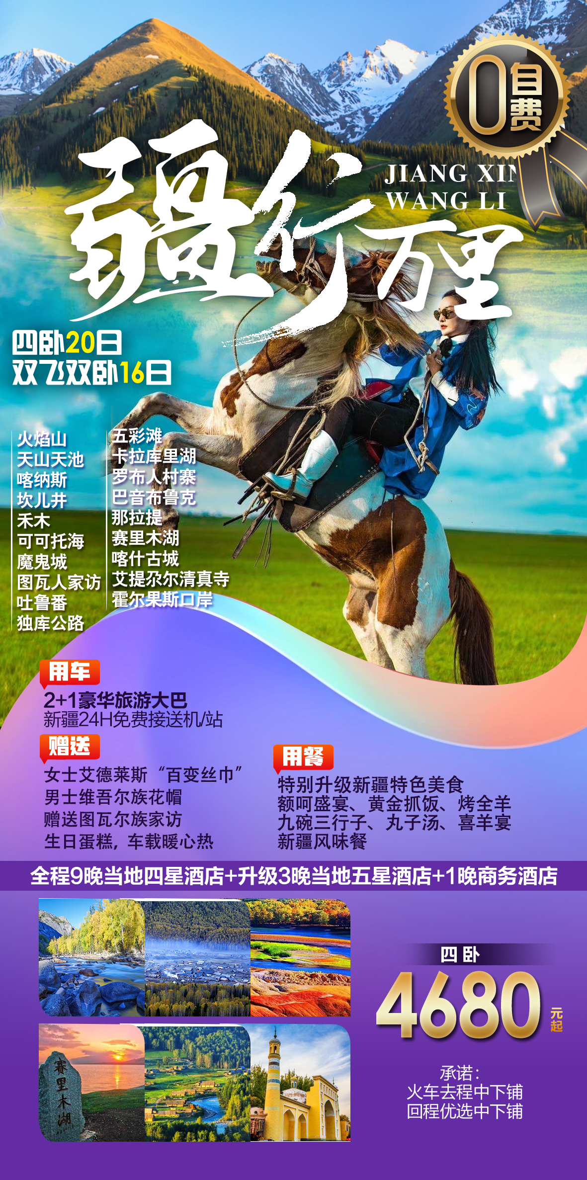 【长者漫游】¥4680/人起-疆行万里新疆双卧20日跟团游套餐(承诺往返中下铺+0自费+南北深度游)