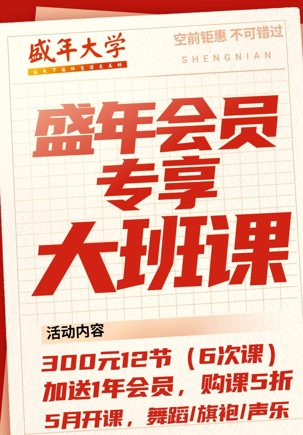 300 元/12 节,隔月开班,30 人开班,不开班全额退款。加送 1 年会员,购课五折