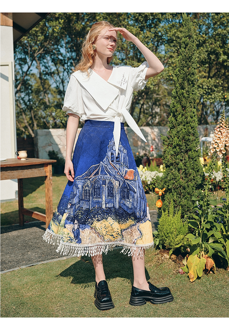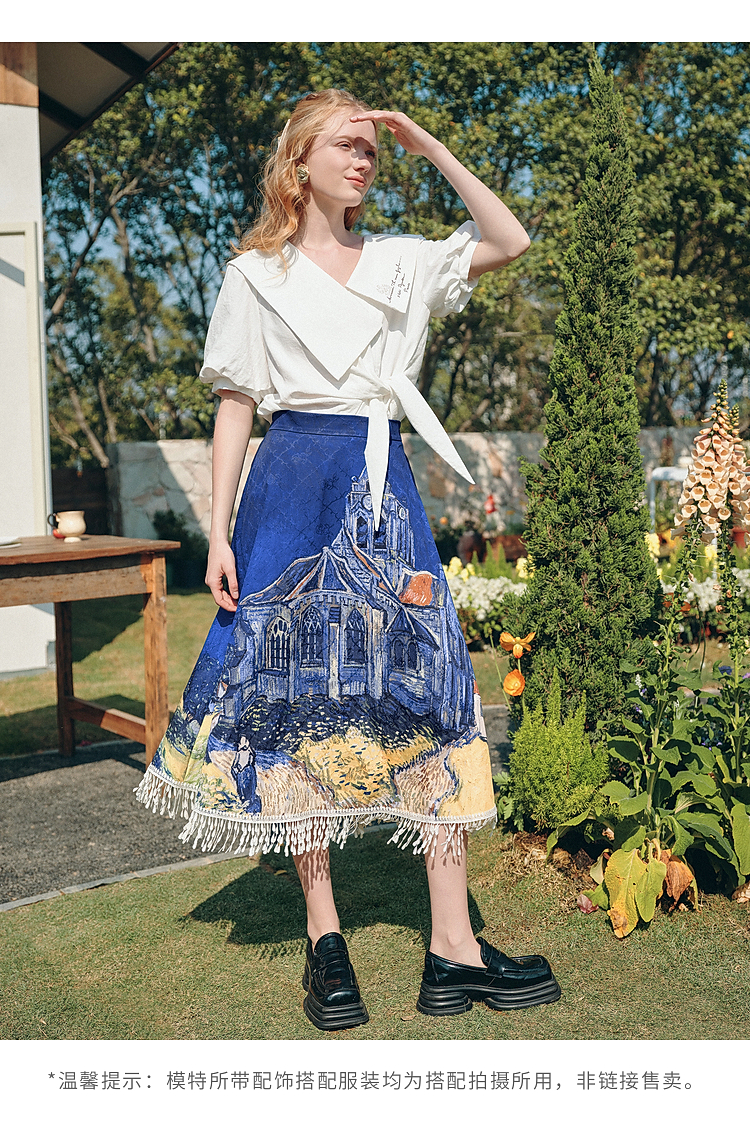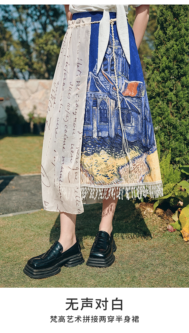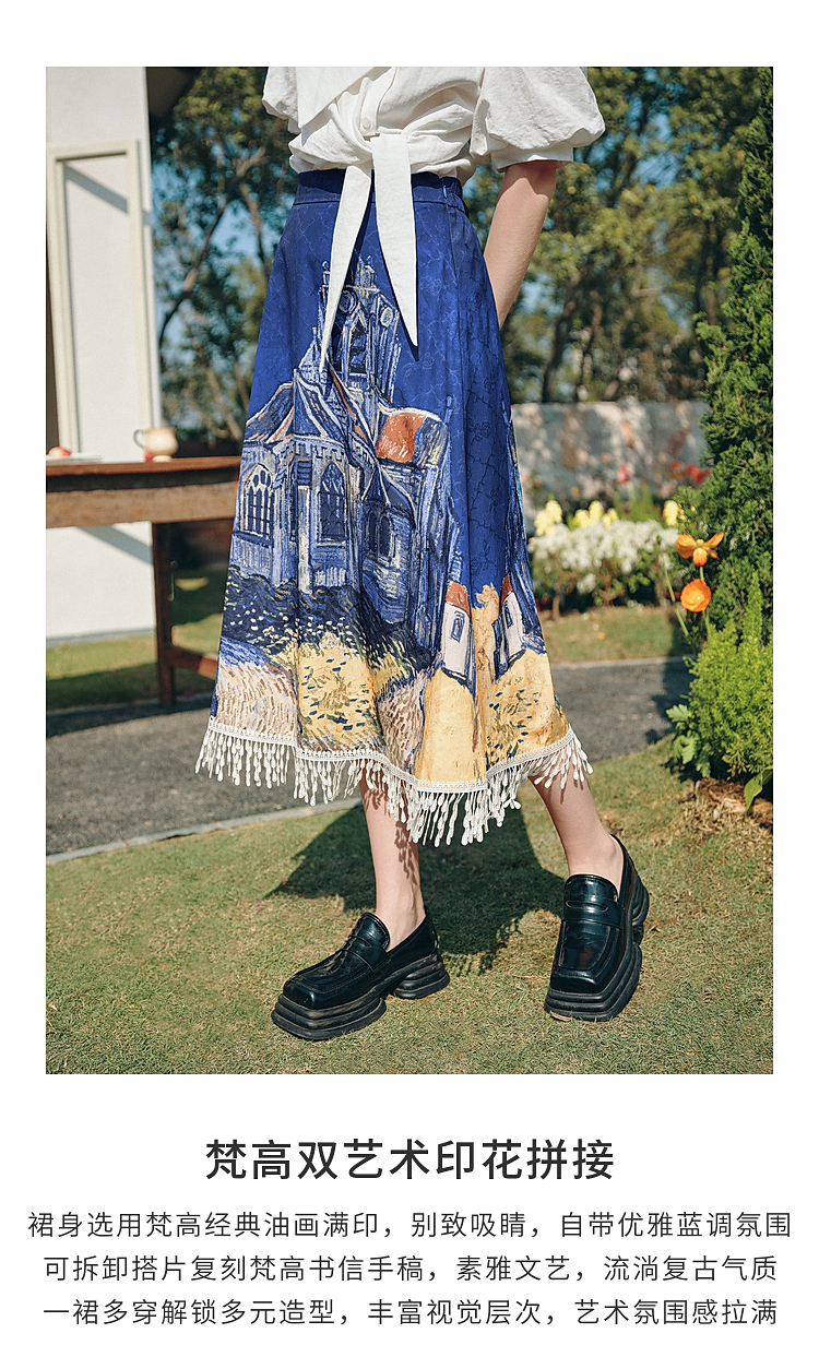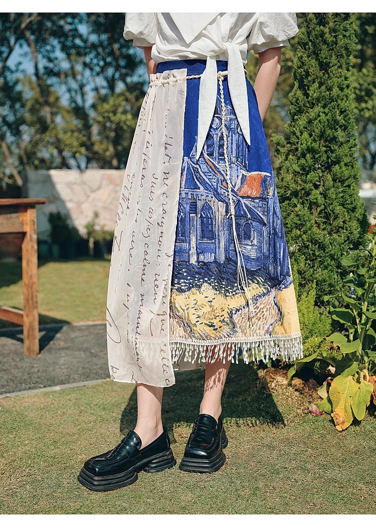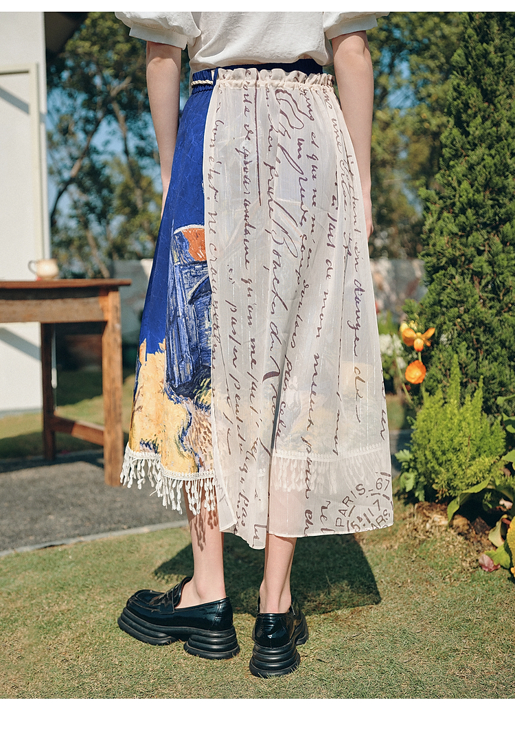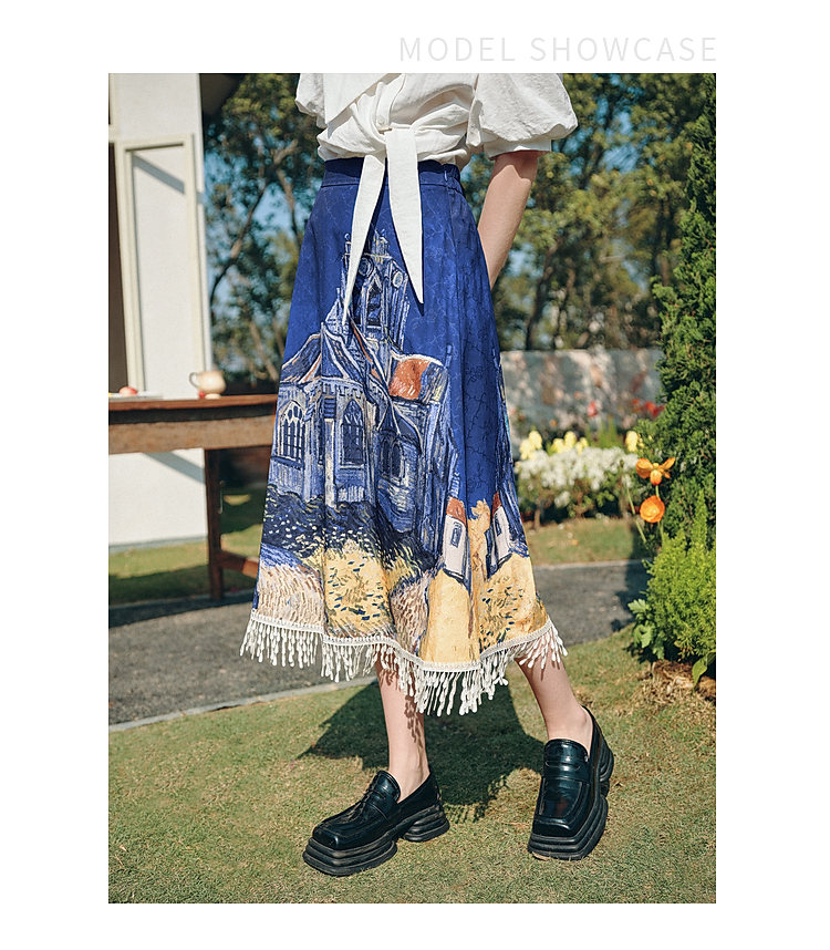 两三事梵高文艺 无声对白 2026春季新款可拆搭片流苏印花半身裙