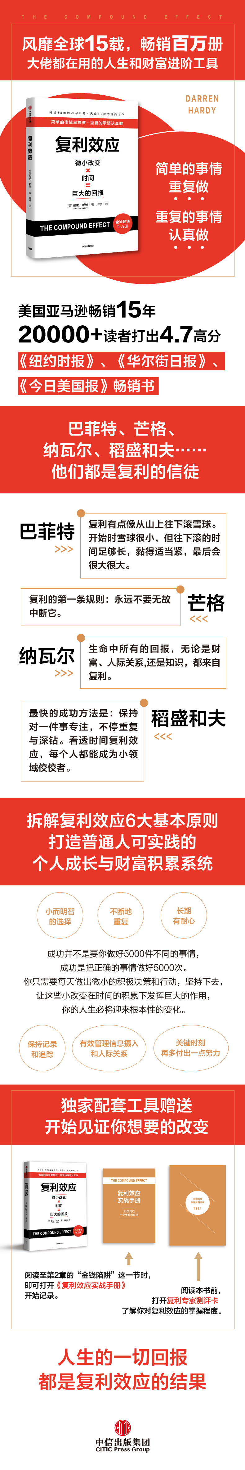 成功并不是要你做好5000件不同的事情,成功是把正确的事情做好5000次。这就是复利效应的力量。《复利效应》源于作者一项持续25年的跟踪研究,在帮助成千上万的人改变了他们的人生后,他总结了一套普通人可实践的个人成长与财富积累系统,让你在生活的各个方面实现积极的改变,积累财富,提升自我,终迈向你一直渴望的人生。