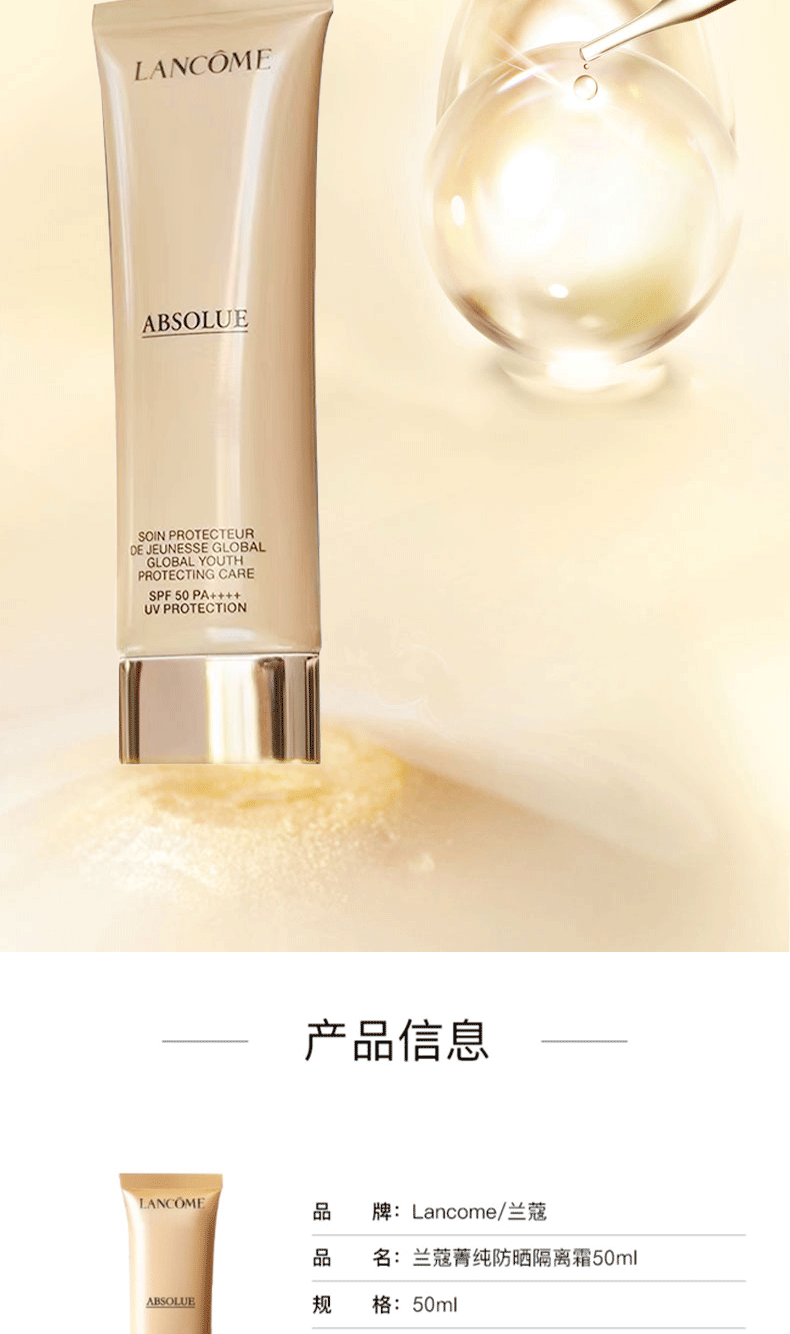 【品牌】:Lancome/兰蔻【商品名称】:【顺丰直发】LANCOME/兰蔻菁纯防晒霜50ml【规格】:50ML*1 50ML*2【产地】:法国【批号/限用日期】:有效期: 2028-09【注意!!!】批次更新较快,具体以实收批次日期为准【保质期】:三年【包装方式】:盒装【版本】:国际版【快递】:【运费标准】:全国包邮,新疆西藏不发货【发货地】:【发货时效】:72小时【售后标准】:非质量问题退货需客户承担订单发出运费及订单税费,不支持七天无理由退换