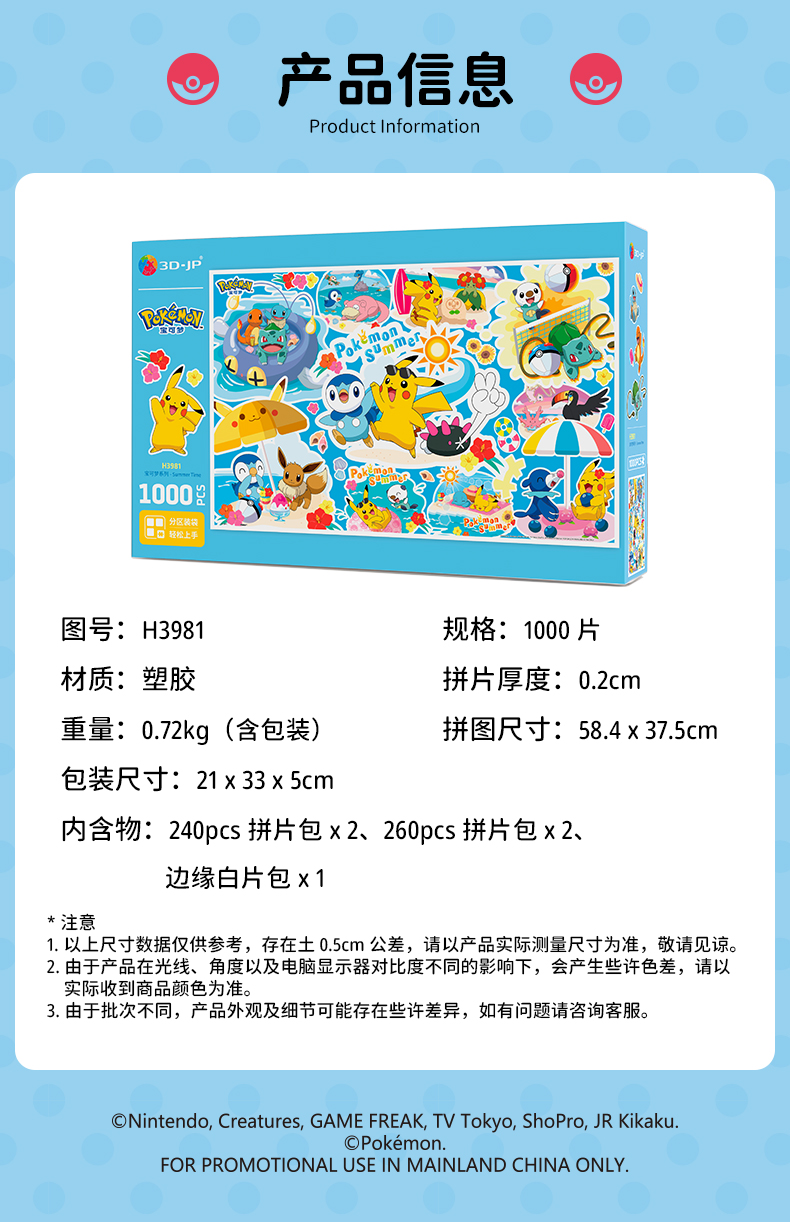 1000片 平面塑料拼图 H3981 宝可梦系列-Summer Time