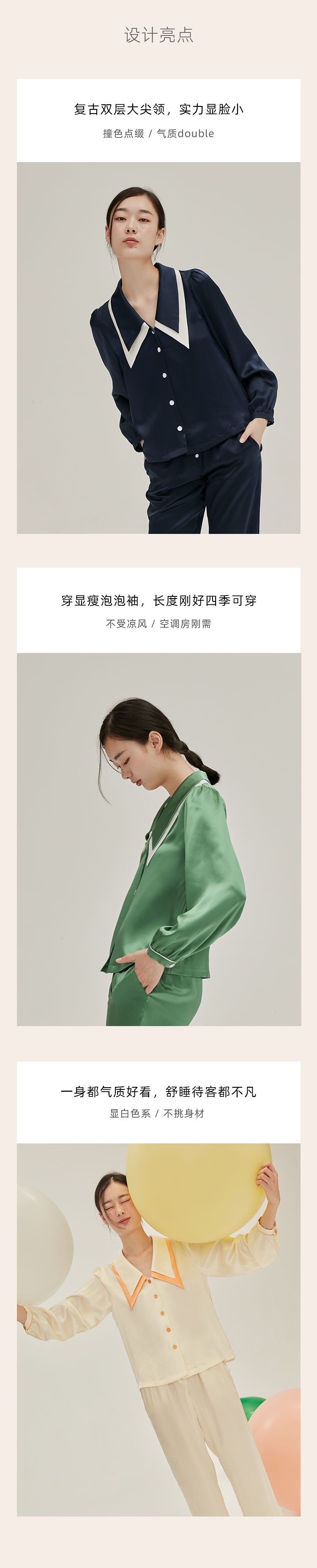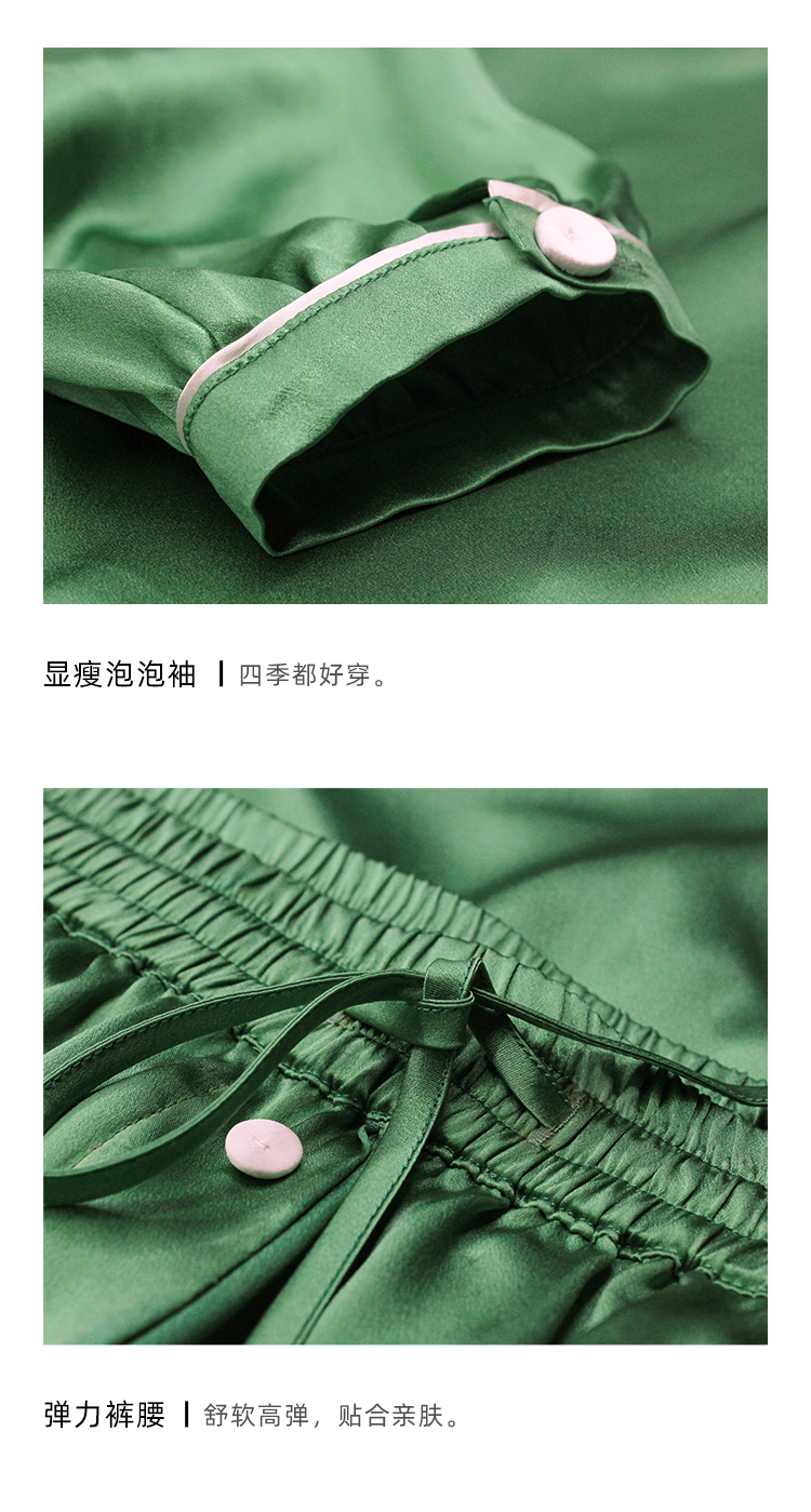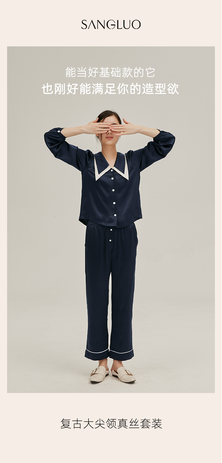 SANGLUO法式尖领泡泡袖19姆米真丝睡衣睡裤套装女桑蚕丝家居服可外穿
