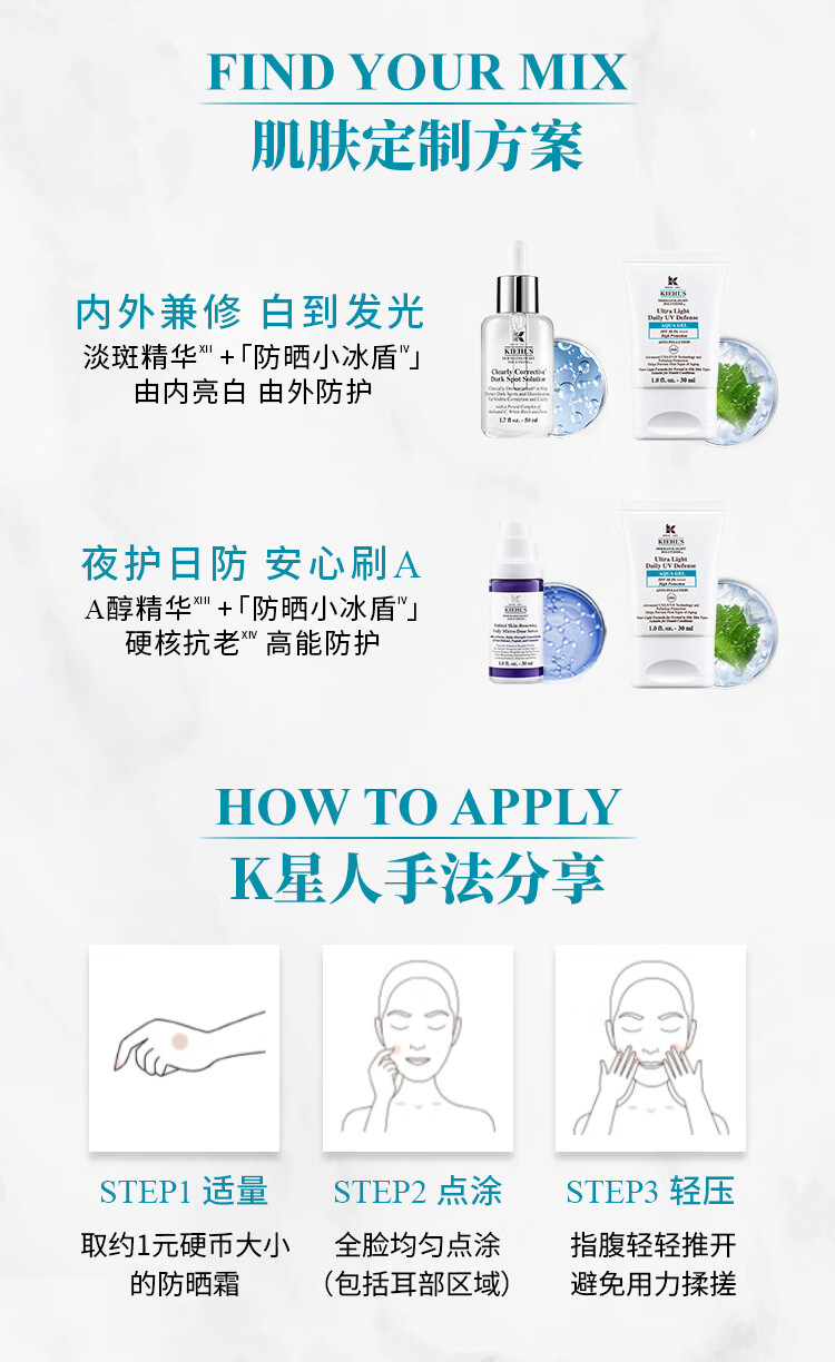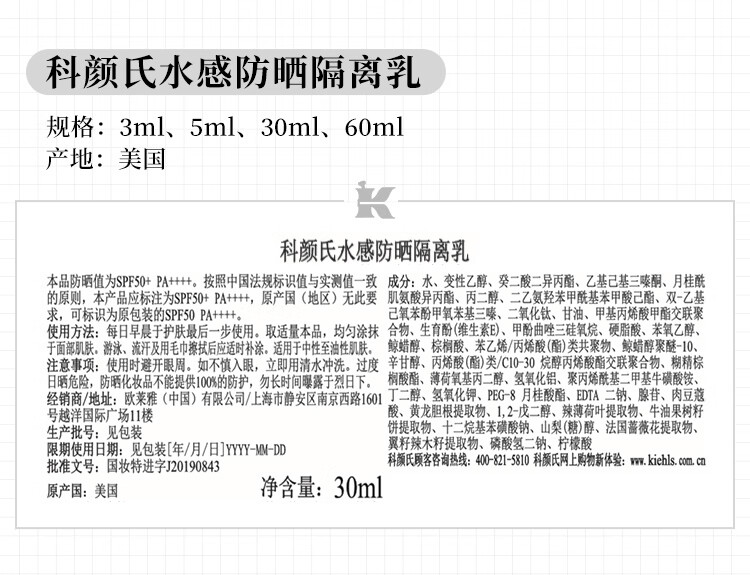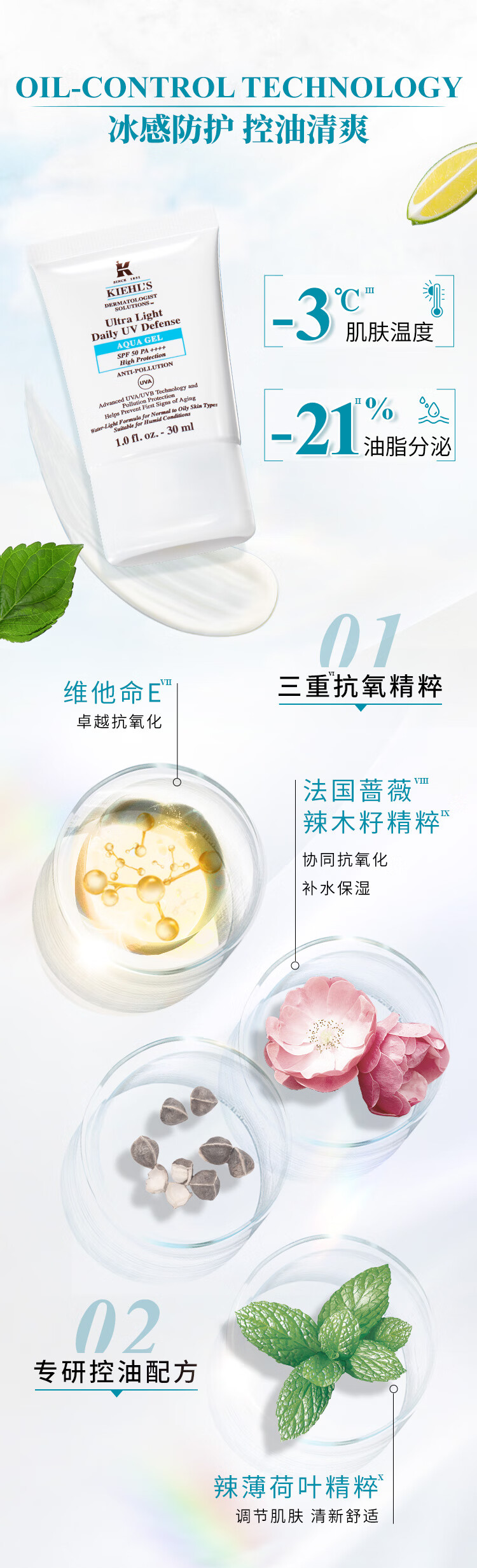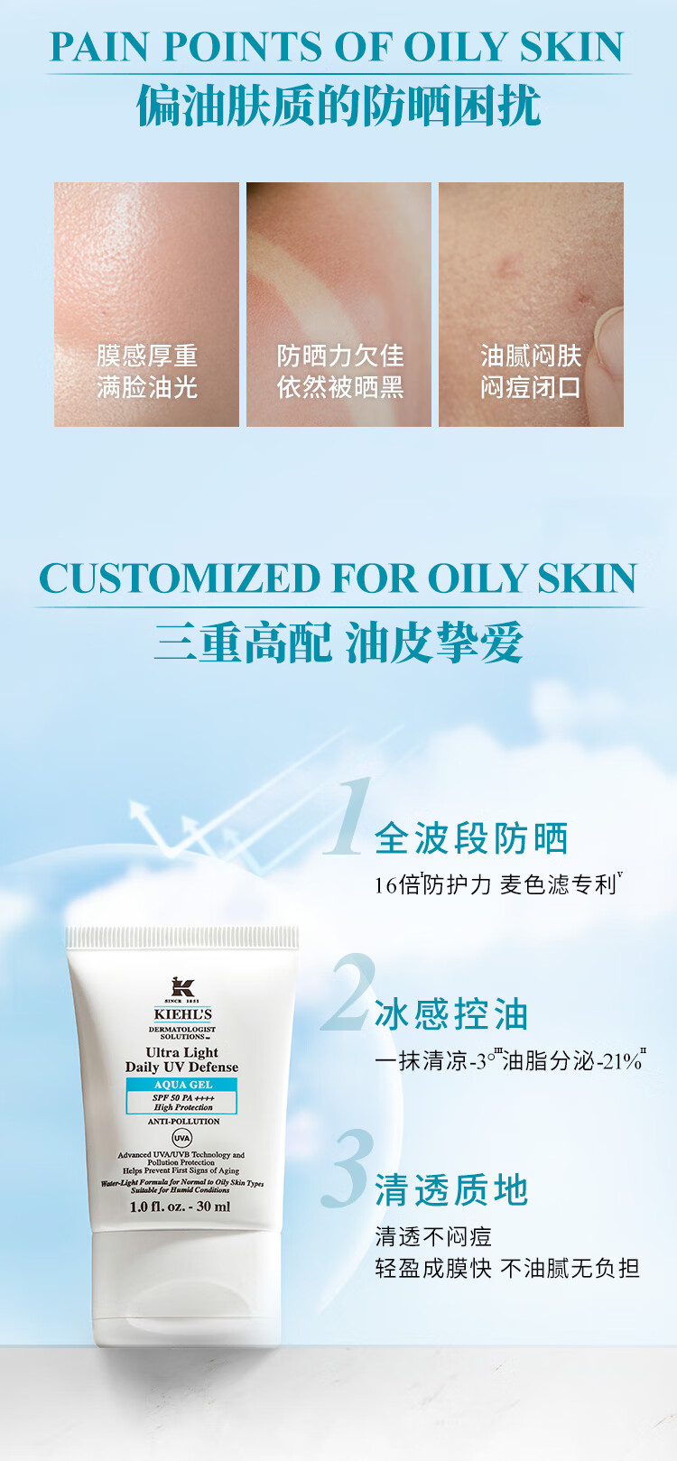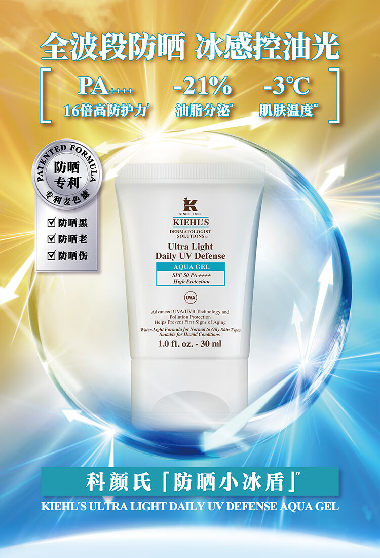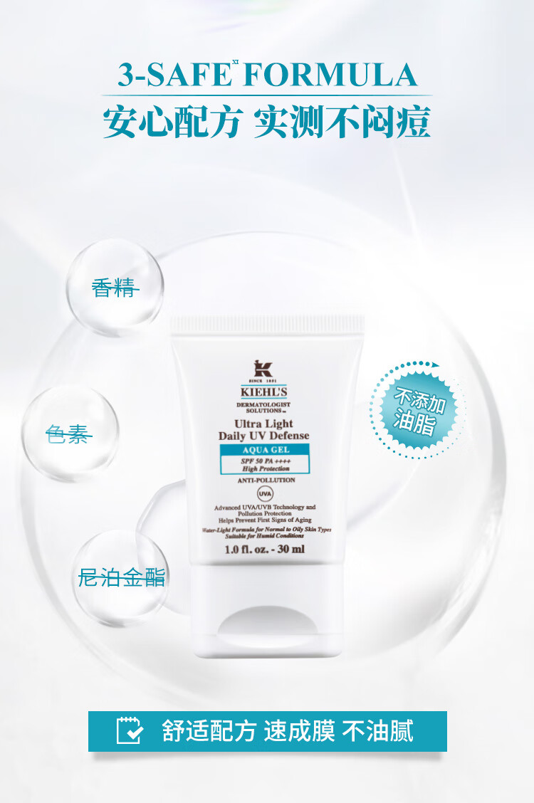 科颜氏(Kiehl's)水感防晒乳30ml 小冰盾油皮隔离控油护肤品 生日礼物女送爱人 心选到家