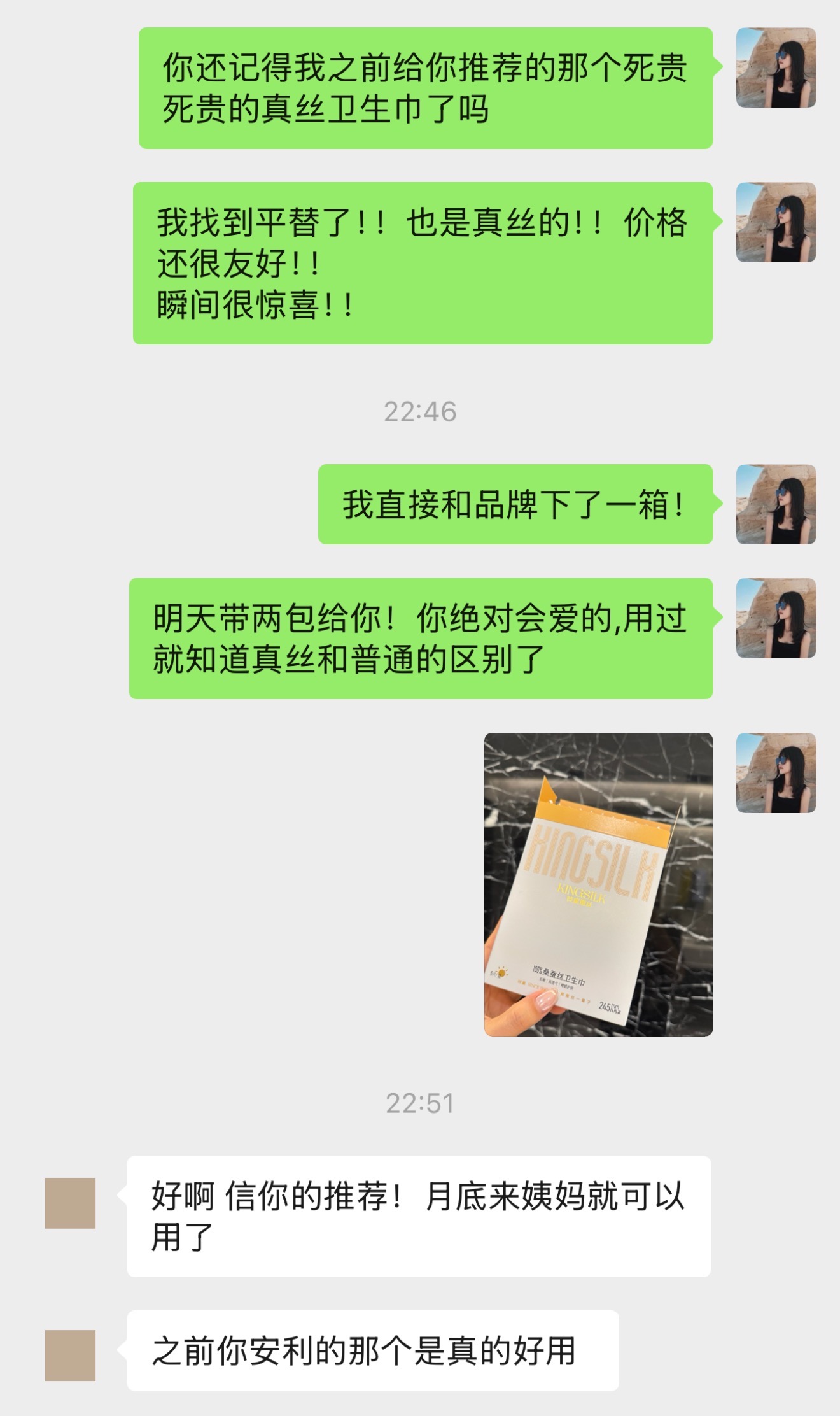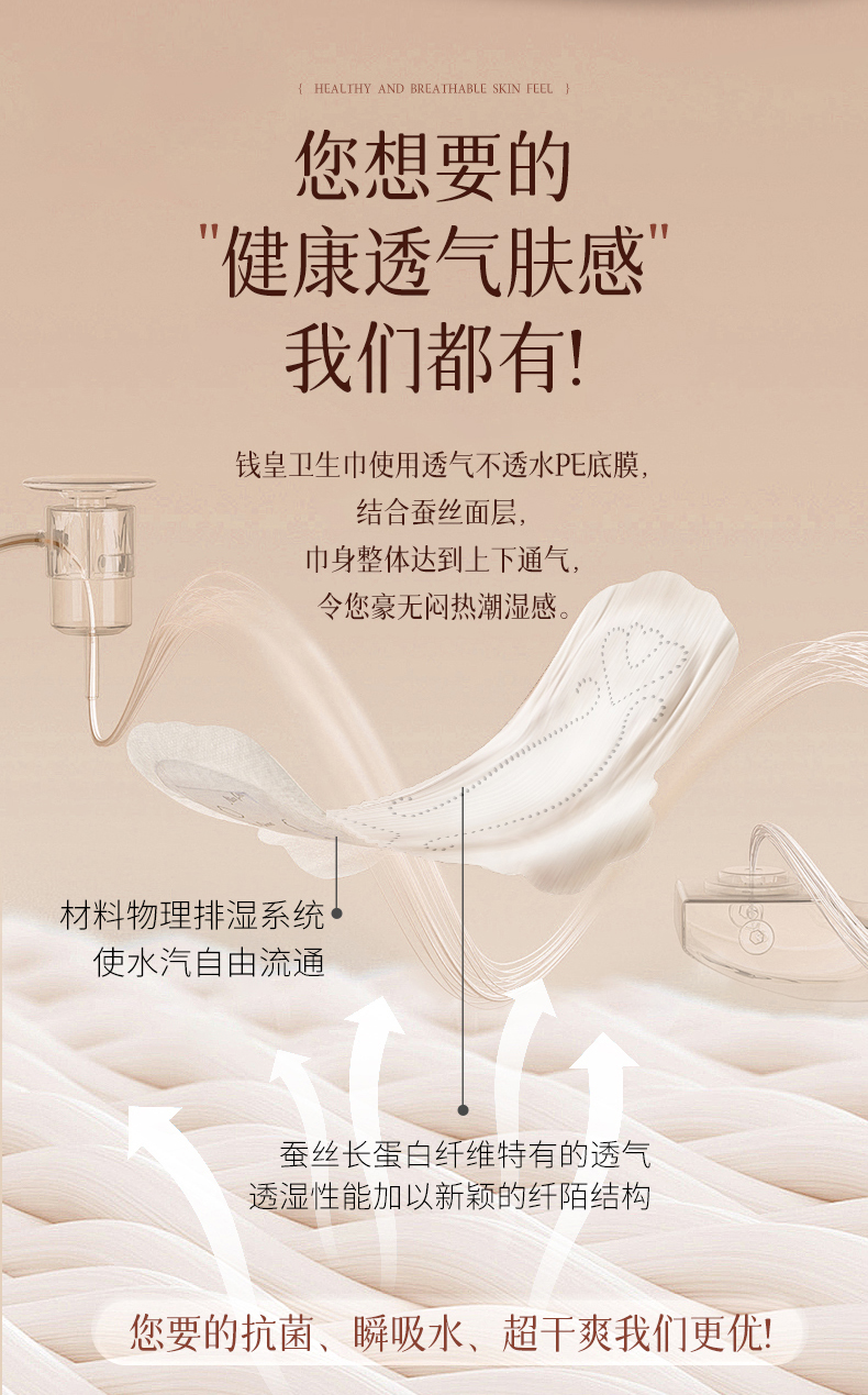 2. 夏日经期闷热黏腻?这款桑蚕丝卫生巾帮你解决。蚕丝独特的多孔结构,透气性能远超普通材质,时刻保持清爽。用它,给私处自由呼吸的空间,经期不再是煎熬。