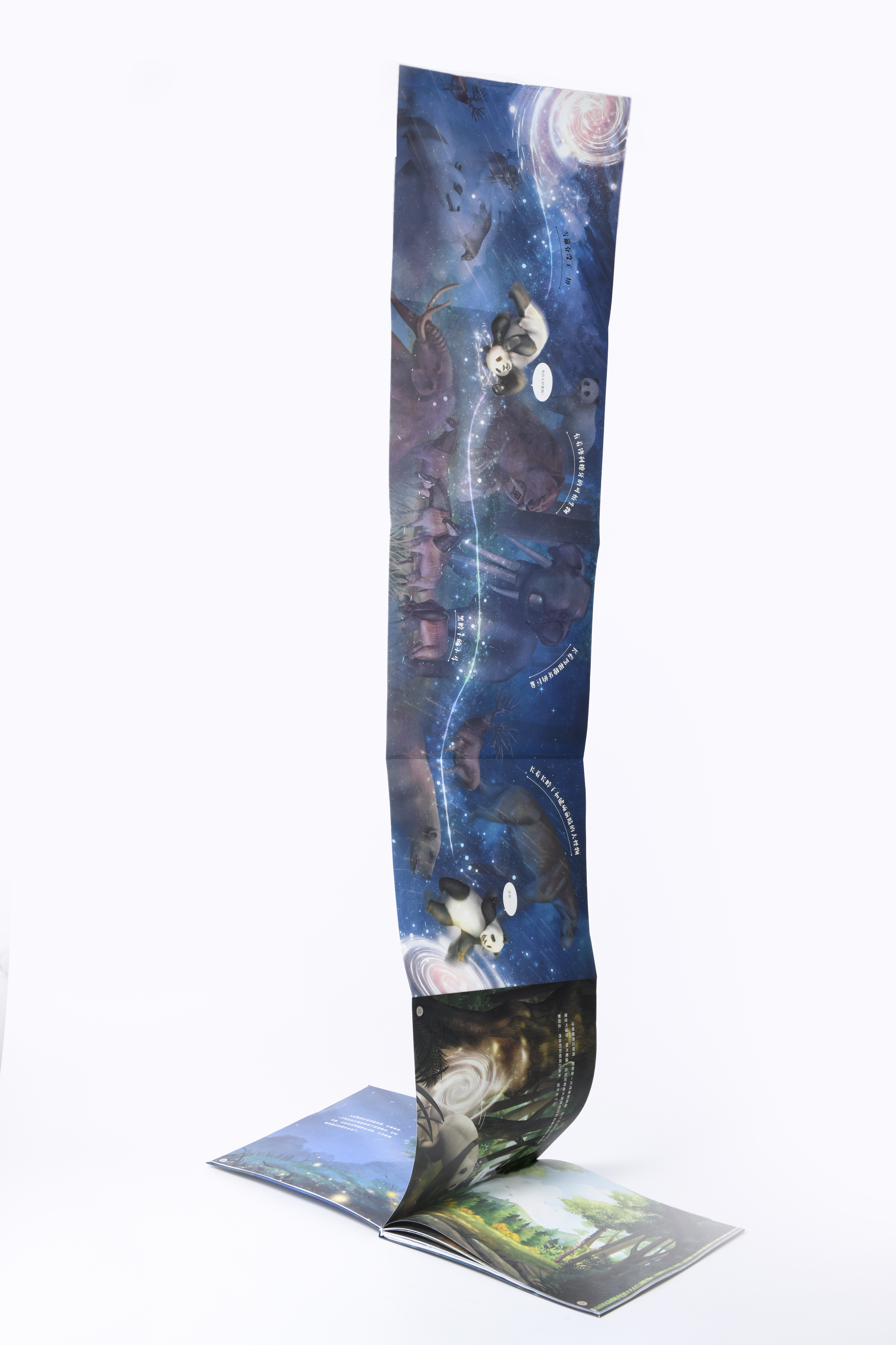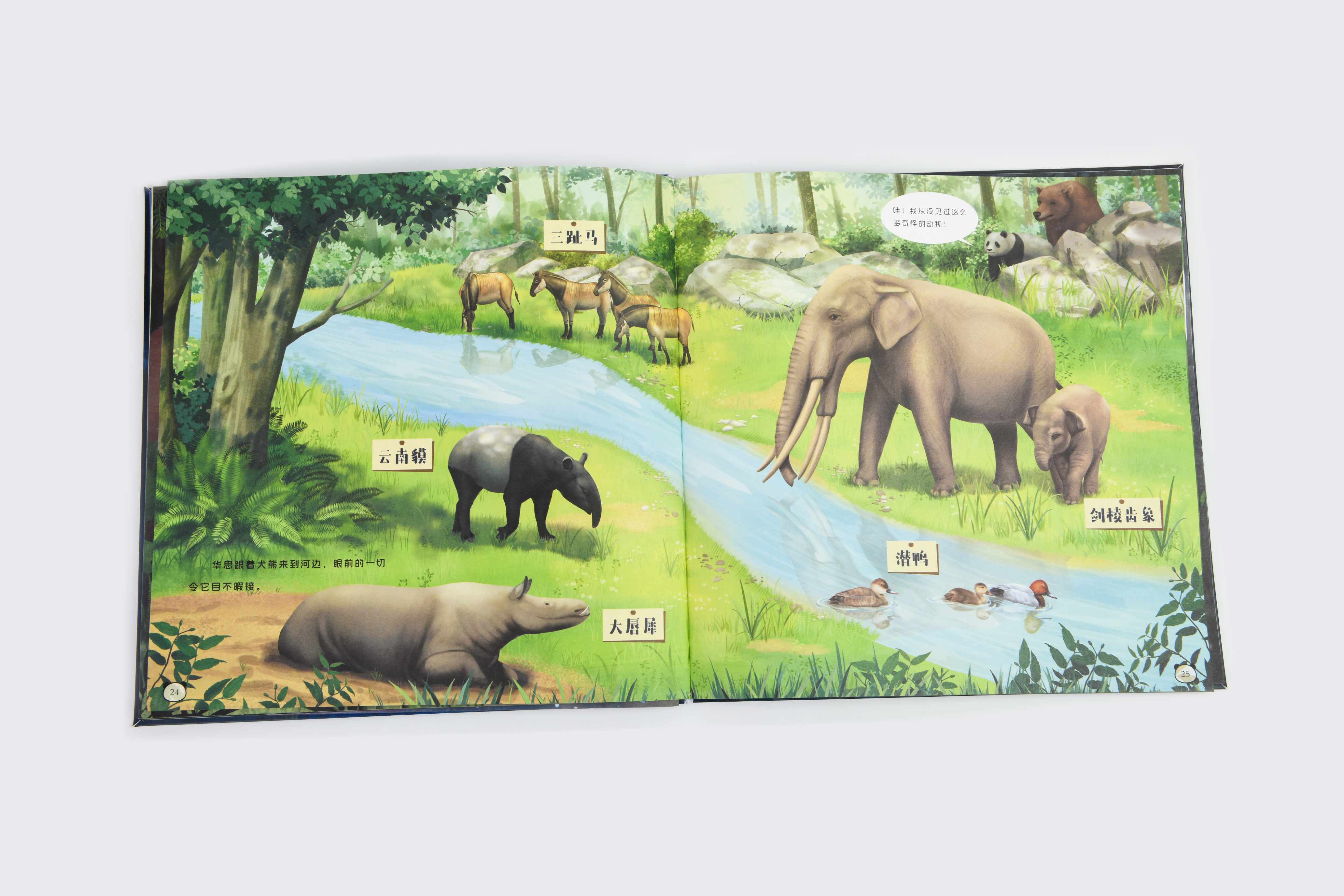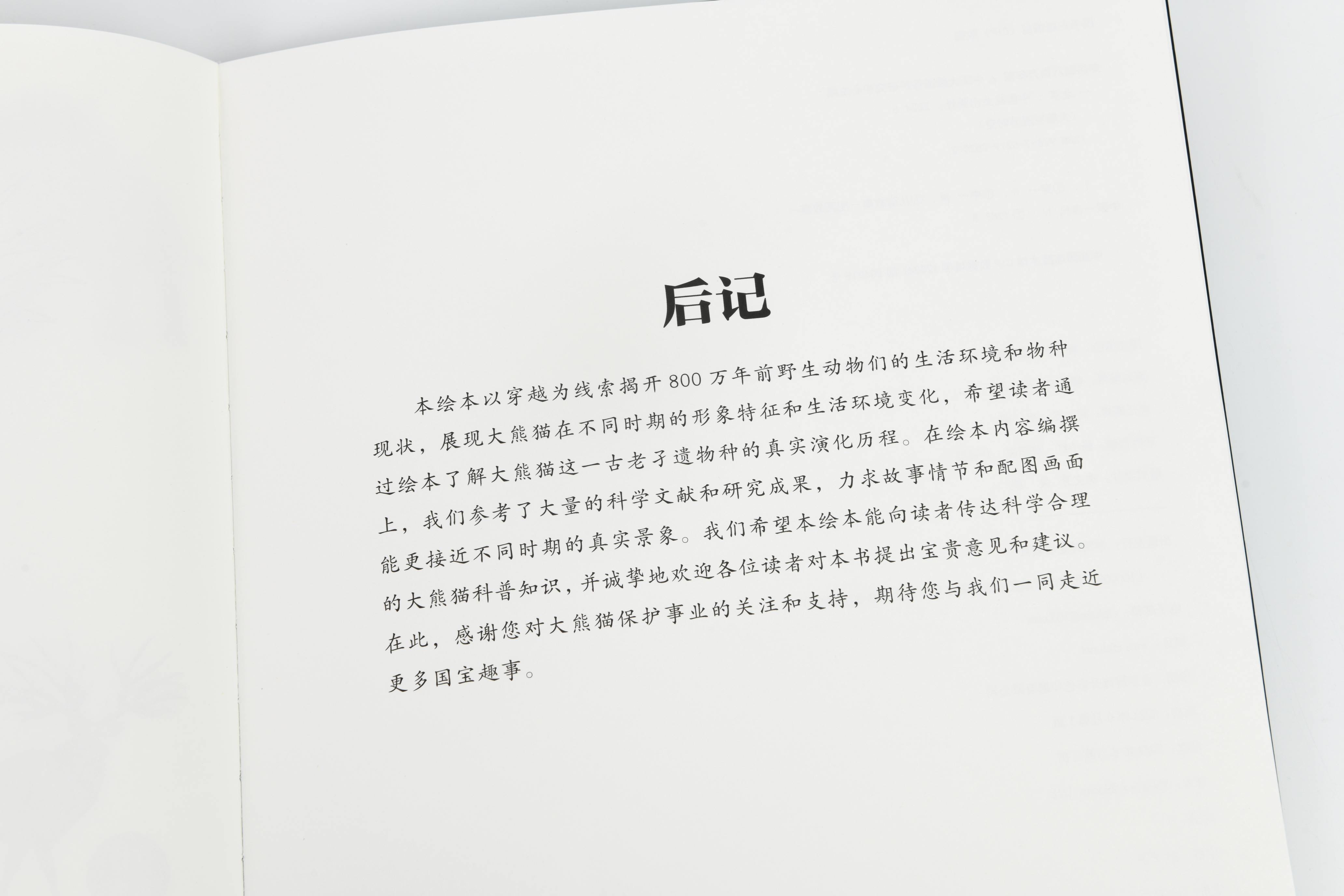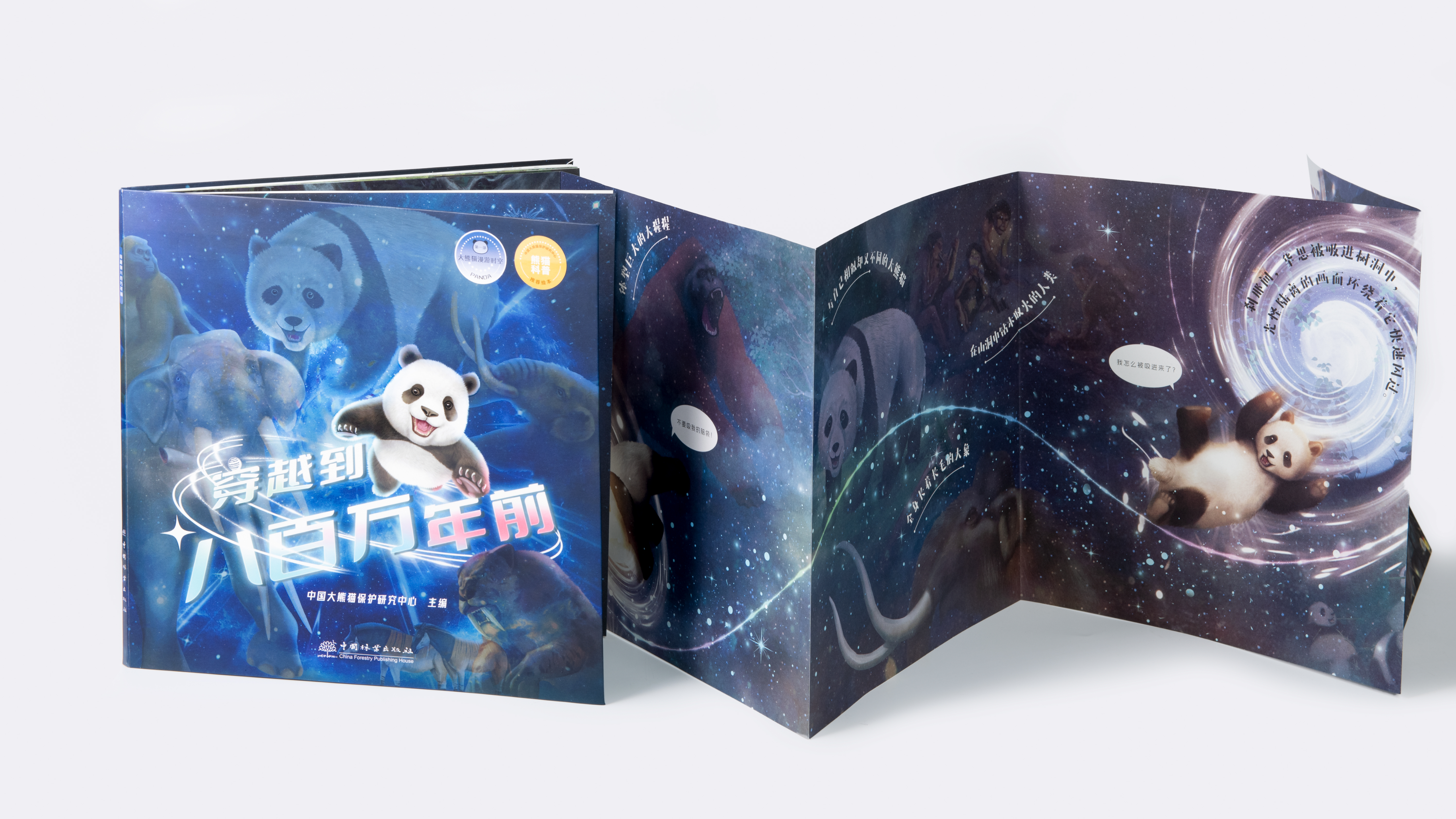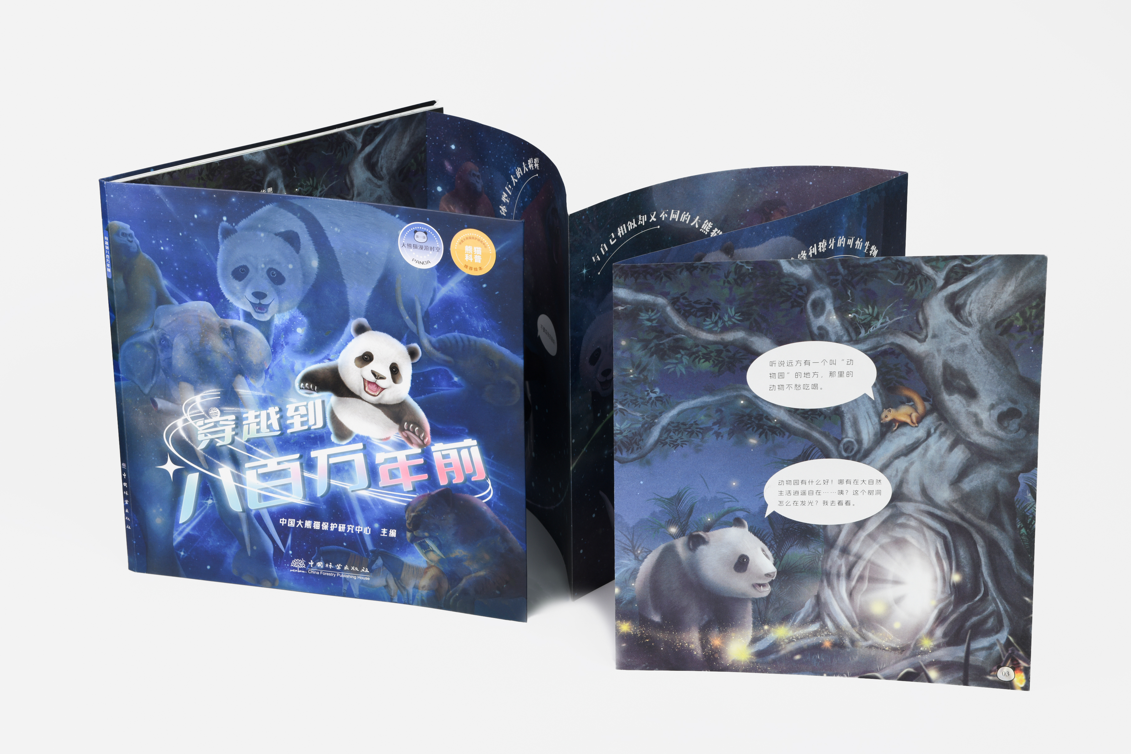 《穿越到八百万年前》讲述了大熊猫华思无意间跌进神秘的月光树洞,回到了过去,遇到了生活在800万年前的大熊猫祖先——始熊猫,同时卷入了史前动物犬熊的阴谋中。在旅途中,华思不仅了解到大熊猫家族的起源及演变,还亲历了史前气候的巨大变化,最后成功与大熊猫祖先—一小种大熊猫起打败了犬熊。绘本通过对开页的画面和超过1米的拉页为小读者带来一场史前的视觉盛宴。翻开《穿越到八百万年前》,跟随华思的脚步,穿过令人目眩的时空隧道,了解史前动物的形象特征,和大熊猫一起与犬熊的斗智斗勇,了解第四纪大冰期对动物种群的无情冲击,以及大熊猫种群从食肉到食草的种群“生存智慧”。华思的穿越系列图书还有后续……