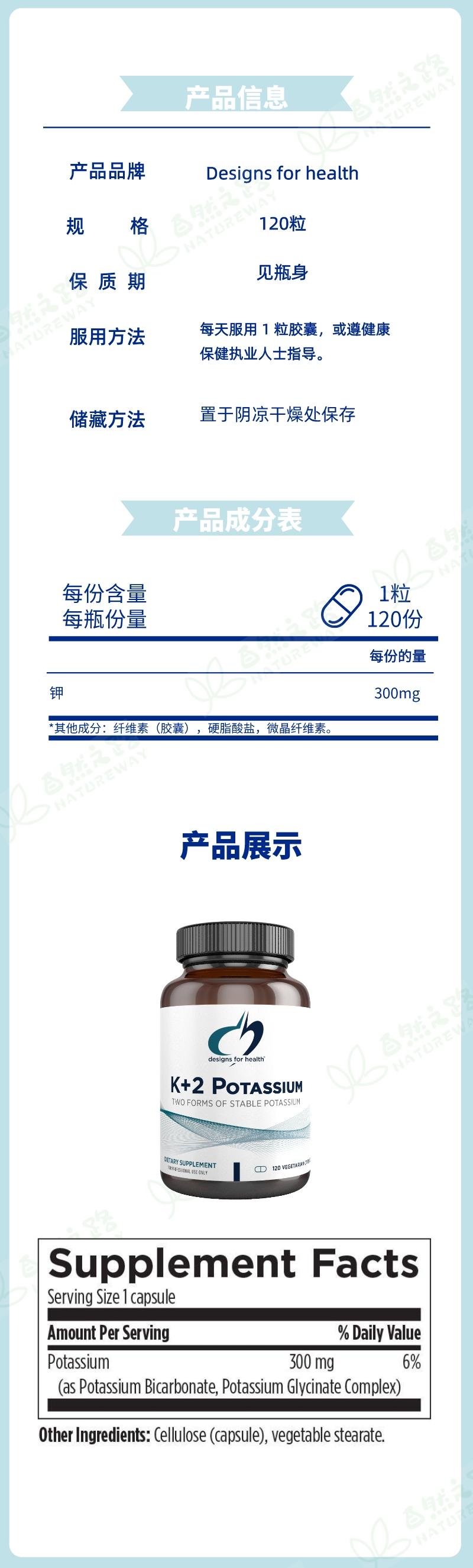 美国Designs for health健康设计 k+2 Potassium复合维生素 钾胶囊 120粒