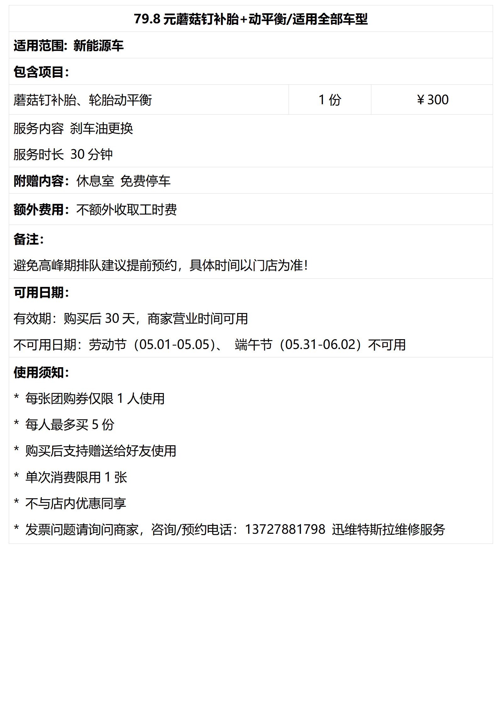 【珠光汽车】新能源车79.8元【蘑菇钉补胎+动平衡】