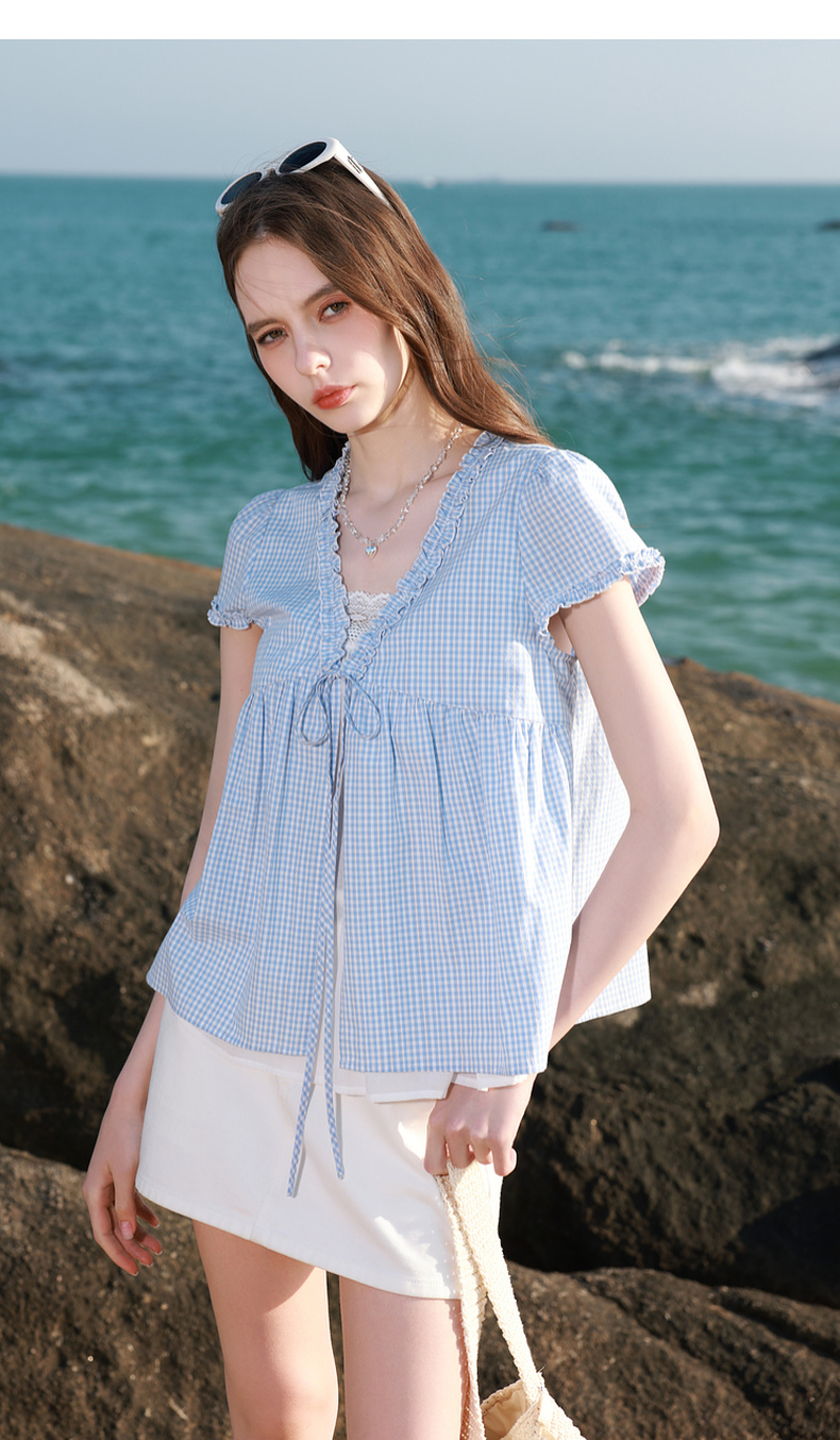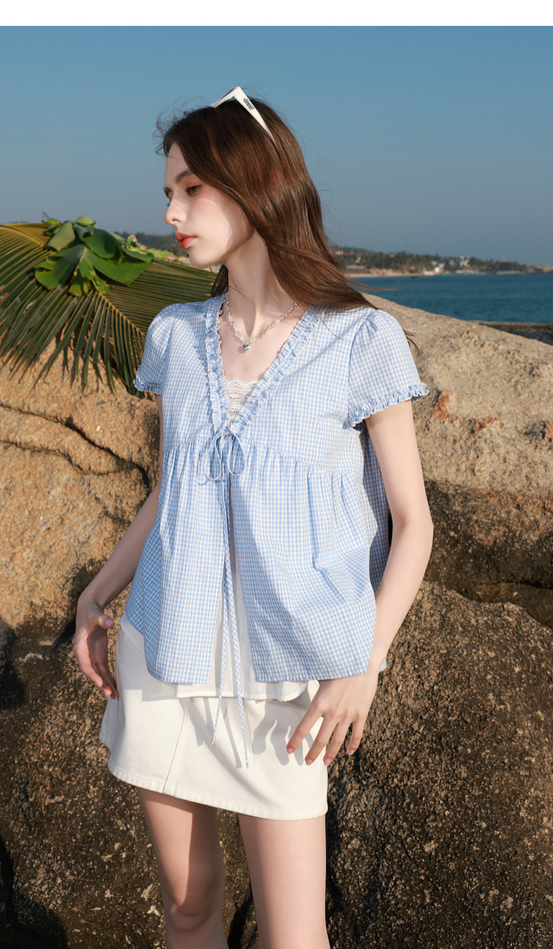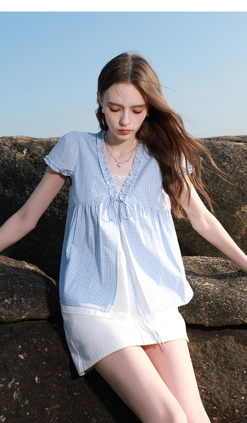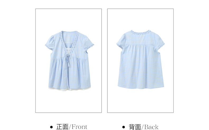 【100棉】三彩2026春季新款假两件V领格子小衫衬衣宽松娃娃衫M