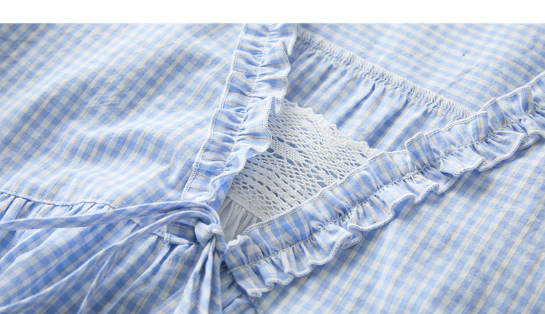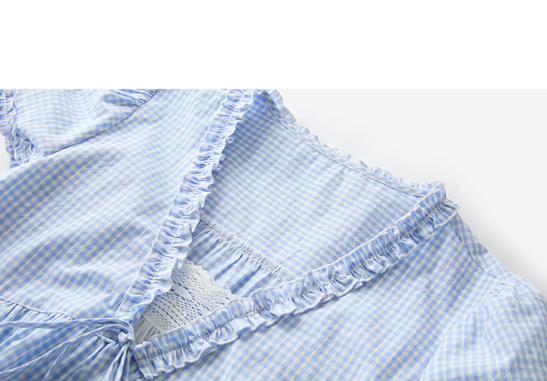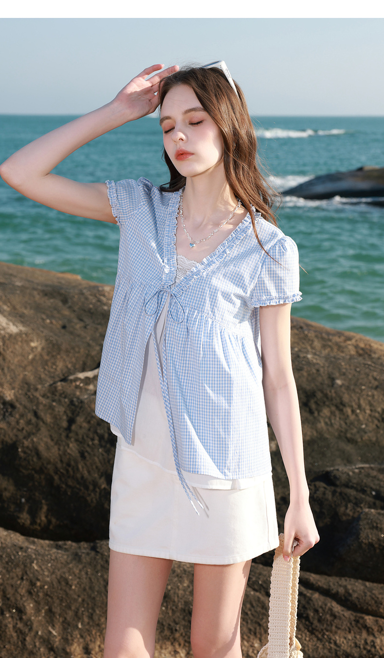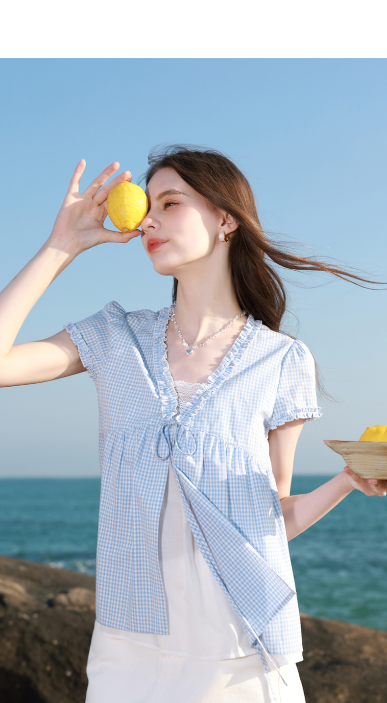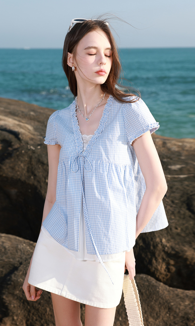 【100棉】三彩2026春季新款假两件V领格子小衫衬衣宽松娃娃衫M
