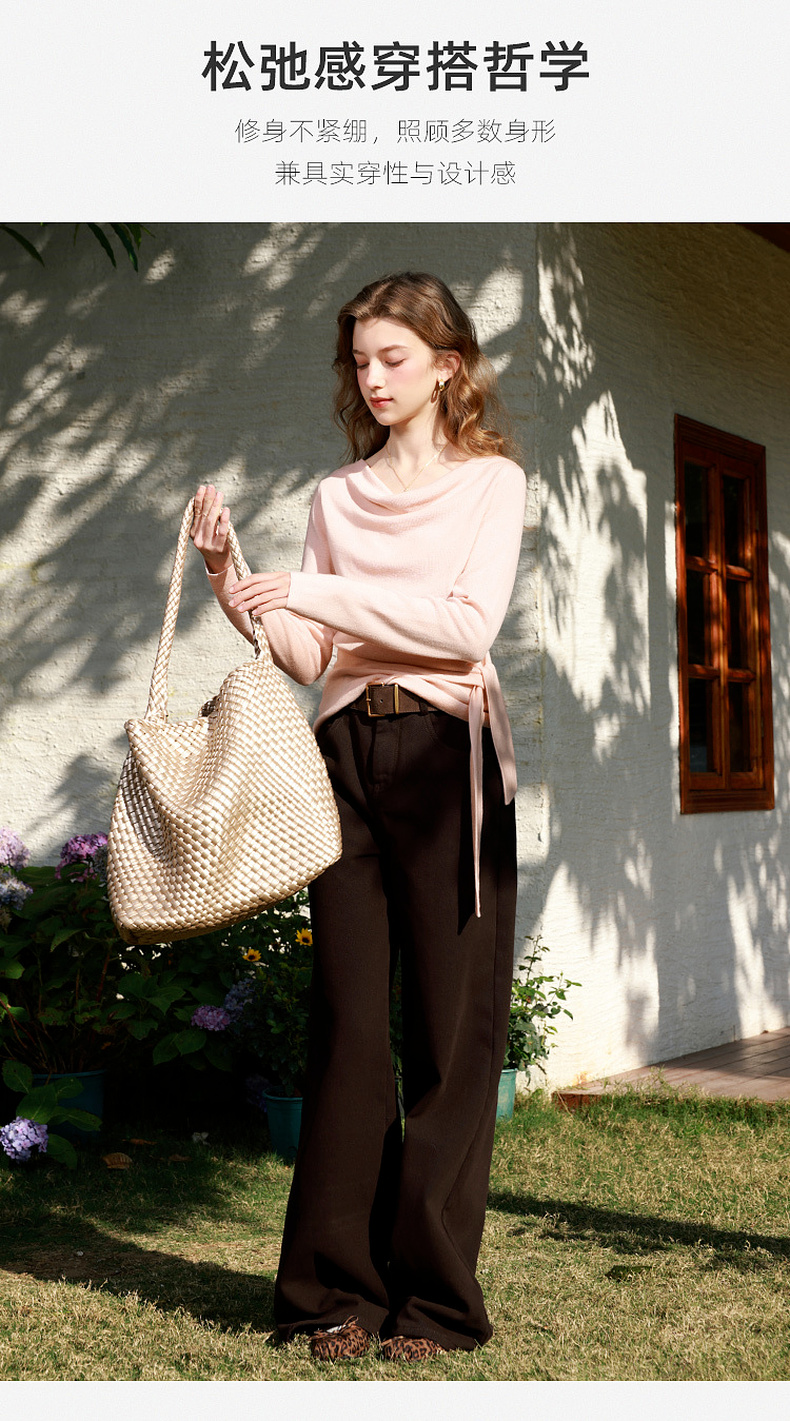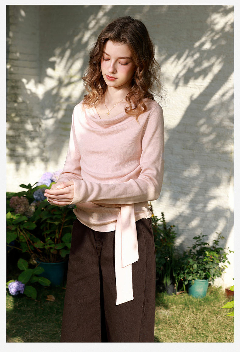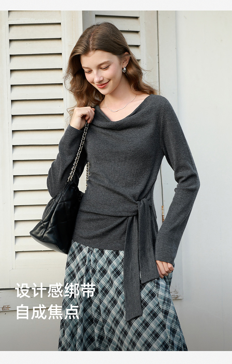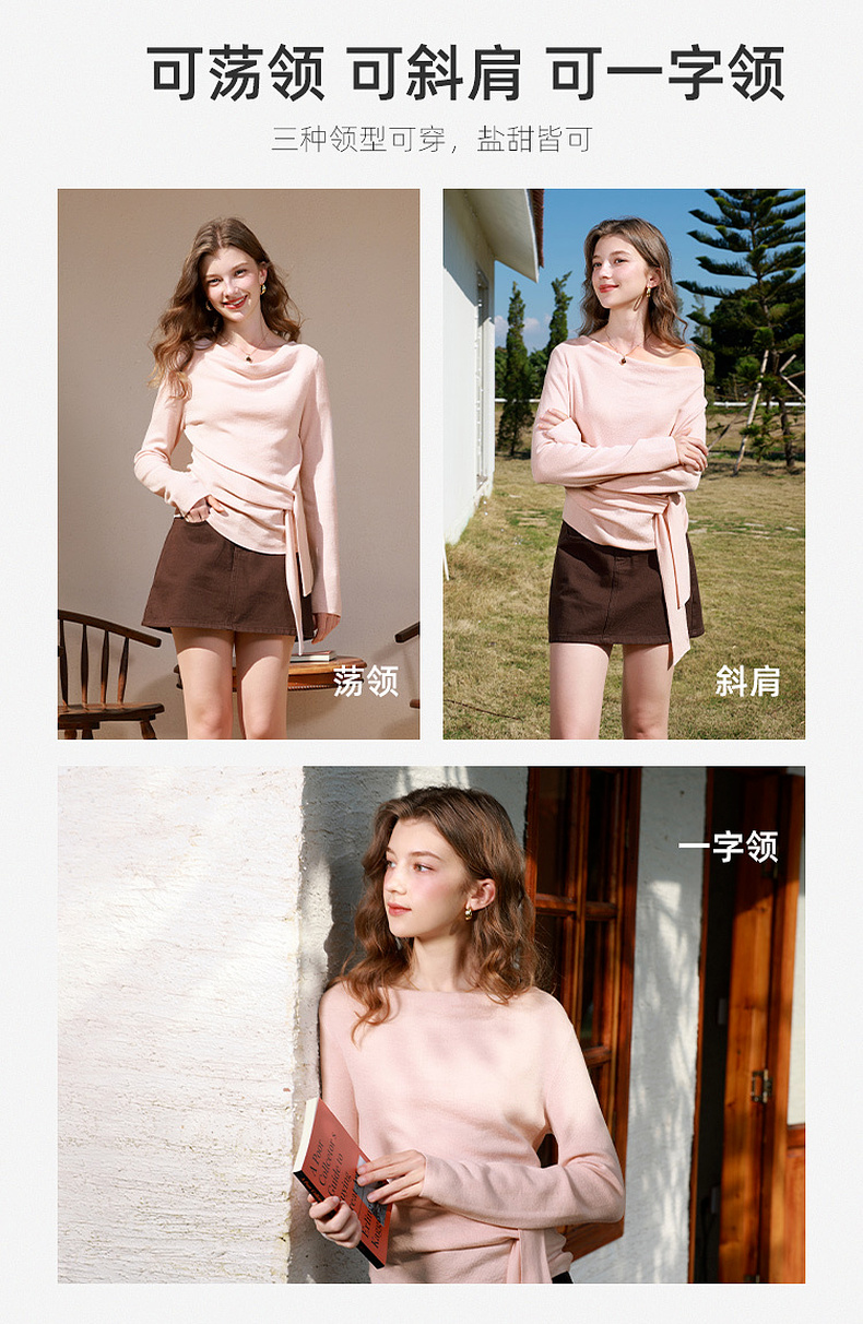 三彩2026春季新款荡领针织衫绑带毛衫修身长袖套头衫优雅M