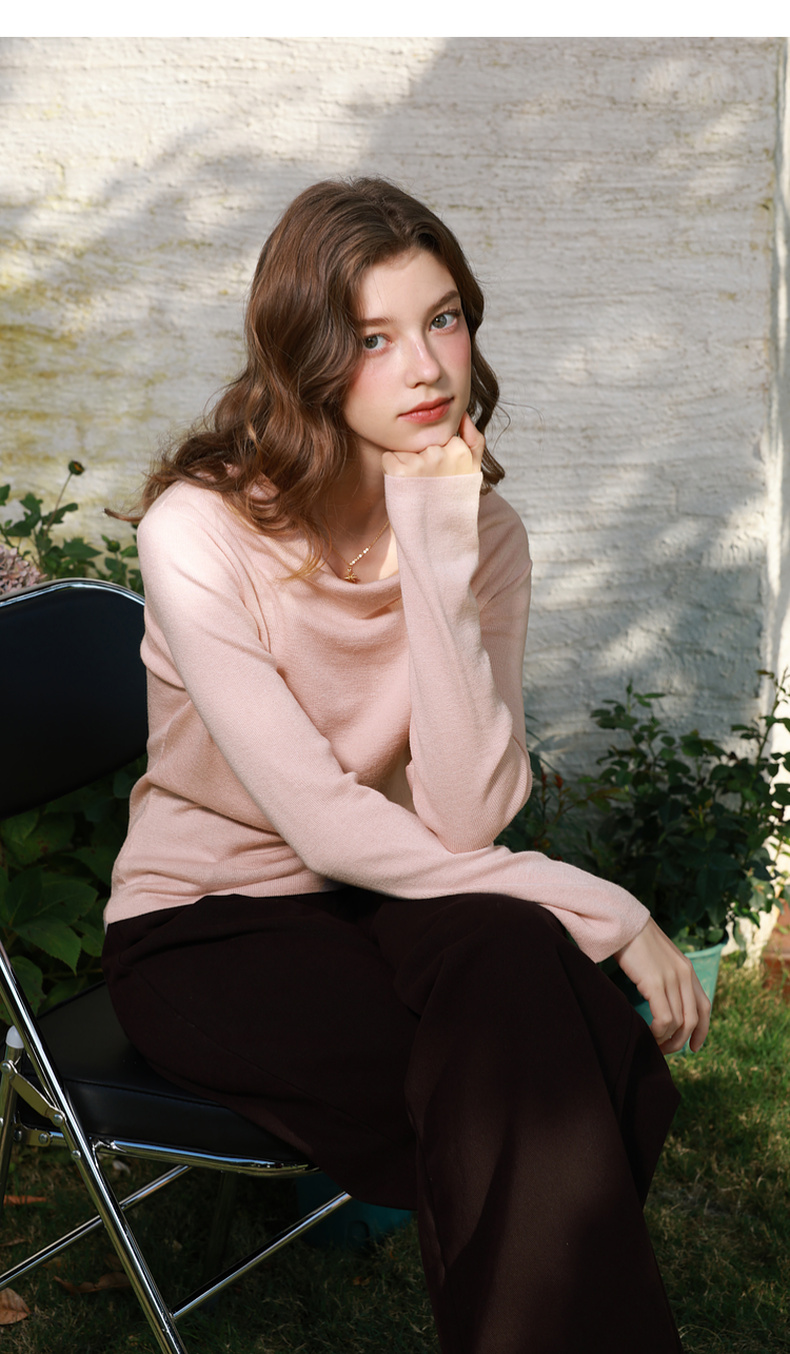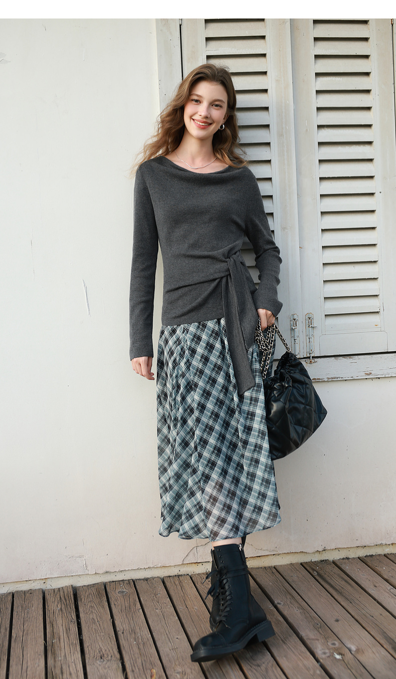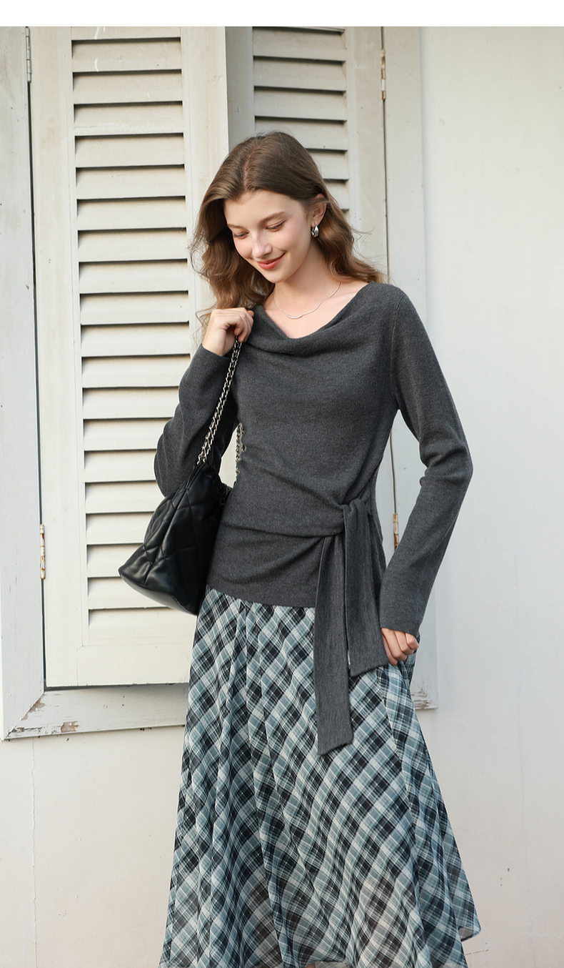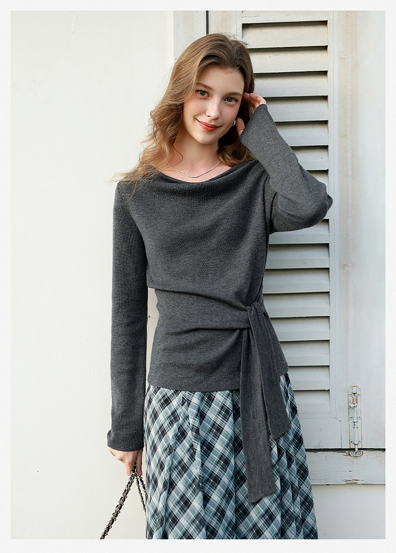 三彩2026春季新款荡领针织衫绑带毛衫修身长袖套头衫优雅M