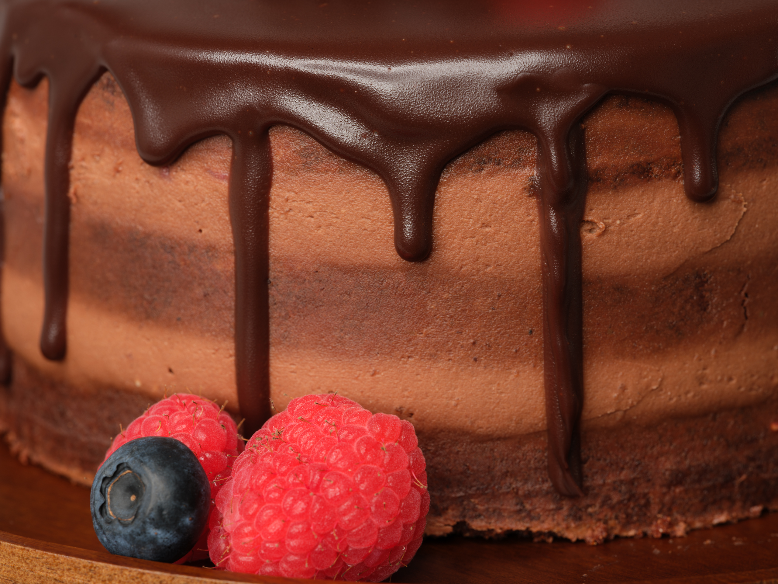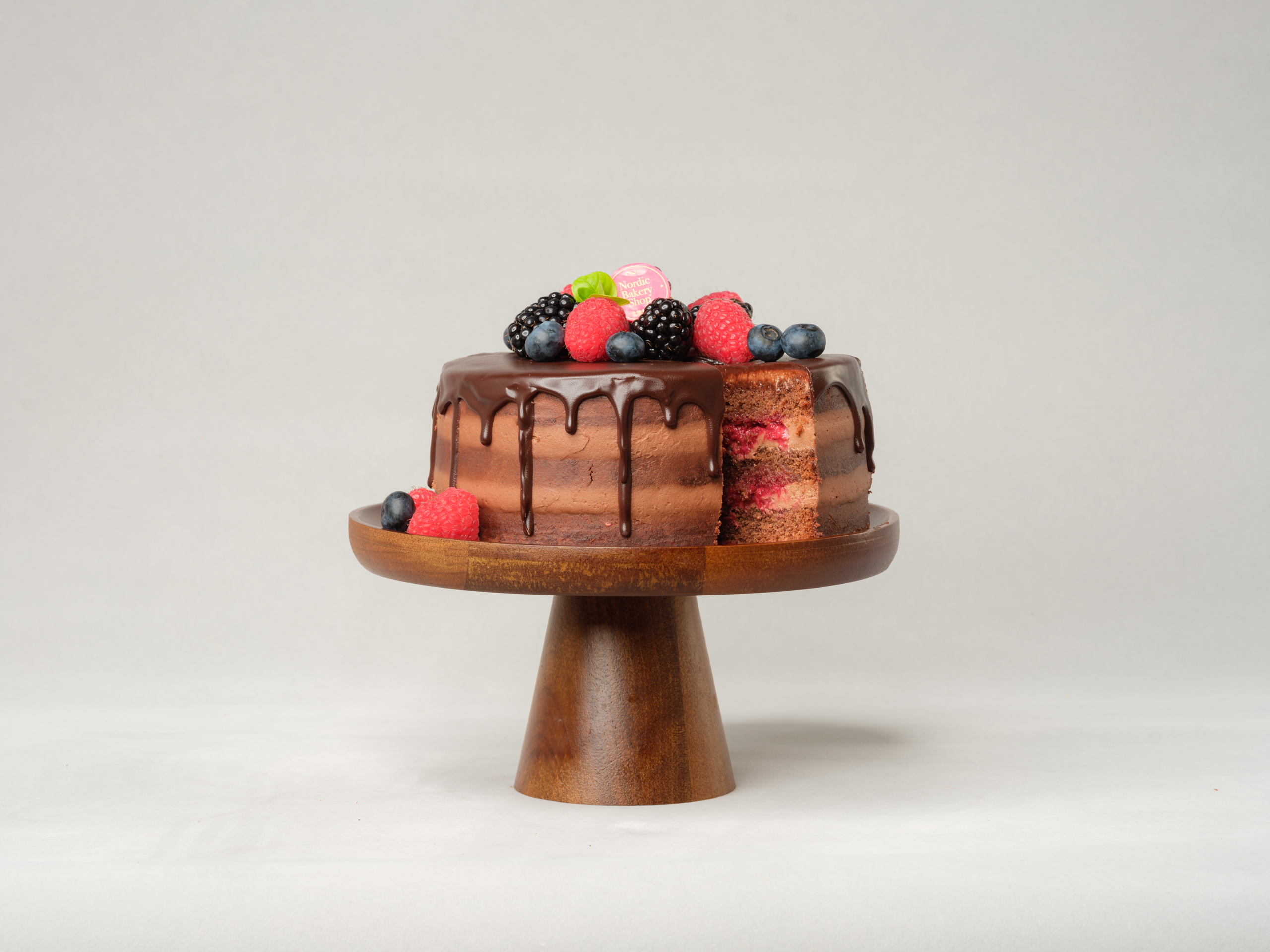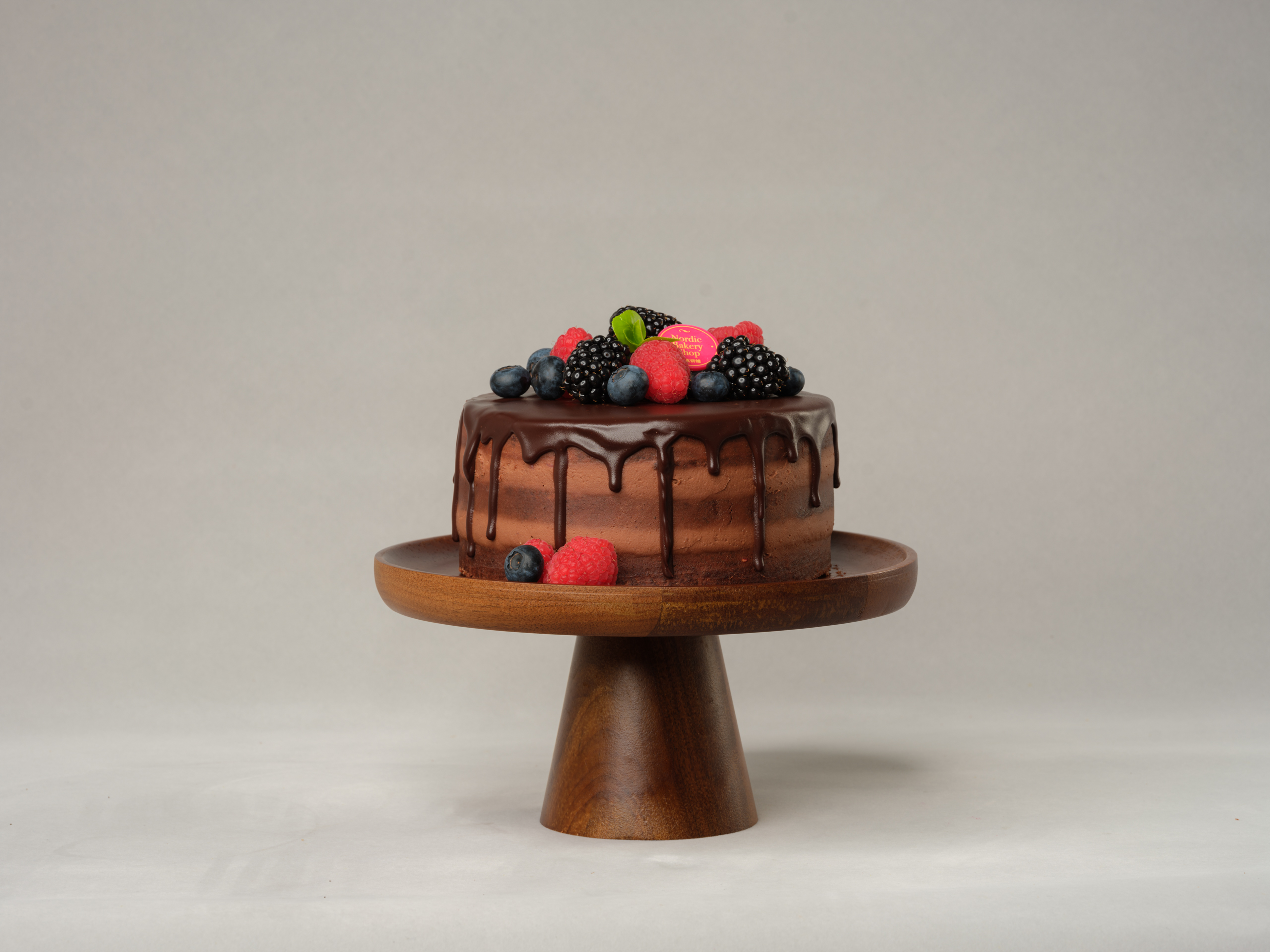 Sink your teeth into our Chocolate Berries Cake. A rich three-layer chocolate cake filled with chocolate cream cheese frosting and our homemade raspberry jam, topped with chocolate ganache and fresh berries, it's a sweet and tangy delight for the taste buds.