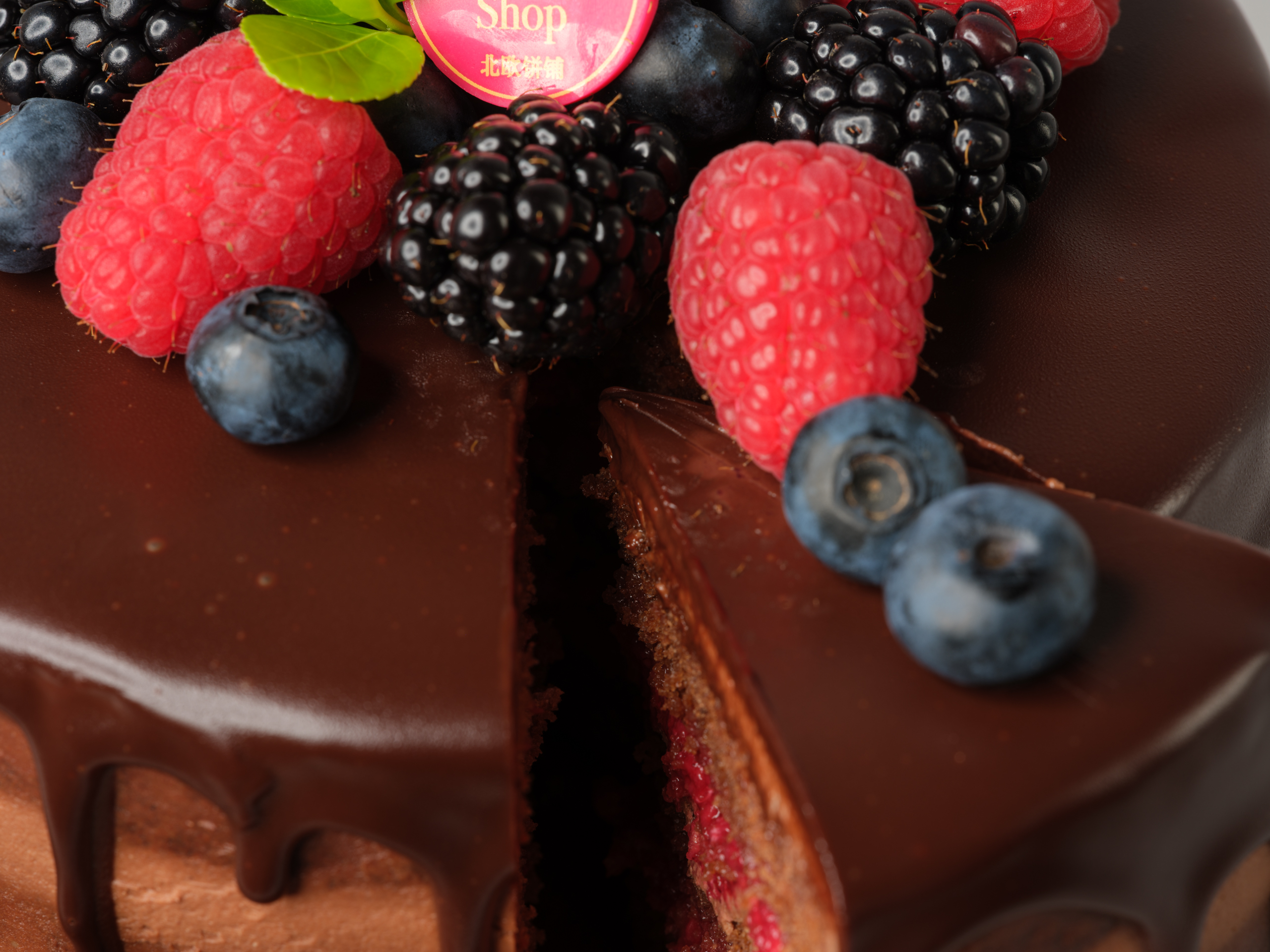 咬一口我们的巧克力莓果蛋糕。这是一款浓郁的三层巧克力蛋糕,夹着巧克力奶油芝士糖霜和我们自制的树莓果酱,顶部淋有巧克力甘纳许,还点缀着新鲜莓果,是一道能让味蕾享受甜蜜与酸甜滋味的美味甜点。