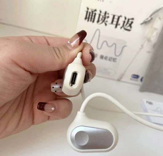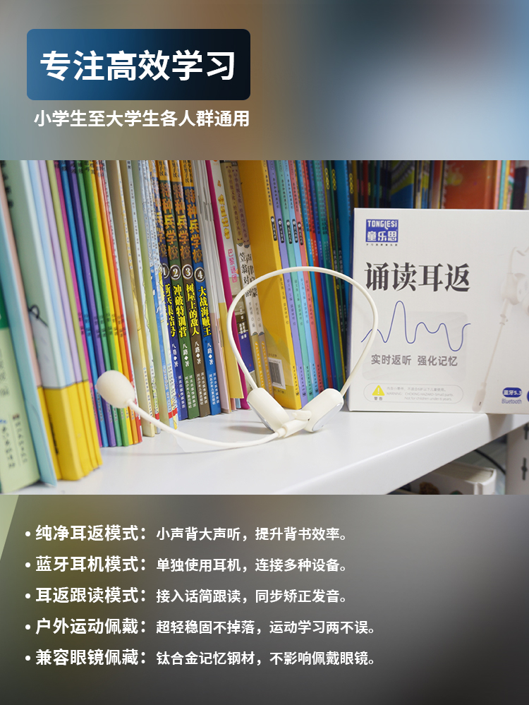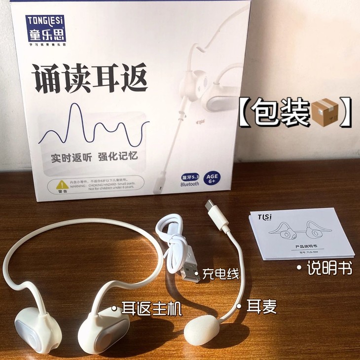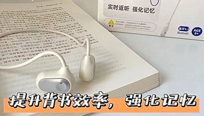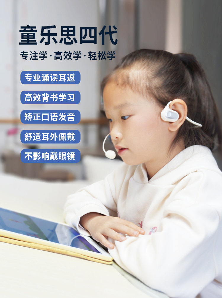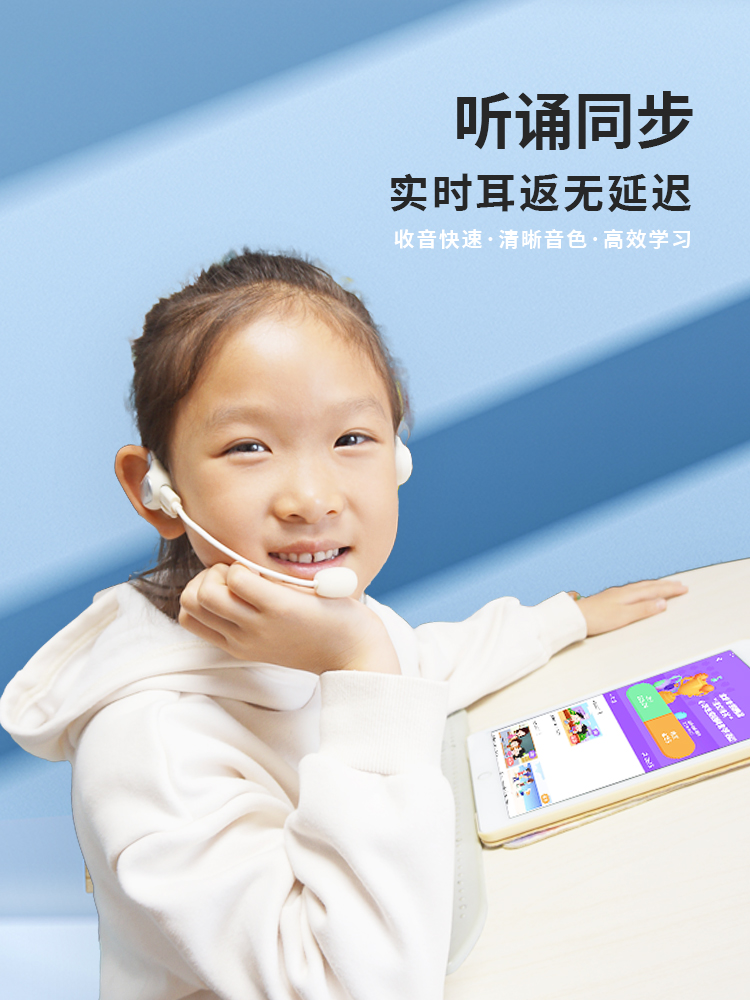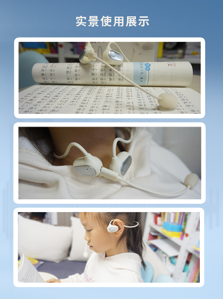 新版的诵读耳返,是「气传导」模式,通过空气振动来传播声音,佩戴不入耳,因此即便长时间使用,也不会塞得耳朵疼或是闷耳朵,非常适合需要高频用耳机的孩子们用——