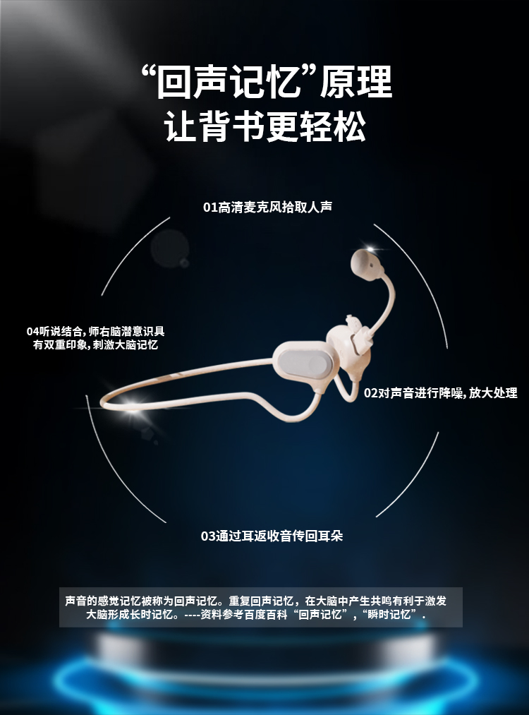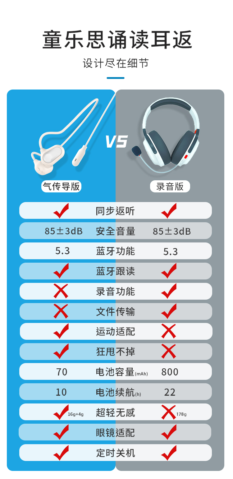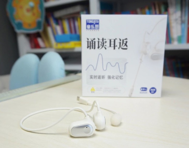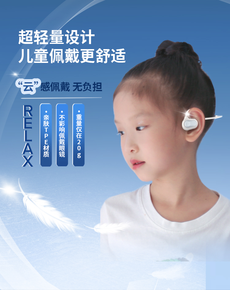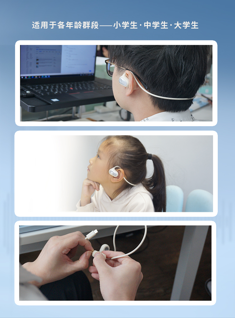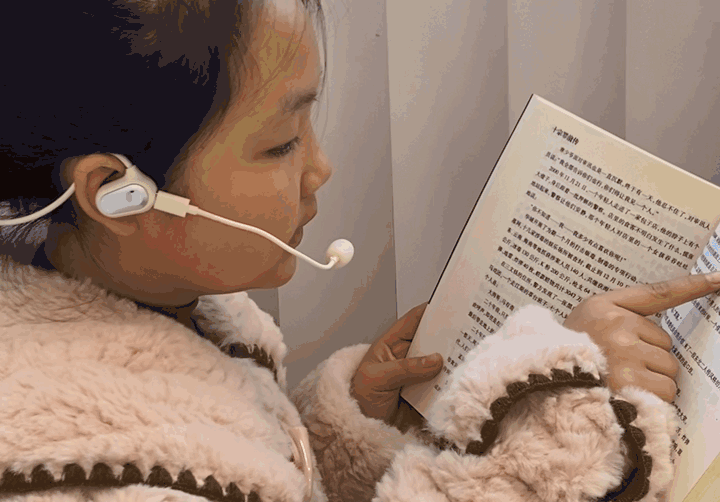 新版的诵读耳返,是「气传导」模式,通过空气振动来传播声音,佩戴不入耳,因此即便长时间使用,也不会塞得耳朵疼或是闷耳朵,非常适合需要高频用耳机的孩子们用——