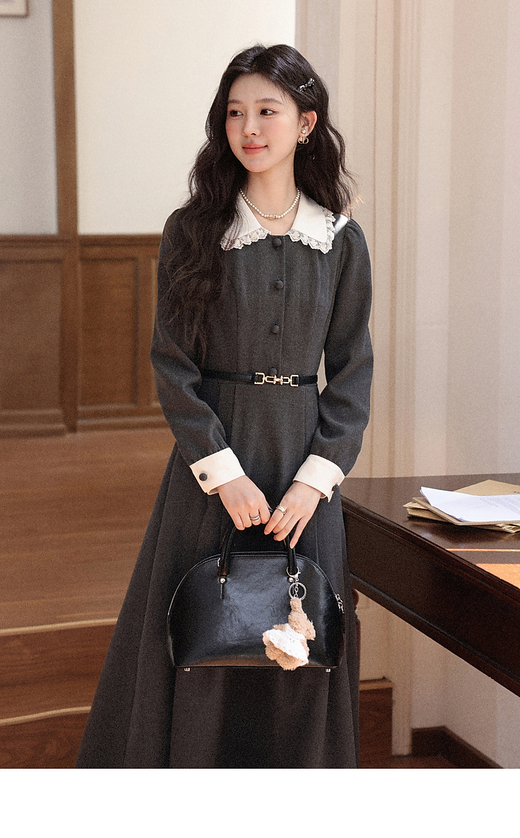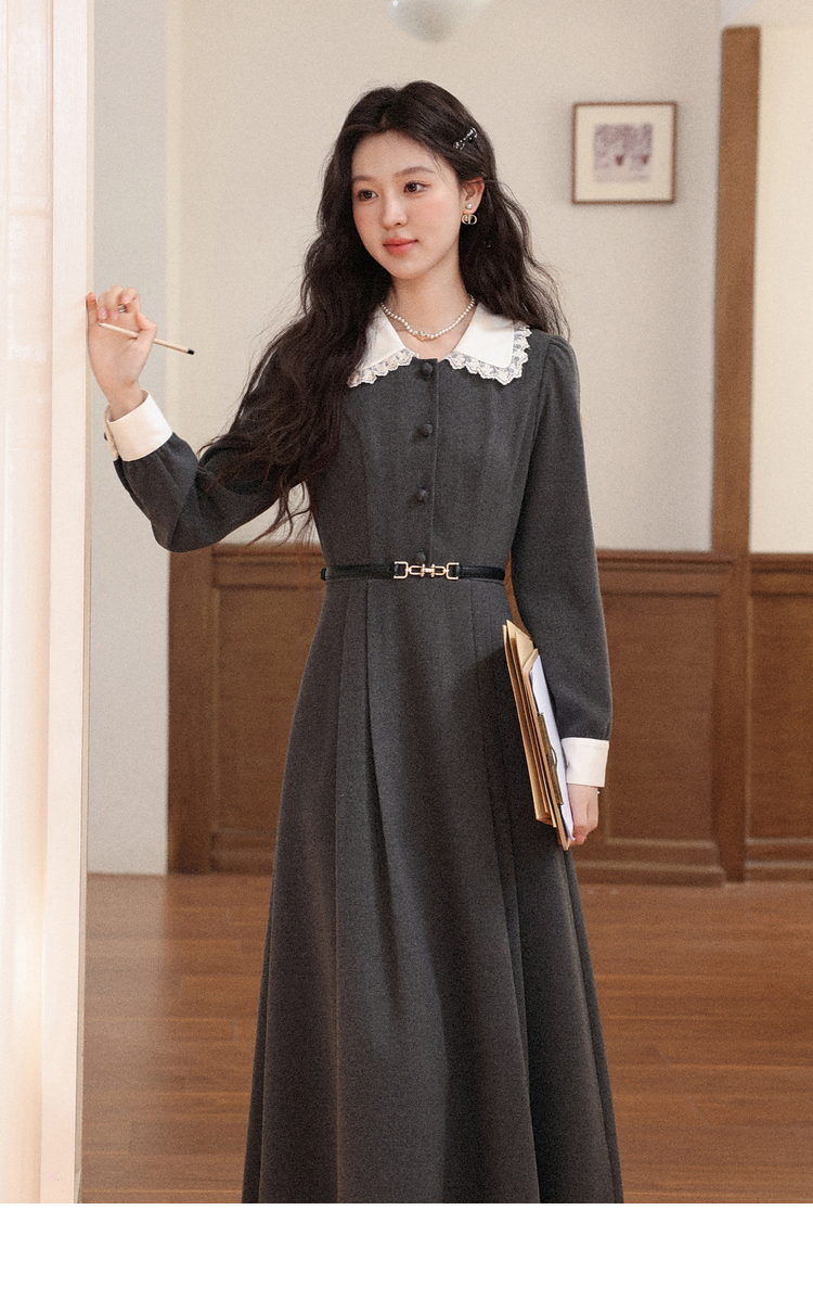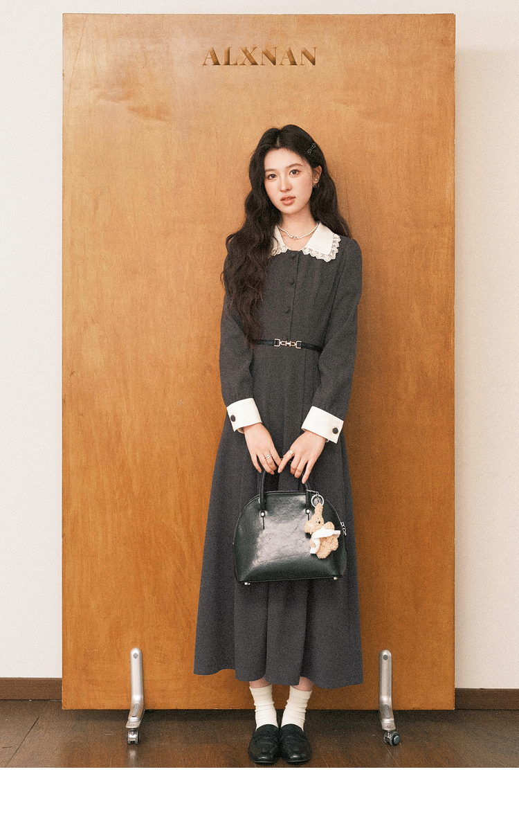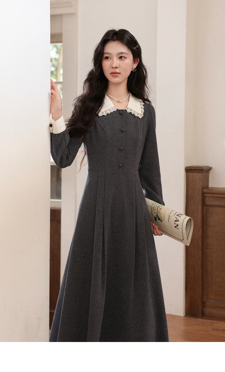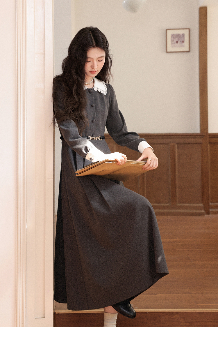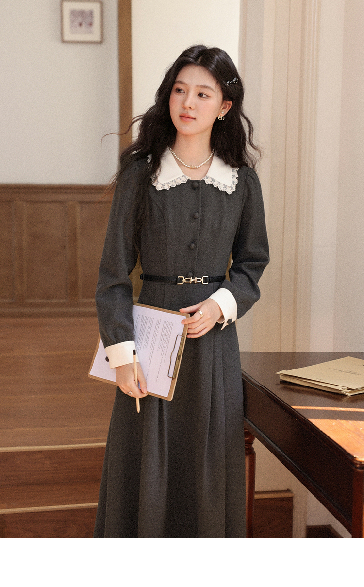 鹿向南「馥郁晚香」灰色假两件翻领连衣裙秋冬季新款中长款裙子女