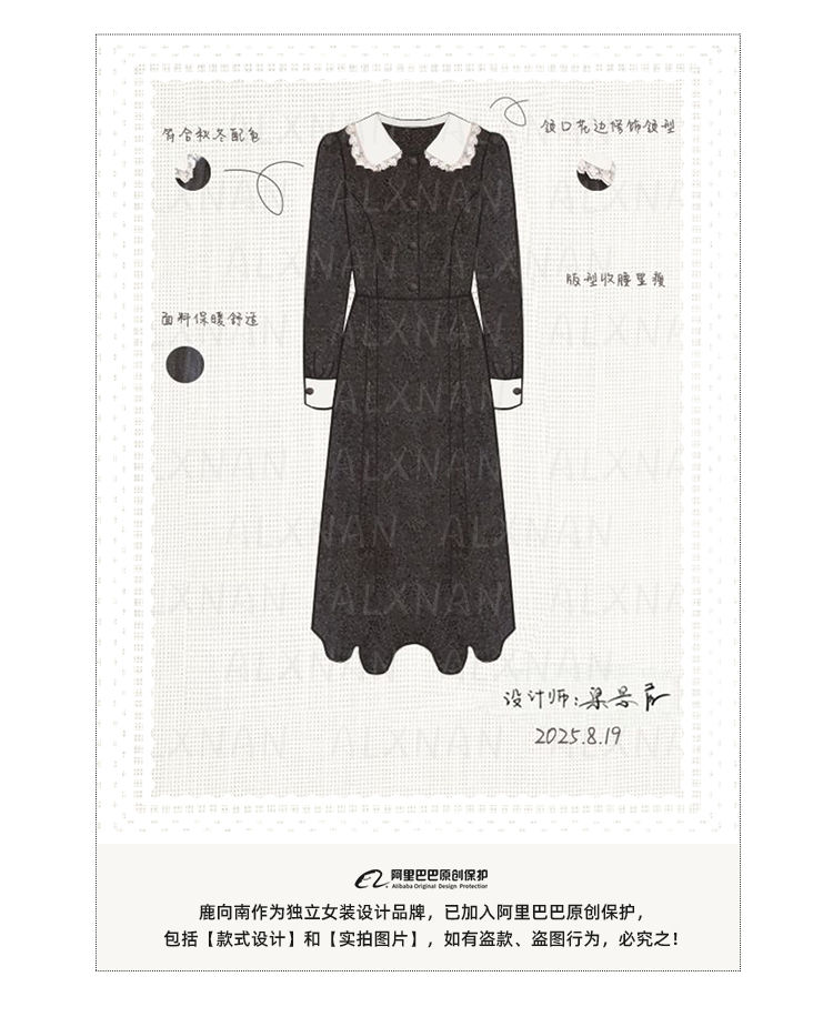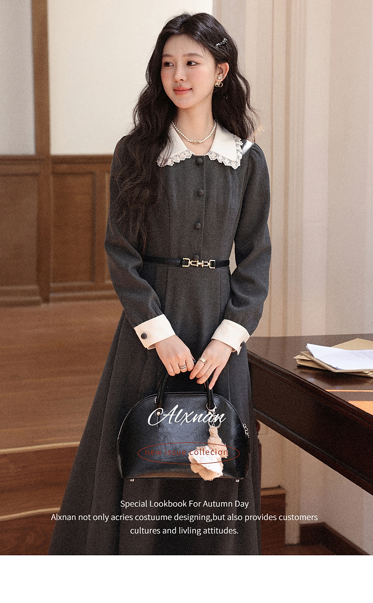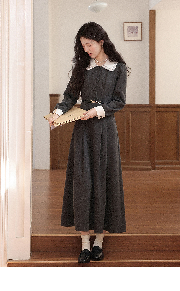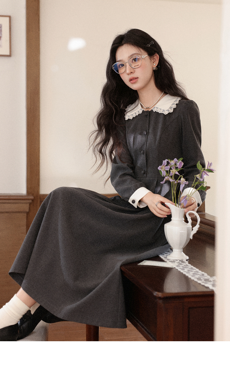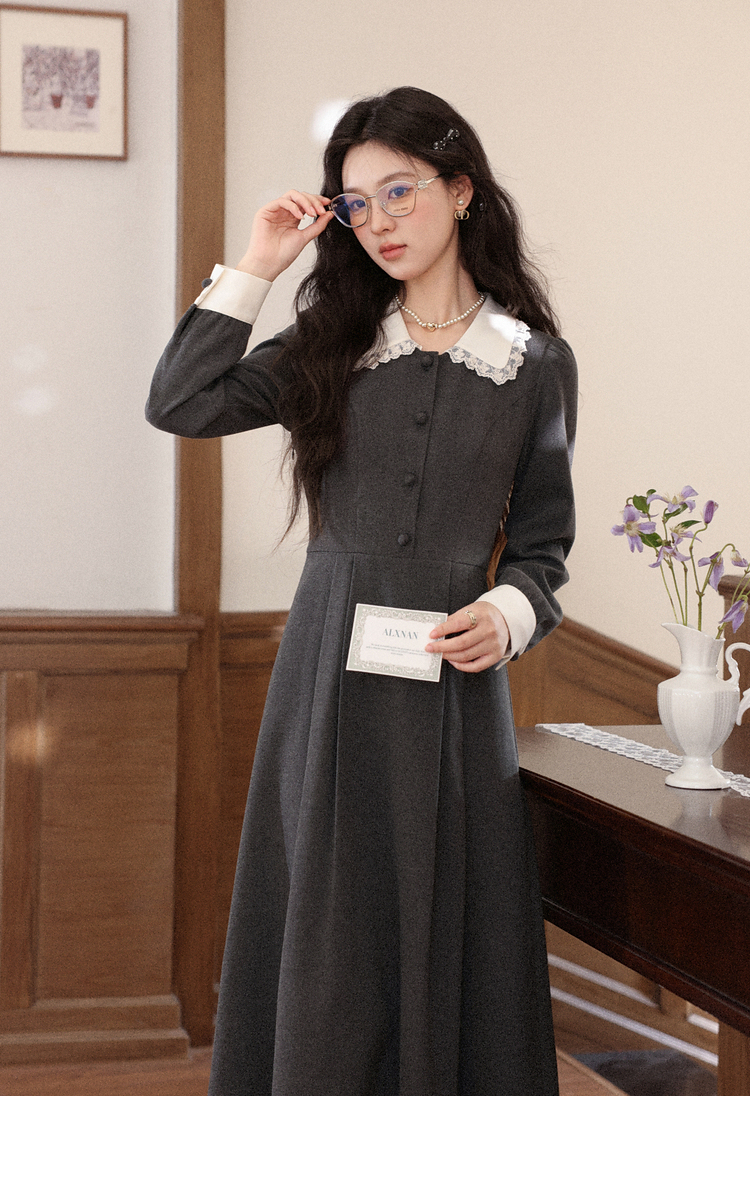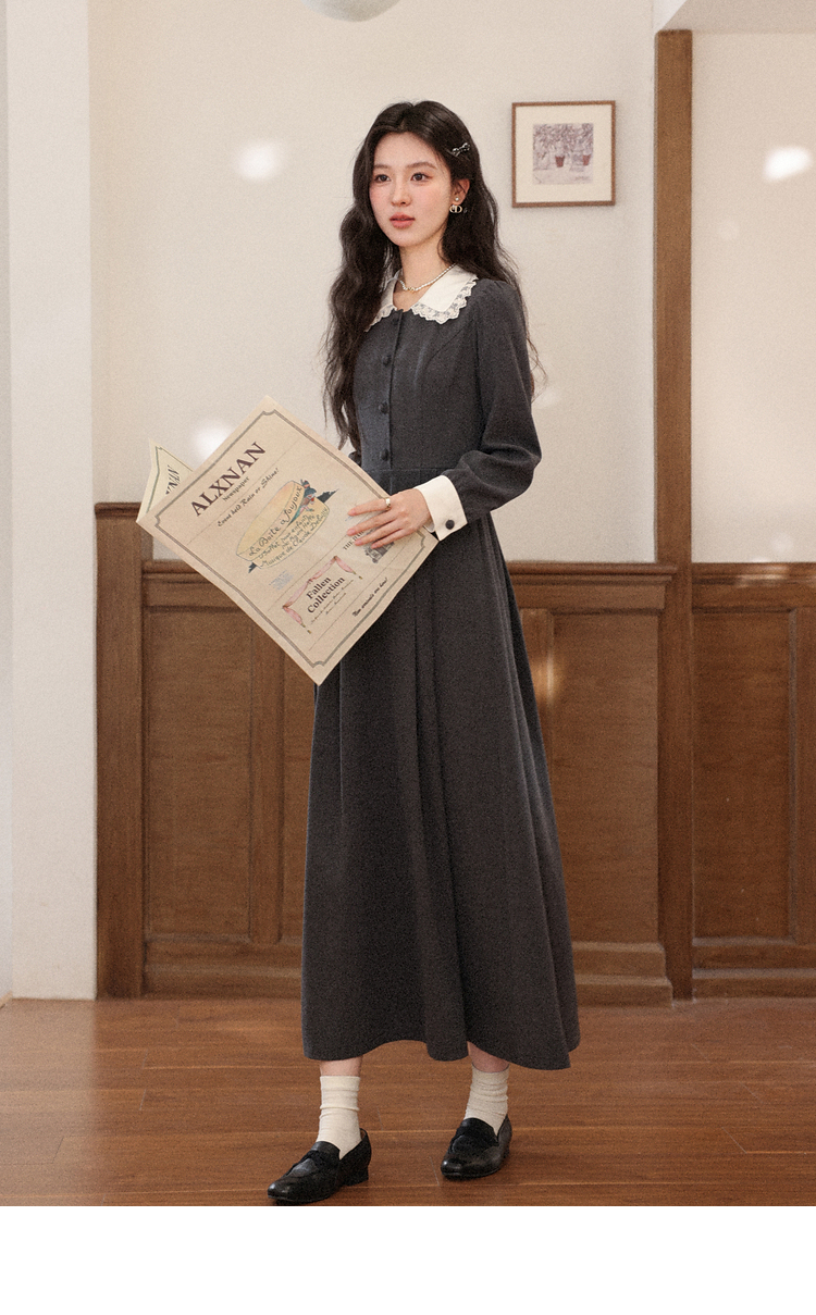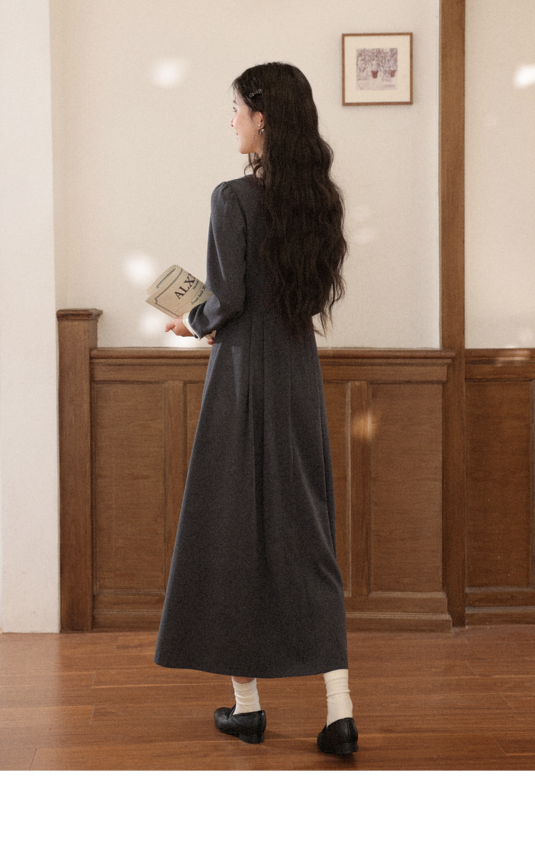 鹿向南「馥郁晚香」灰色假两件翻领连衣裙秋冬季新款中长款裙子女