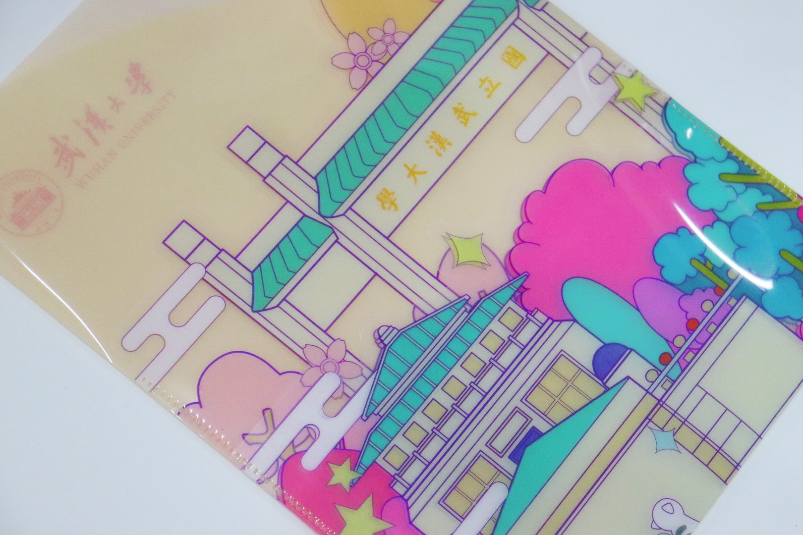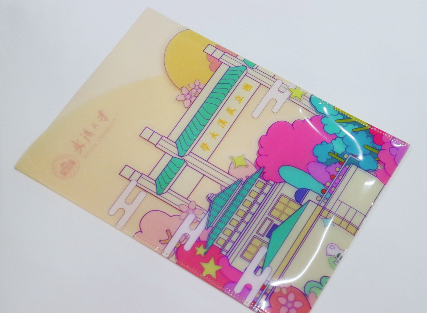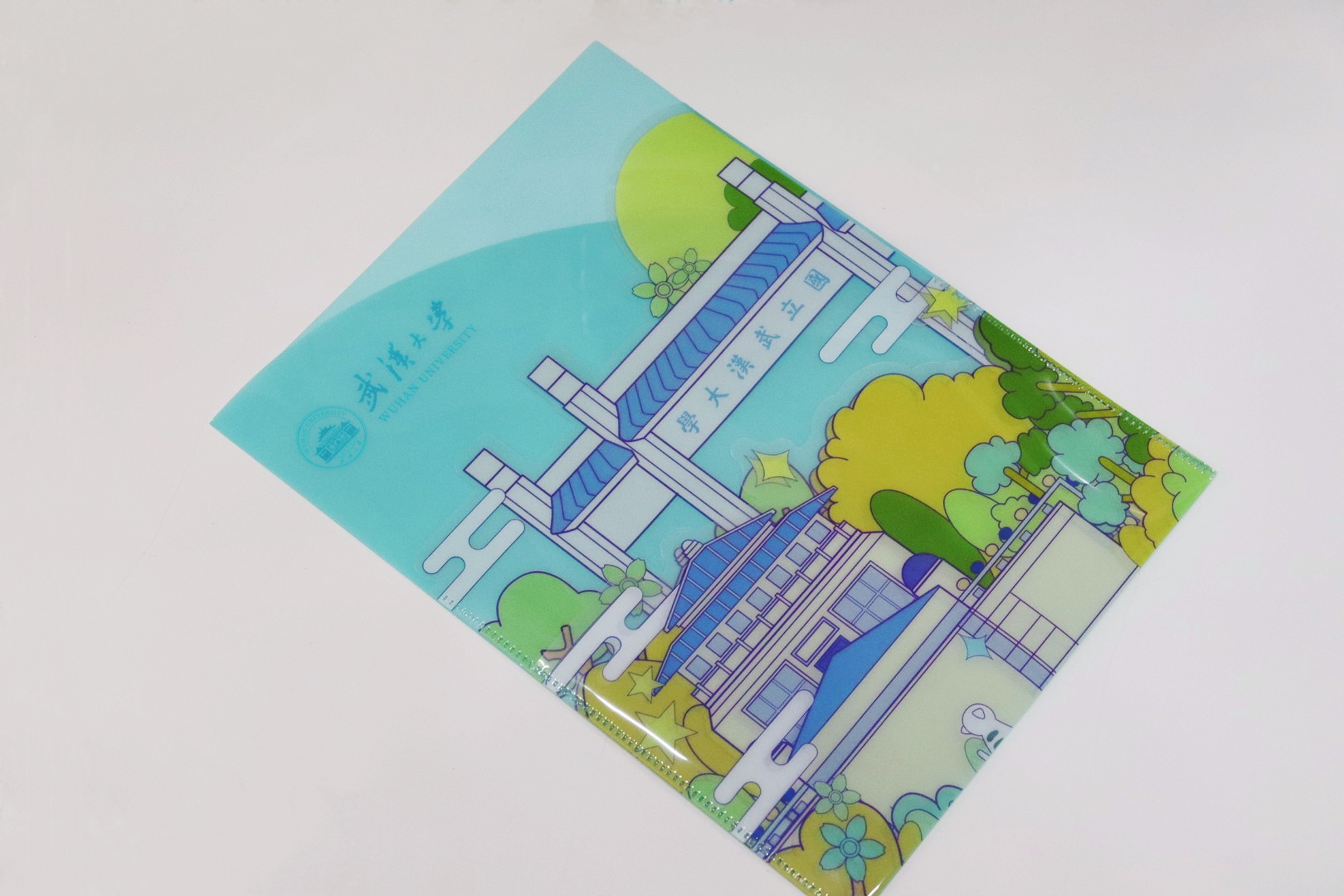以武大建筑为主题绘制一幅插画,由简单几何构成的插图里,不同色系代表不同季节的武大有着不同的景色。文件夹有三层,相比传统文件夹实用性更好,能将不同文件分隔开又,画面上有层次感更有功能性。