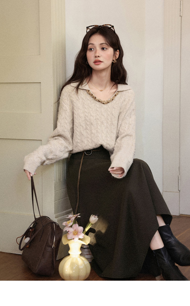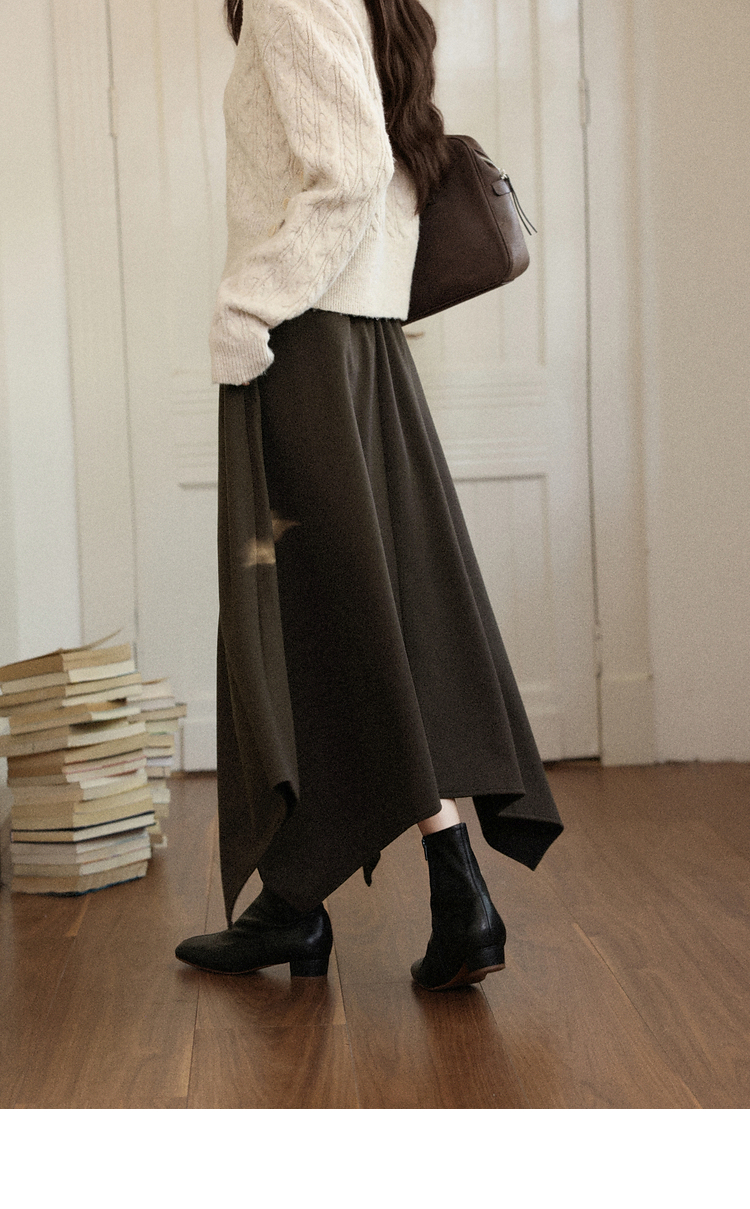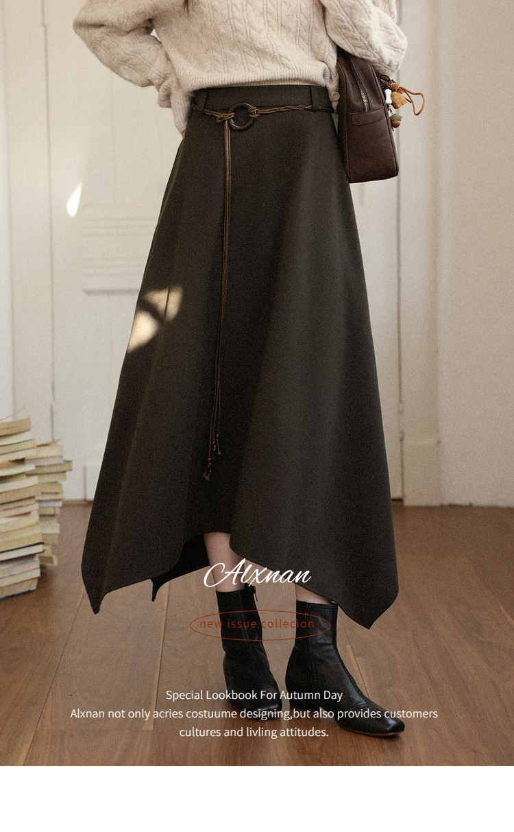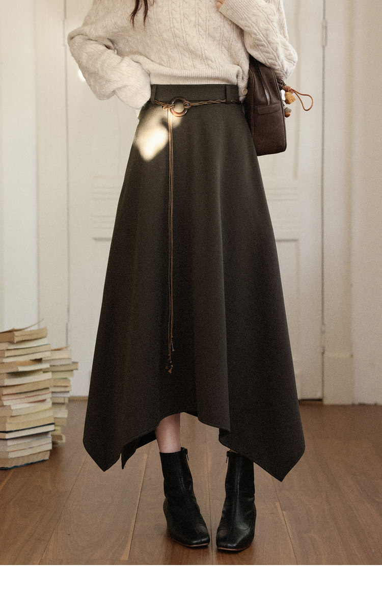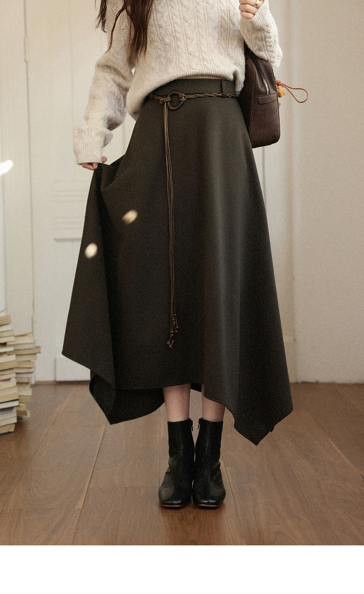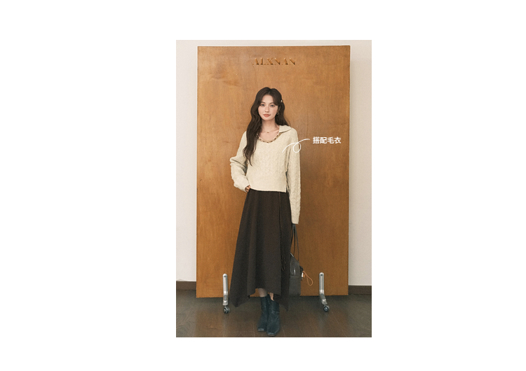鹿向南「文艺质感」深咖色中长款半身裙女秋冬复古规则高腰A字裙