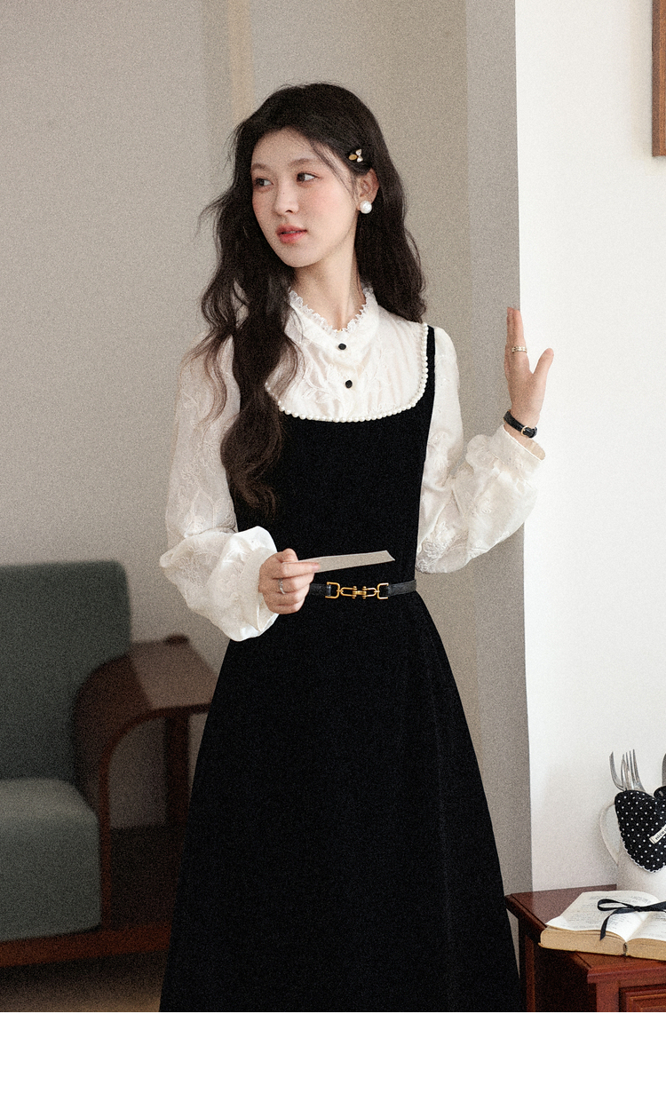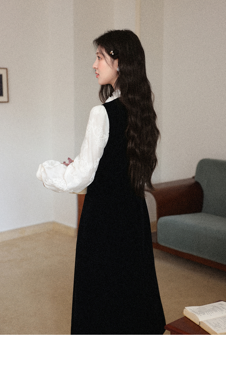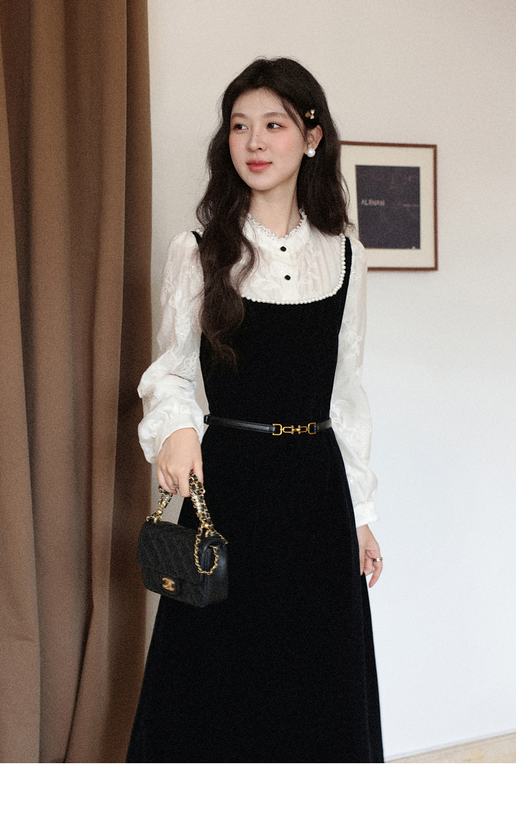 鹿向南「主题曲」法式千金感假两件设计感连衣裙女秋新款黑色长裙