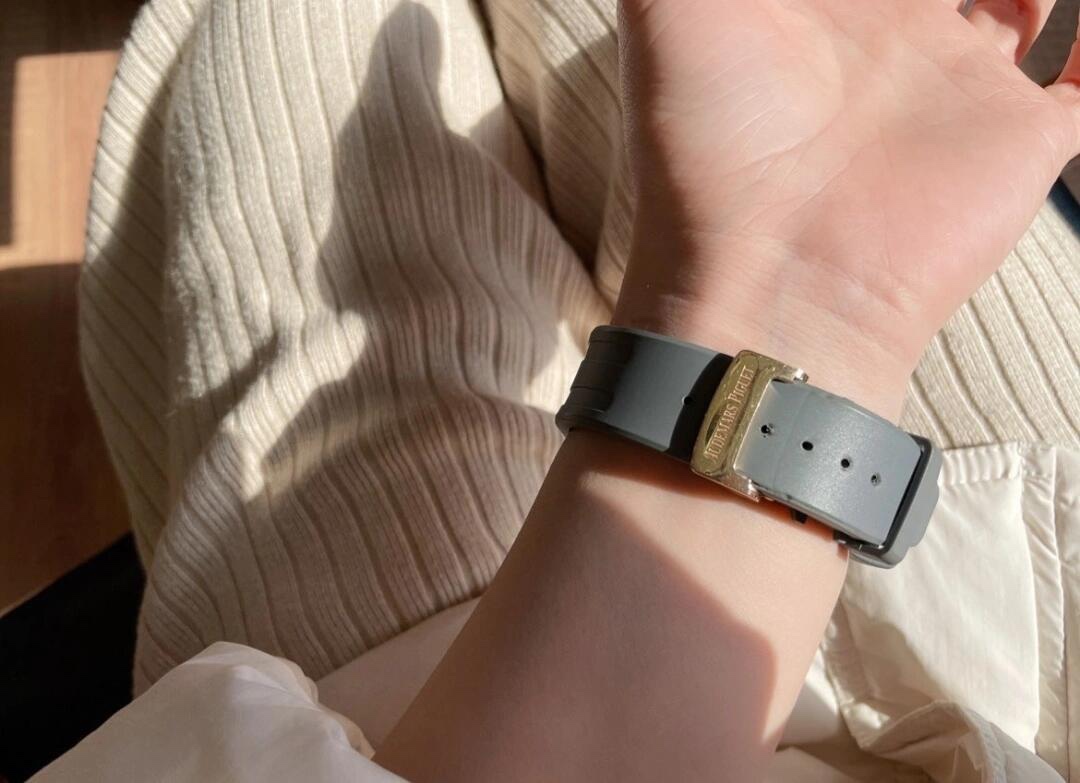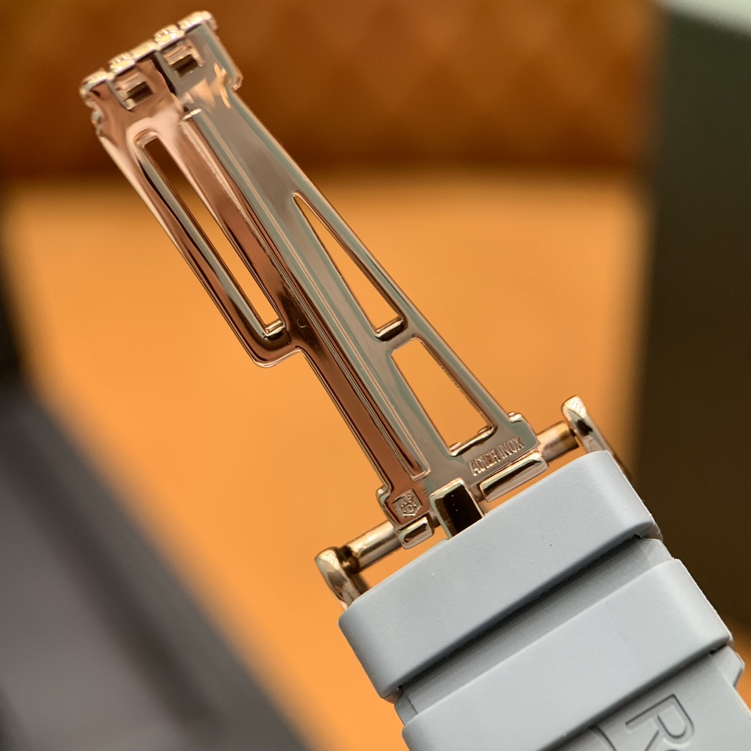 灰色橡胶表带,搭配精钢AP字样折叠式表扣。整体给人的感觉就非常年轻、运动、时尚!百搭耐看!