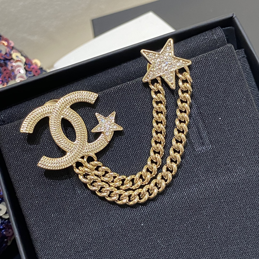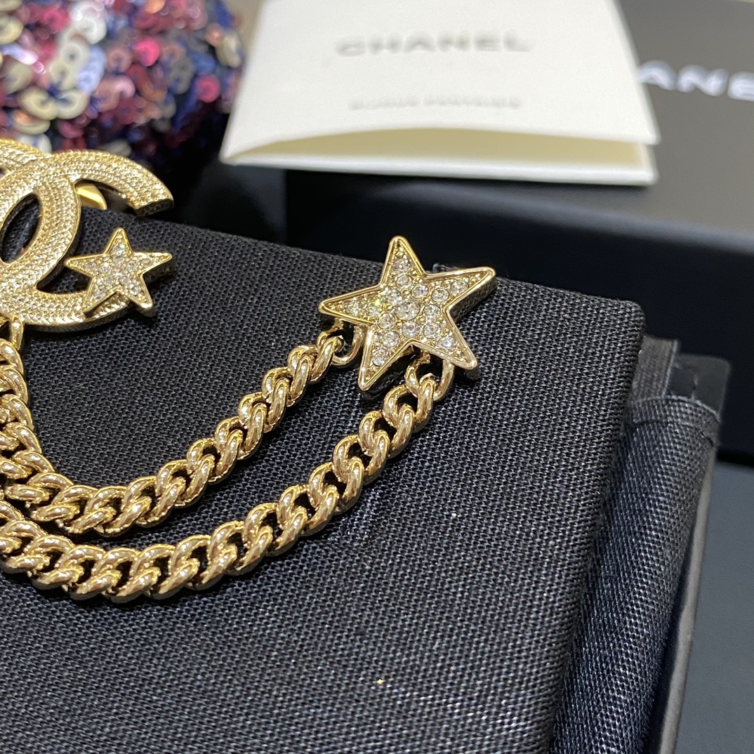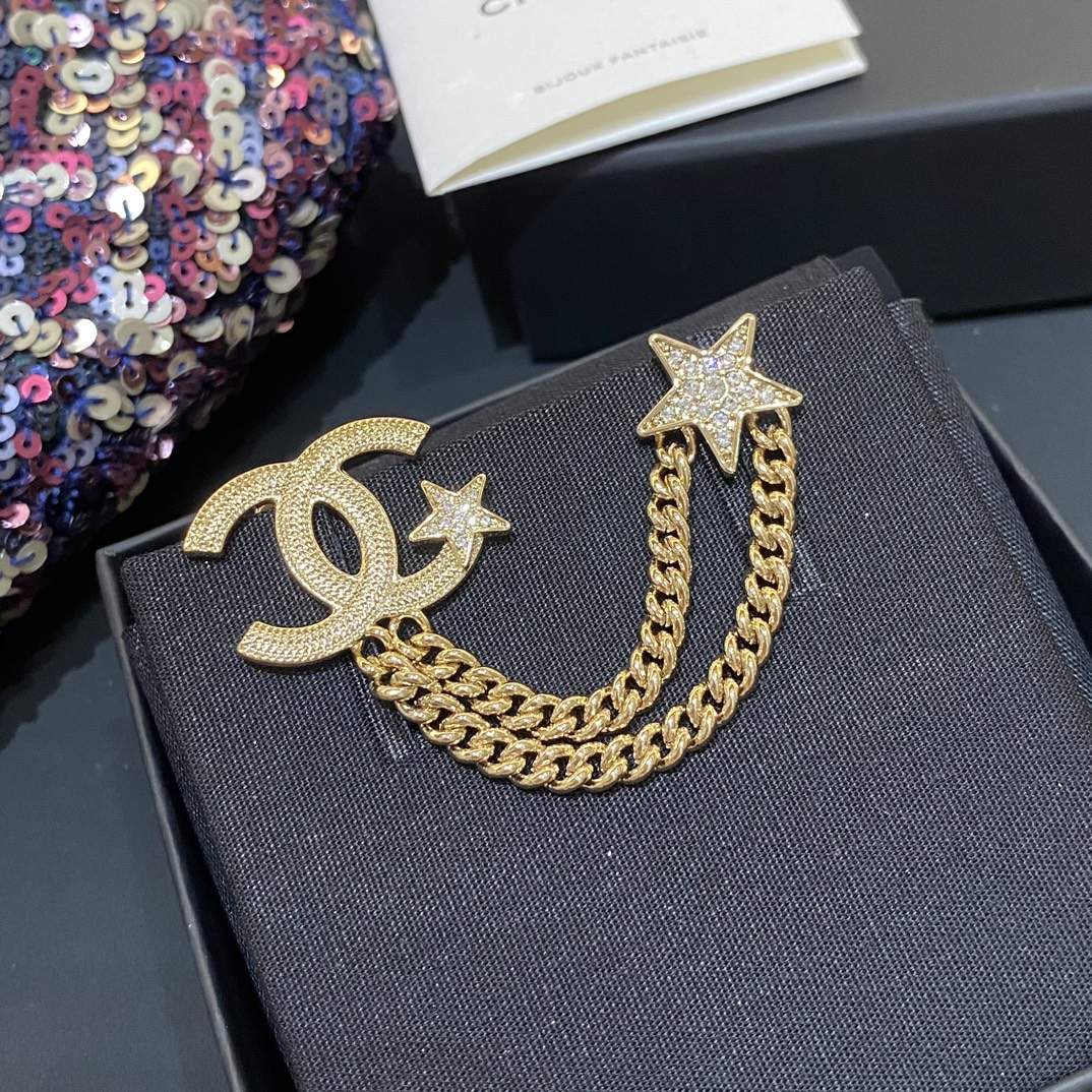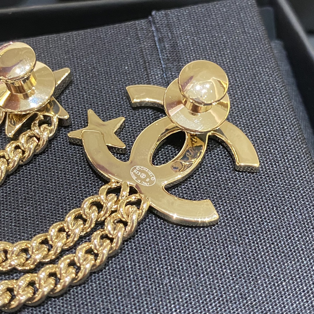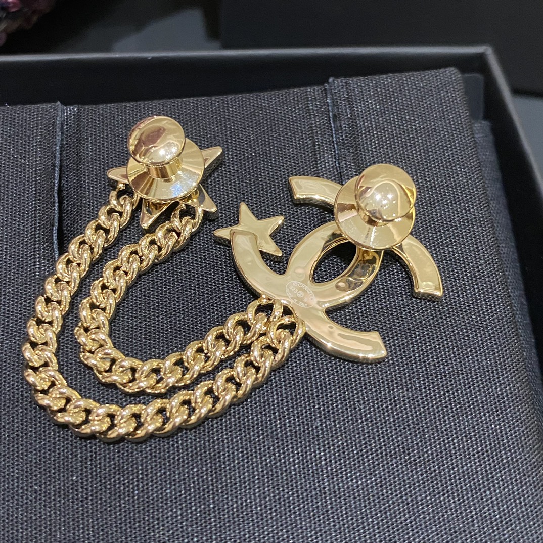 Cha*l 小香 23B金色纹理双链条星星胸针