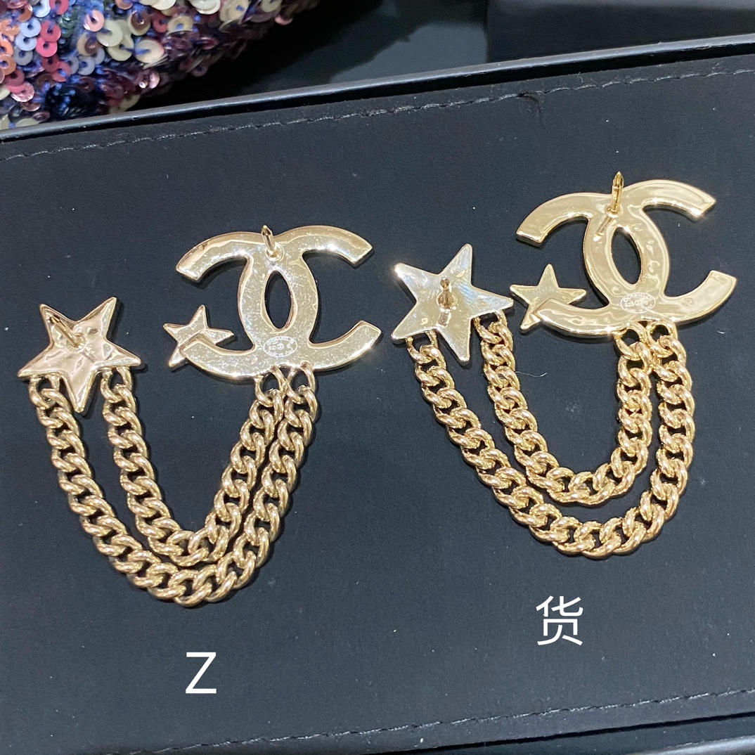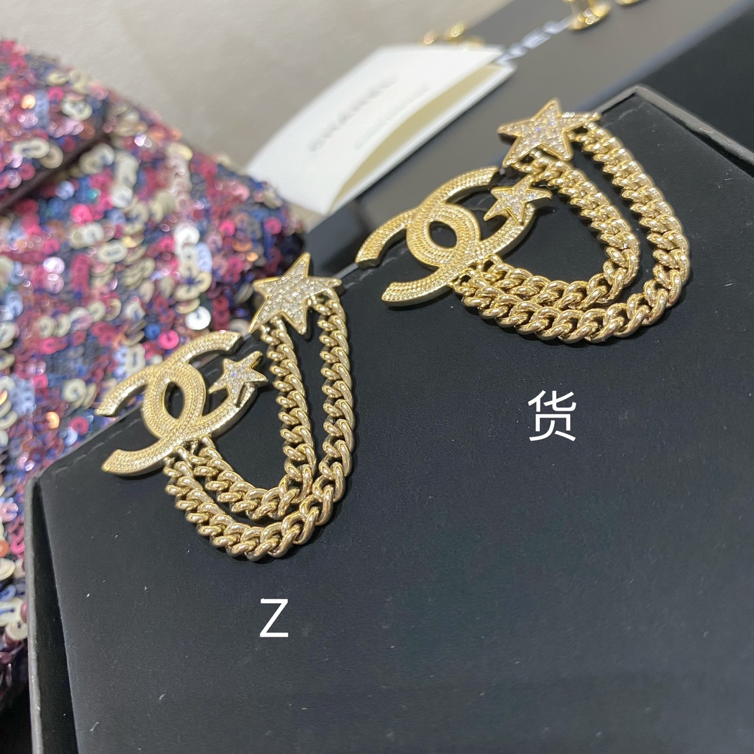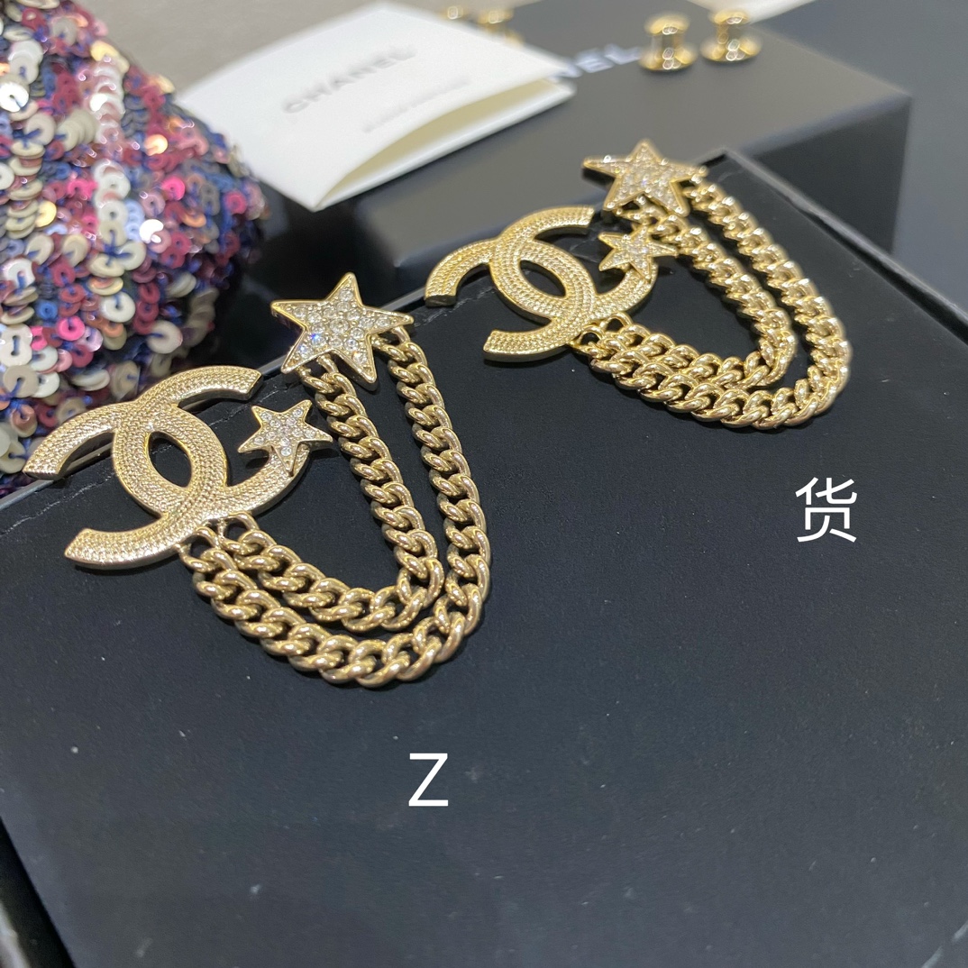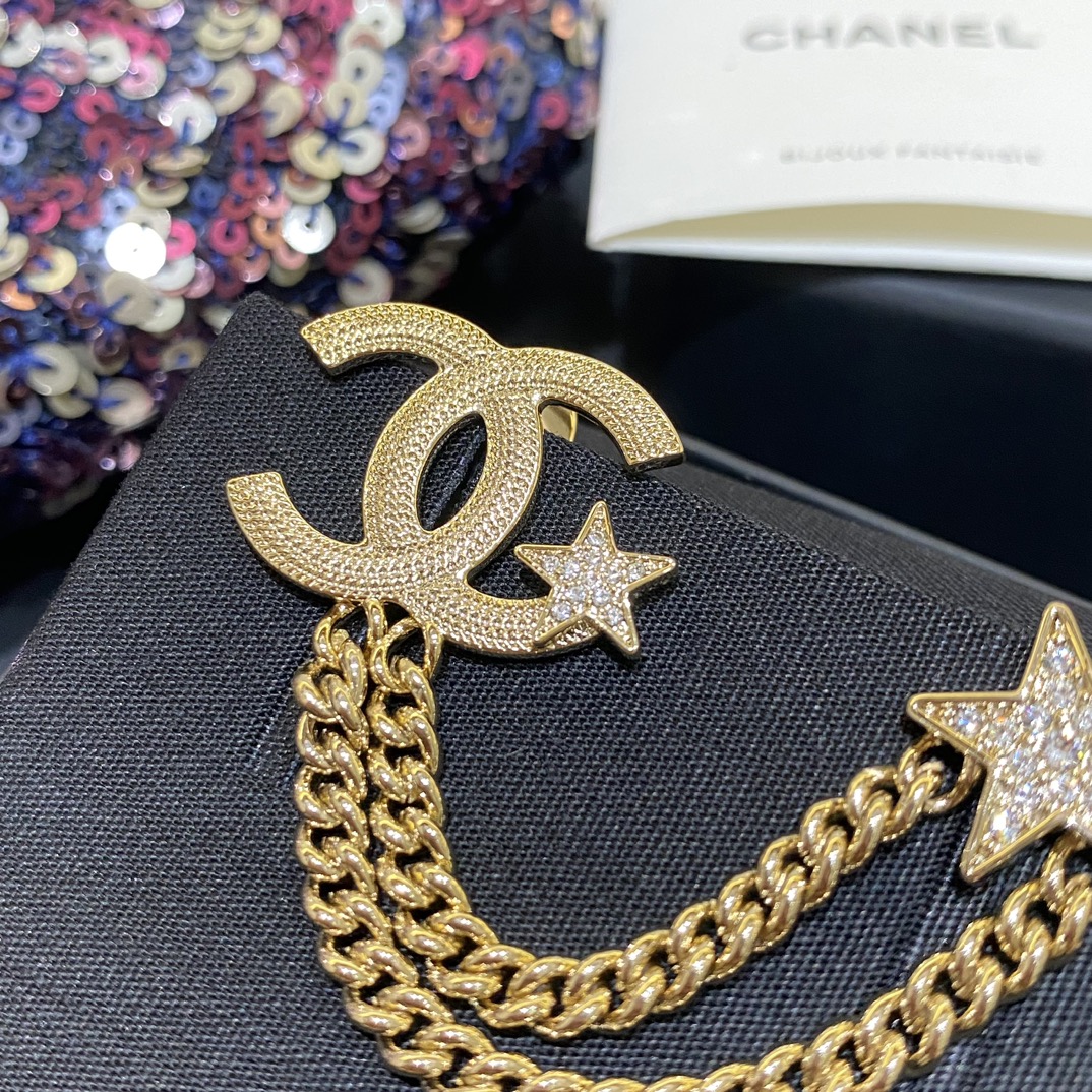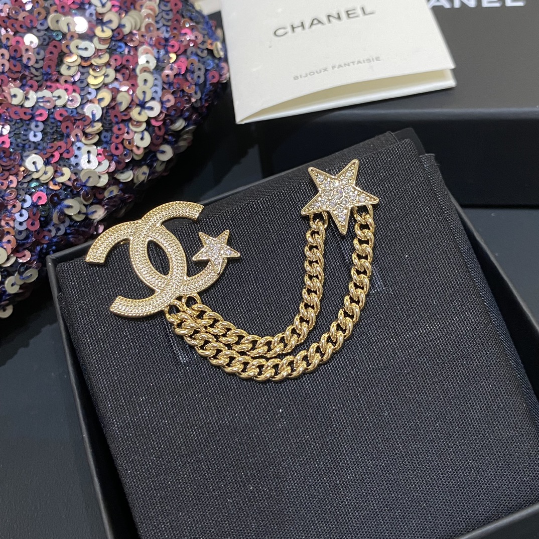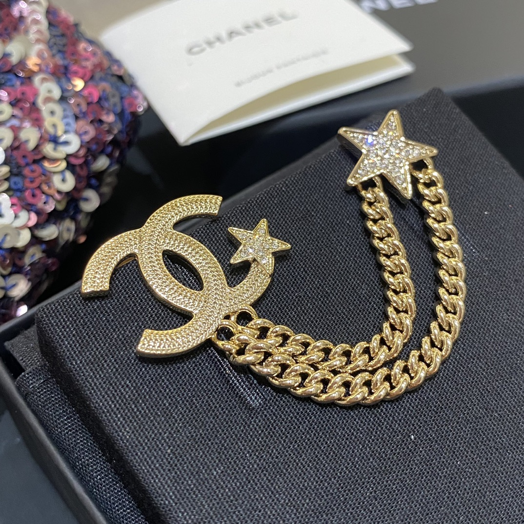 Cha*l 小香 23B金色纹理双链条星星胸针