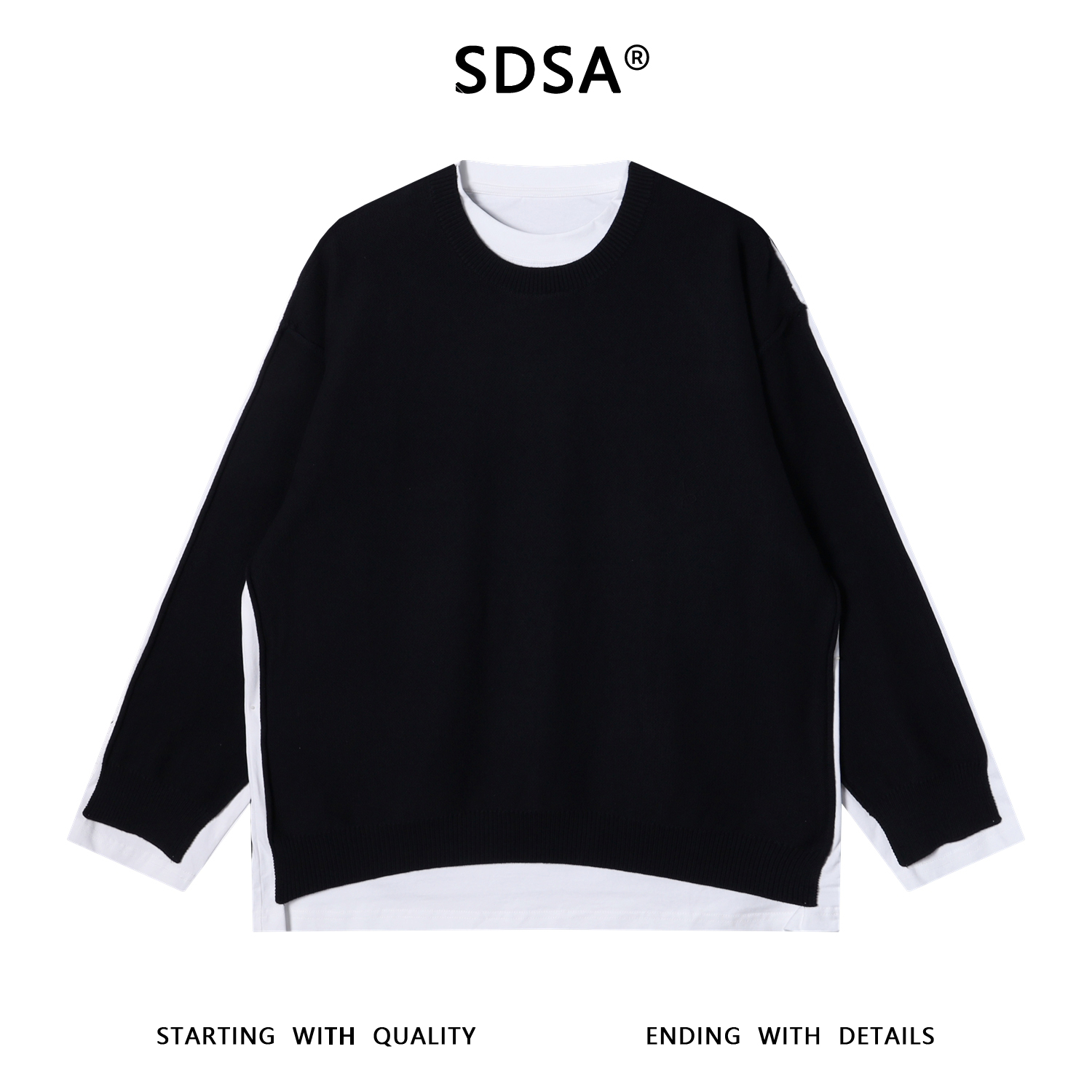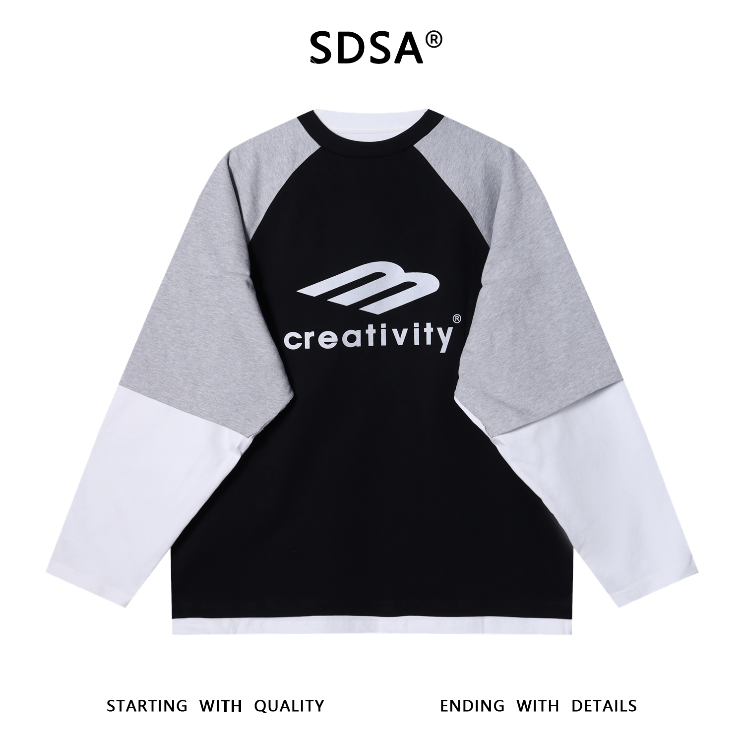 SDSA秋冬新款痞帅男装潮牌拼接撞色印花字母圆领假两件卫衣时尚