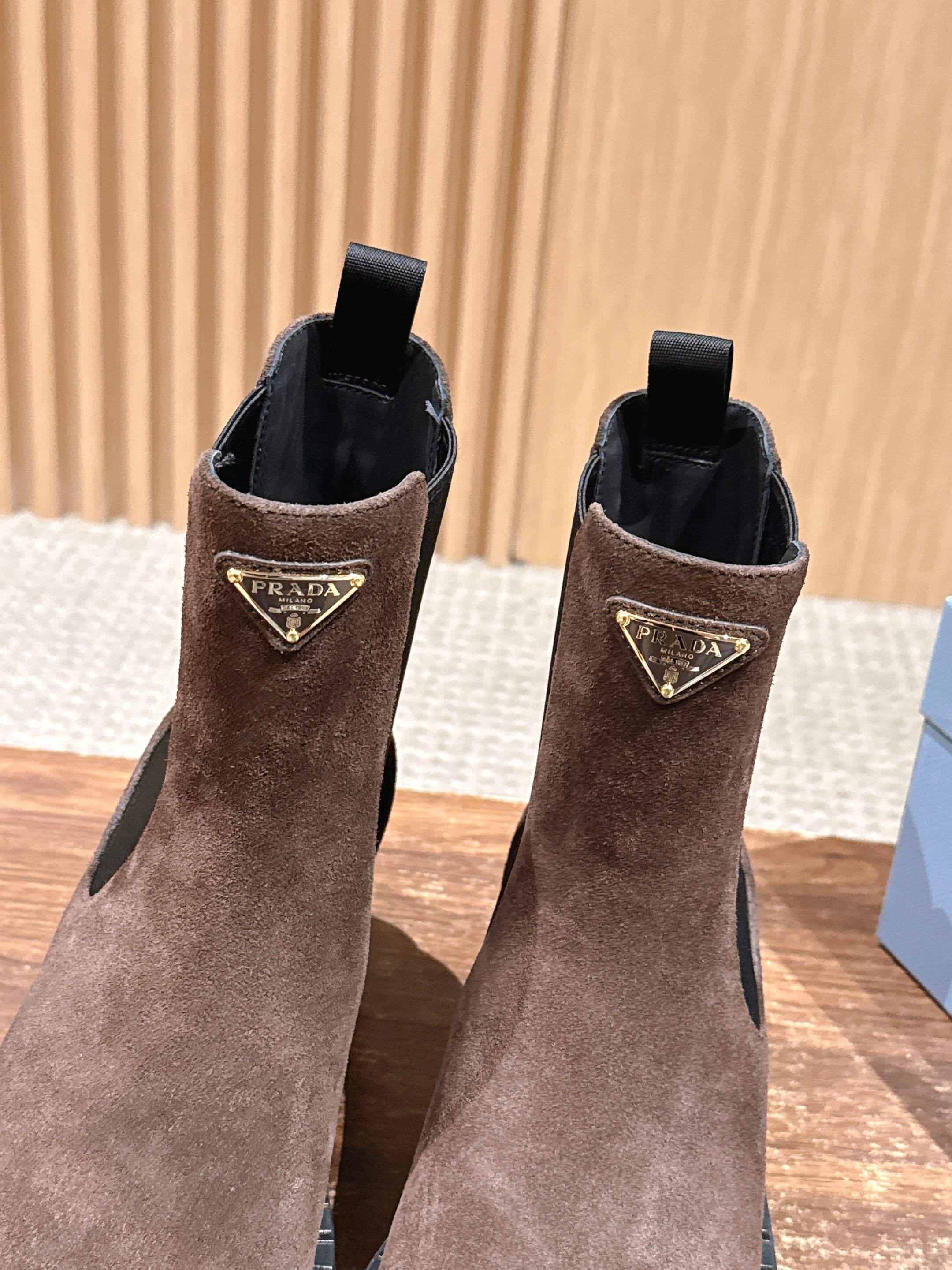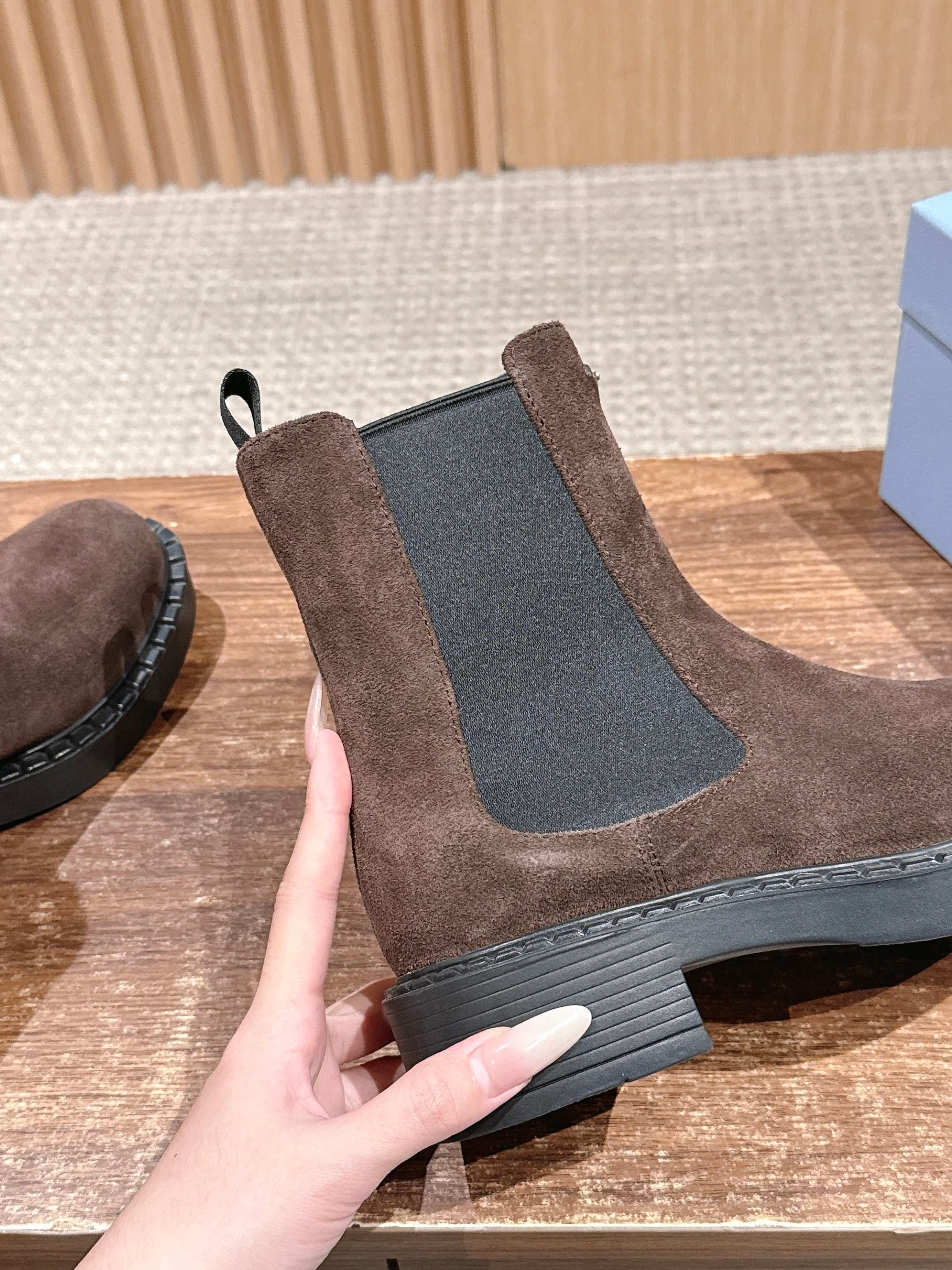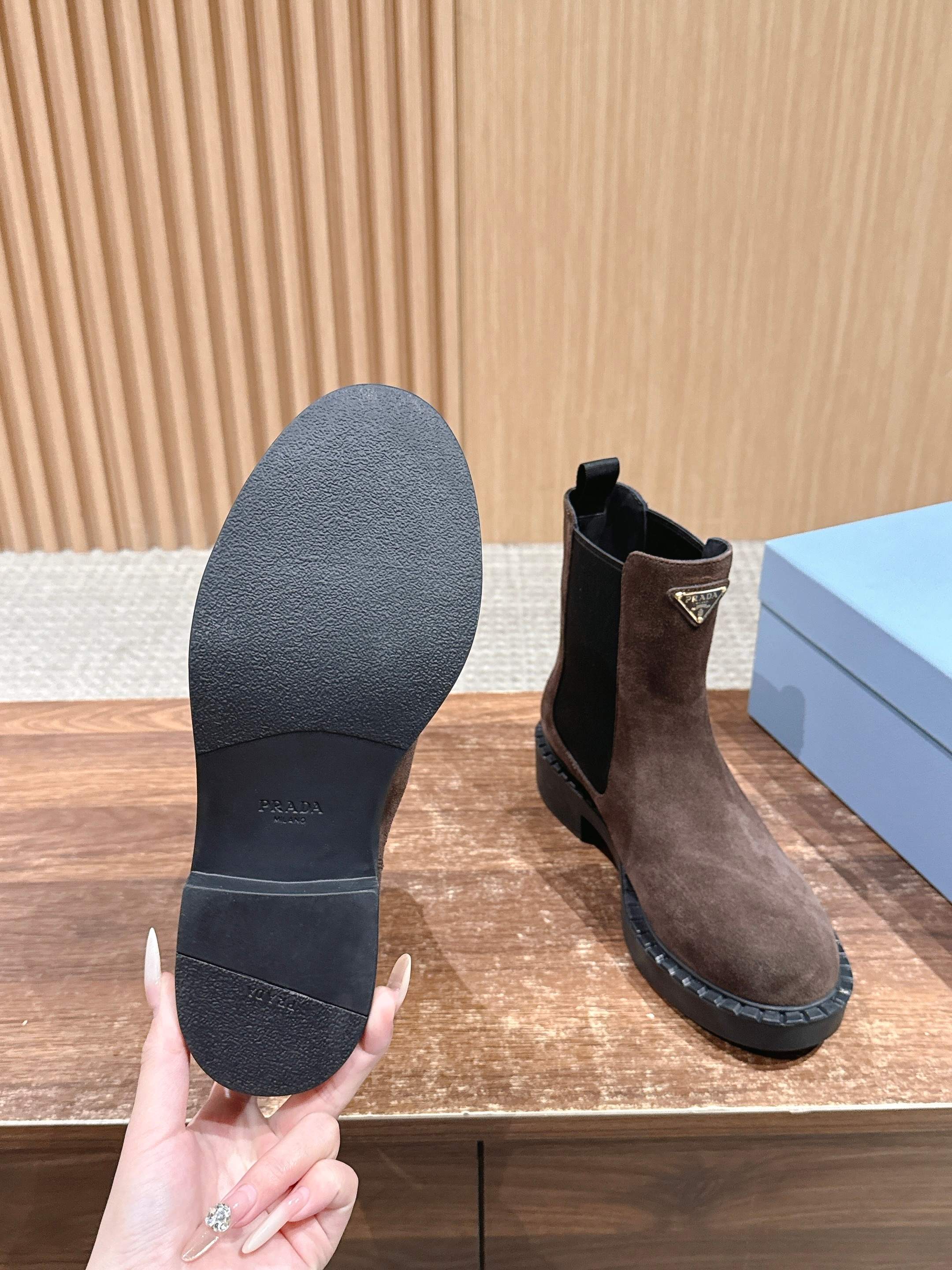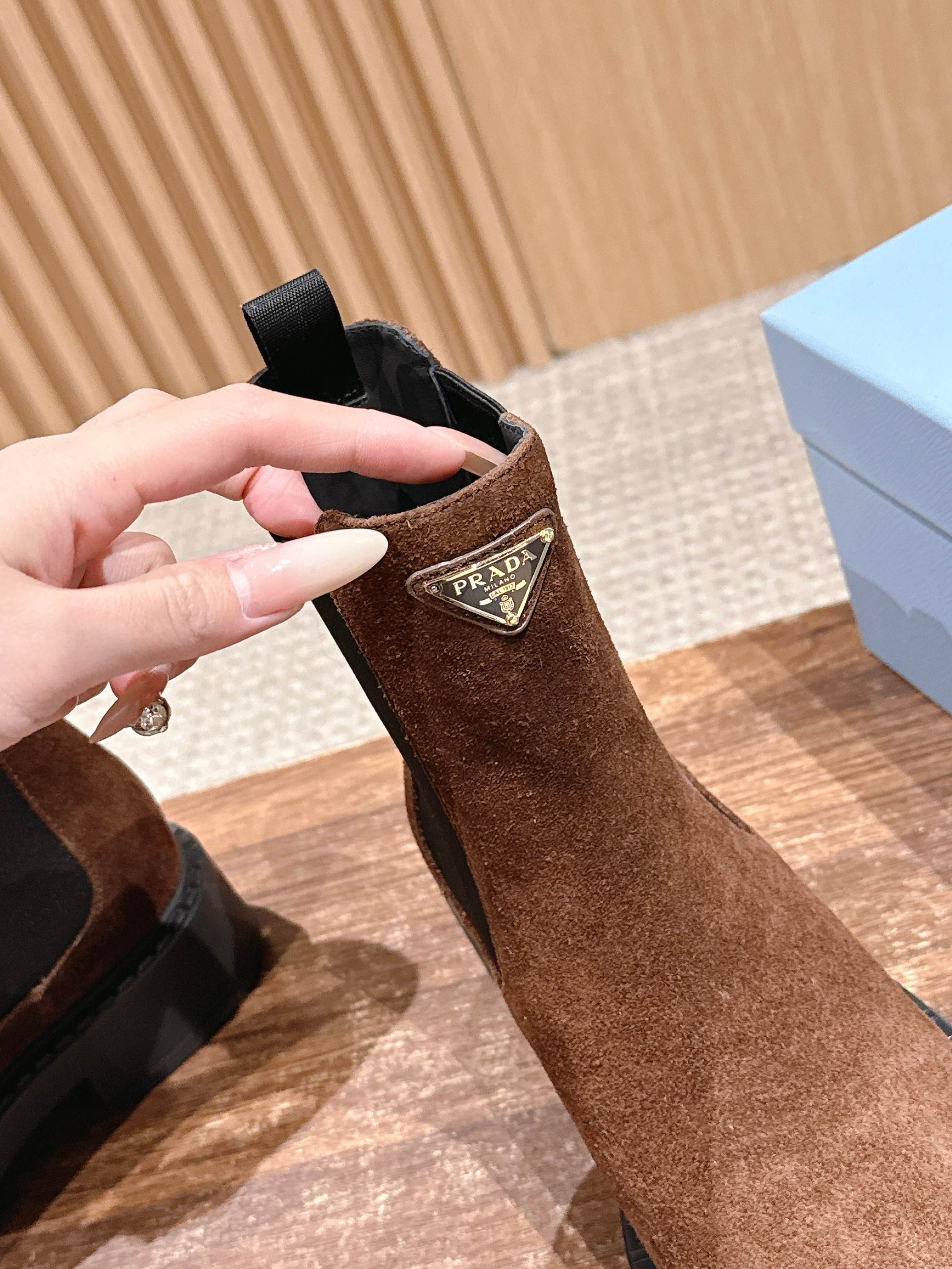 𝐏𝐑𝐀𝐃𝐀 普拉达经典款三角标烟管靴 切尔西裸靴 这两年三角标系列产品可谓是风靡整个鞋圈 这款鞋真的是很耐看越看越喜欢! 普拉达这款的设计跟以往的风格并不一样 复古军靴的切尔西的设计感 超酷! 麂皮材质 牛皮里 原版TPU大底 Size:35-39(40/41定做不退换)