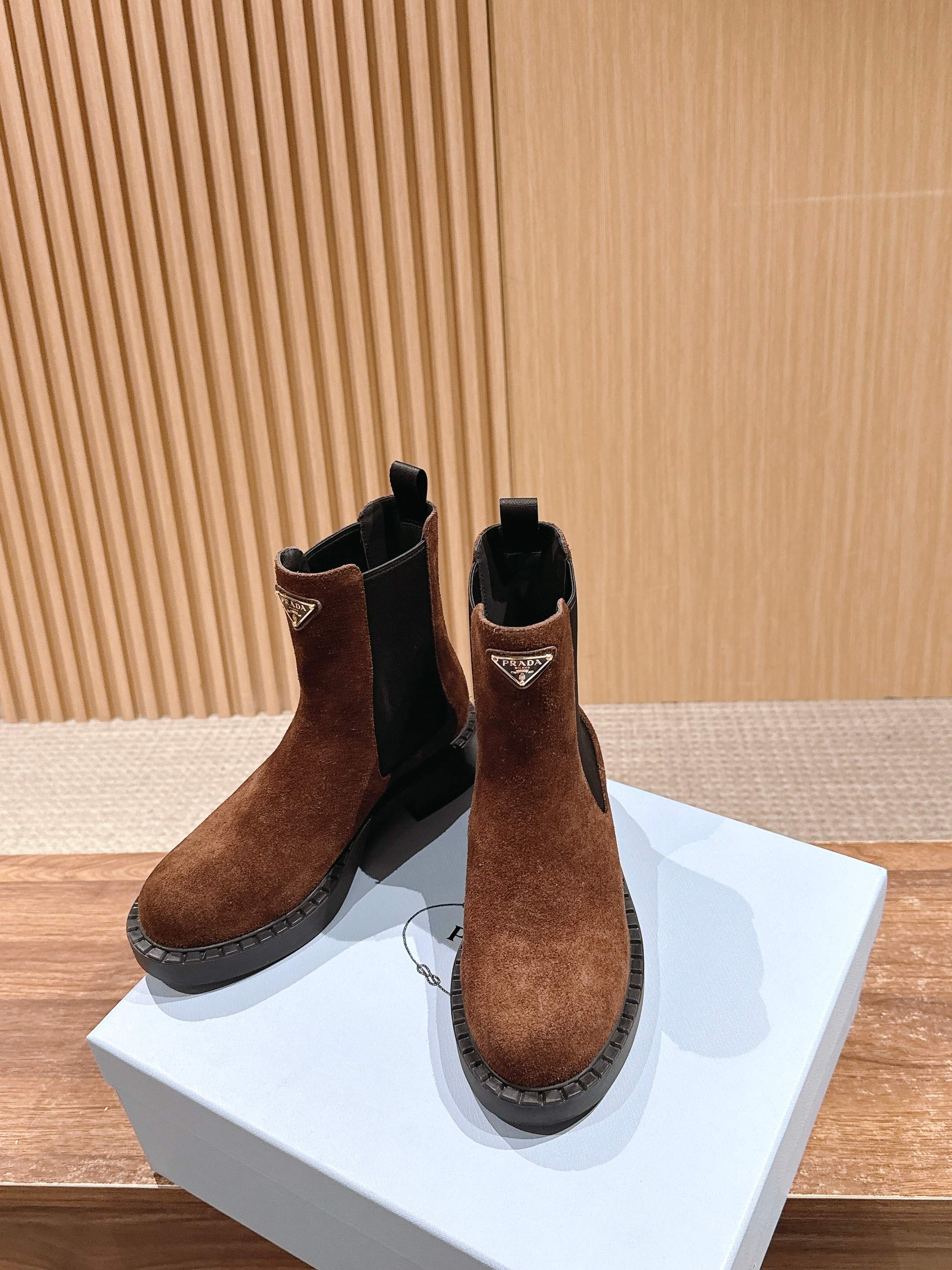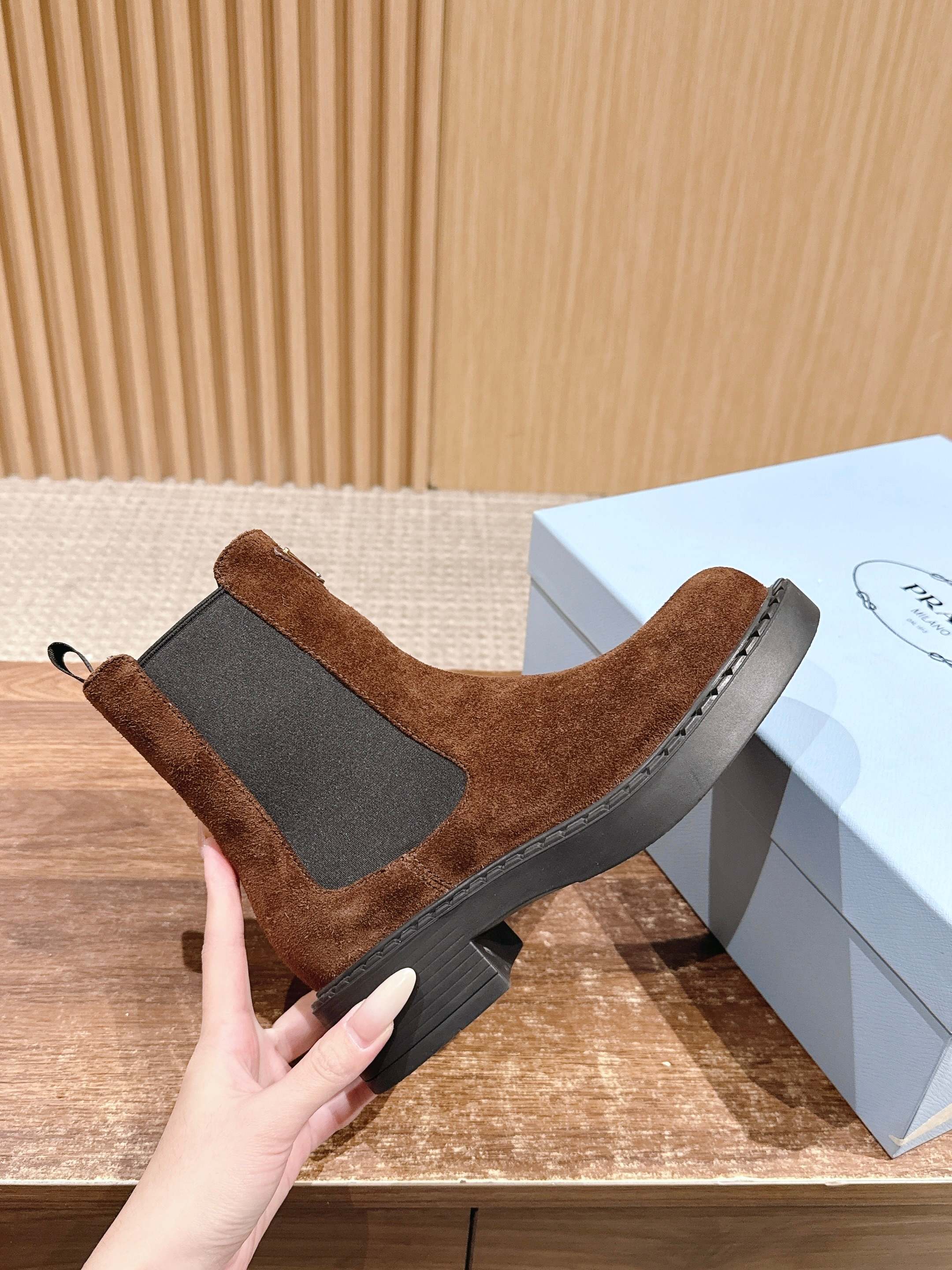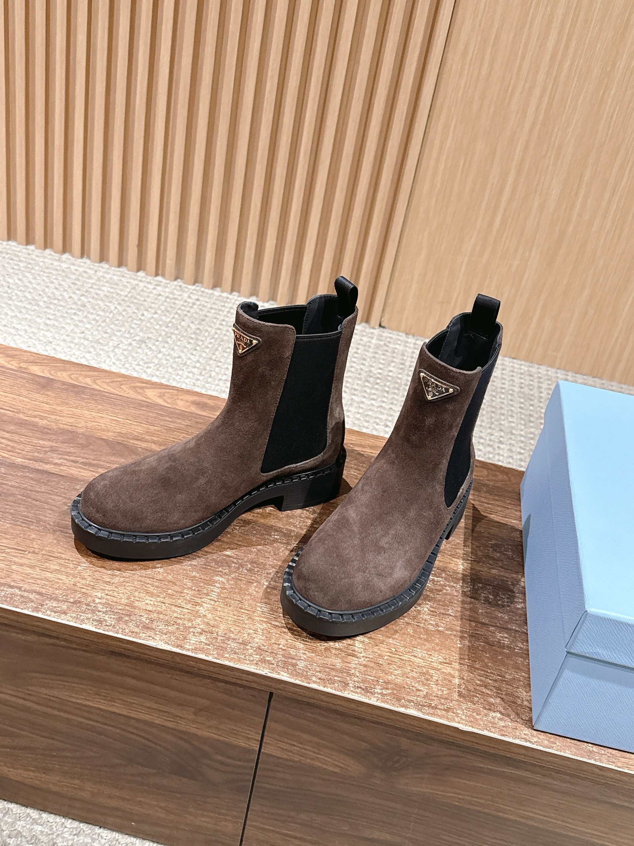 𝐏𝐑𝐀𝐃𝐀 普拉达经典款三角标烟管靴 切尔西裸靴 这两年三角标系列产品可谓是风靡整个鞋圈 这款鞋真的是很耐看越看越喜欢! 普拉达这款的设计跟以往的风格并不一样 复古军靴的切尔西的设计感 超酷! 麂皮材质 牛皮里 原版TPU大底 Size:35-39(40/41定做不退换)