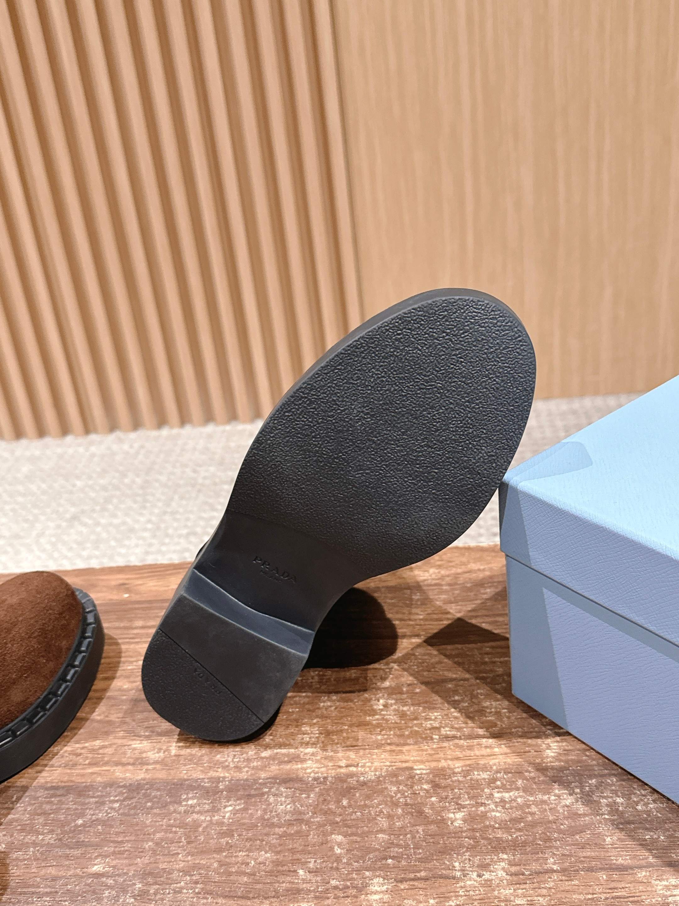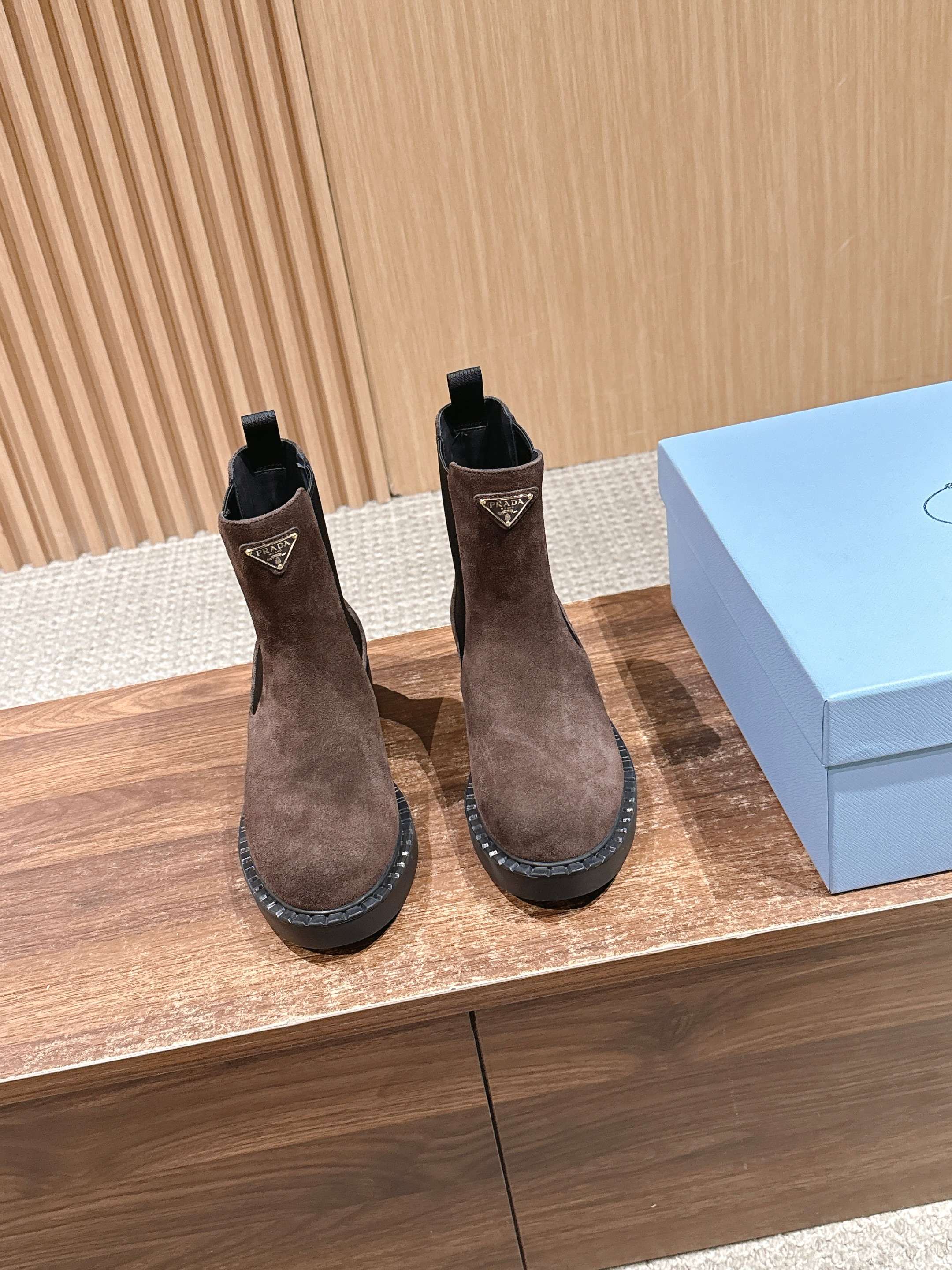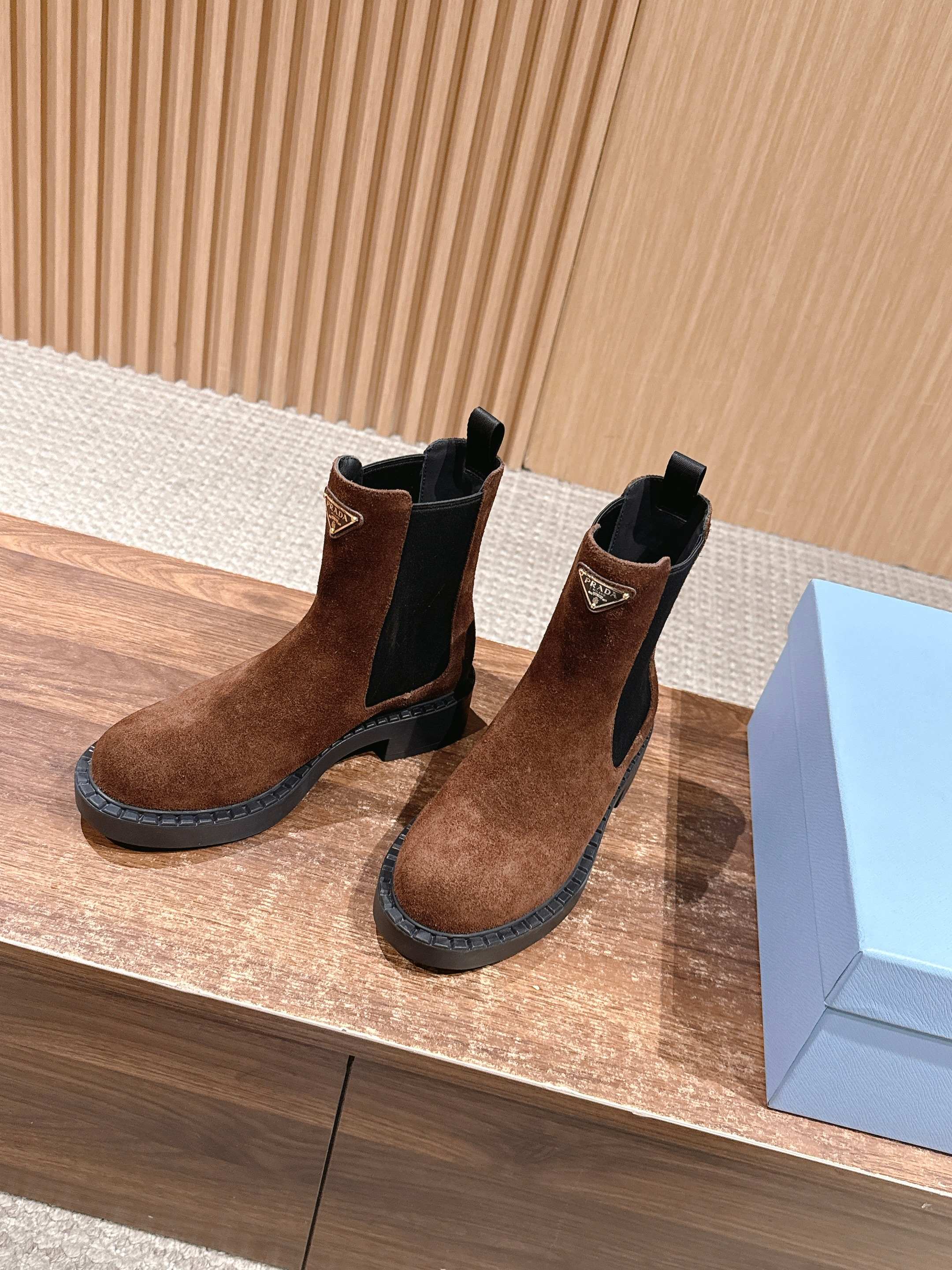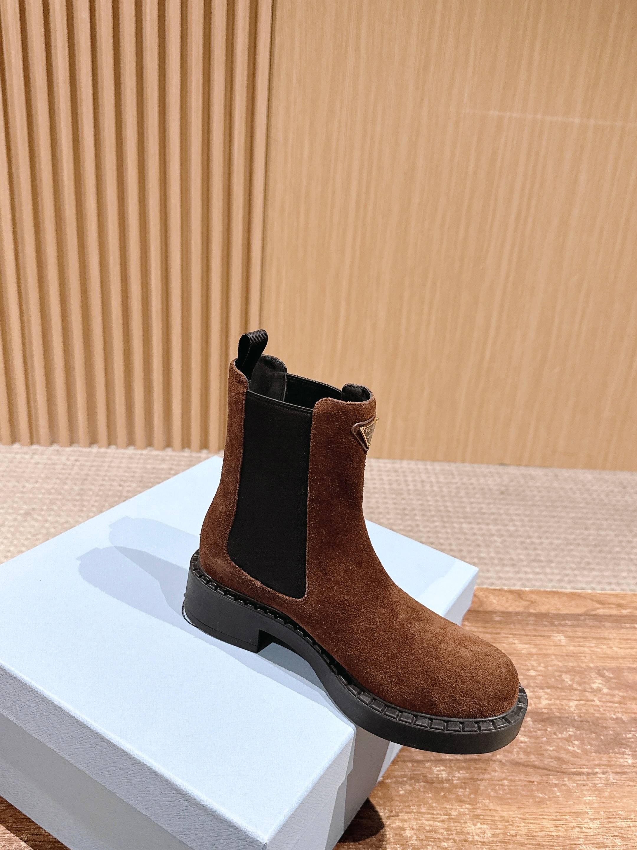 𝐏𝐑𝐀𝐃𝐀 普拉达经典款三角标烟管靴 切尔西裸靴 这两年三角标系列产品可谓是风靡整个鞋圈 这款鞋真的是很耐看越看越喜欢! 普拉达这款的设计跟以往的风格并不一样 复古军靴的切尔西的设计感 超酷! 麂皮材质 牛皮里 原版TPU大底 Size:35-39(40/41定做不退换)