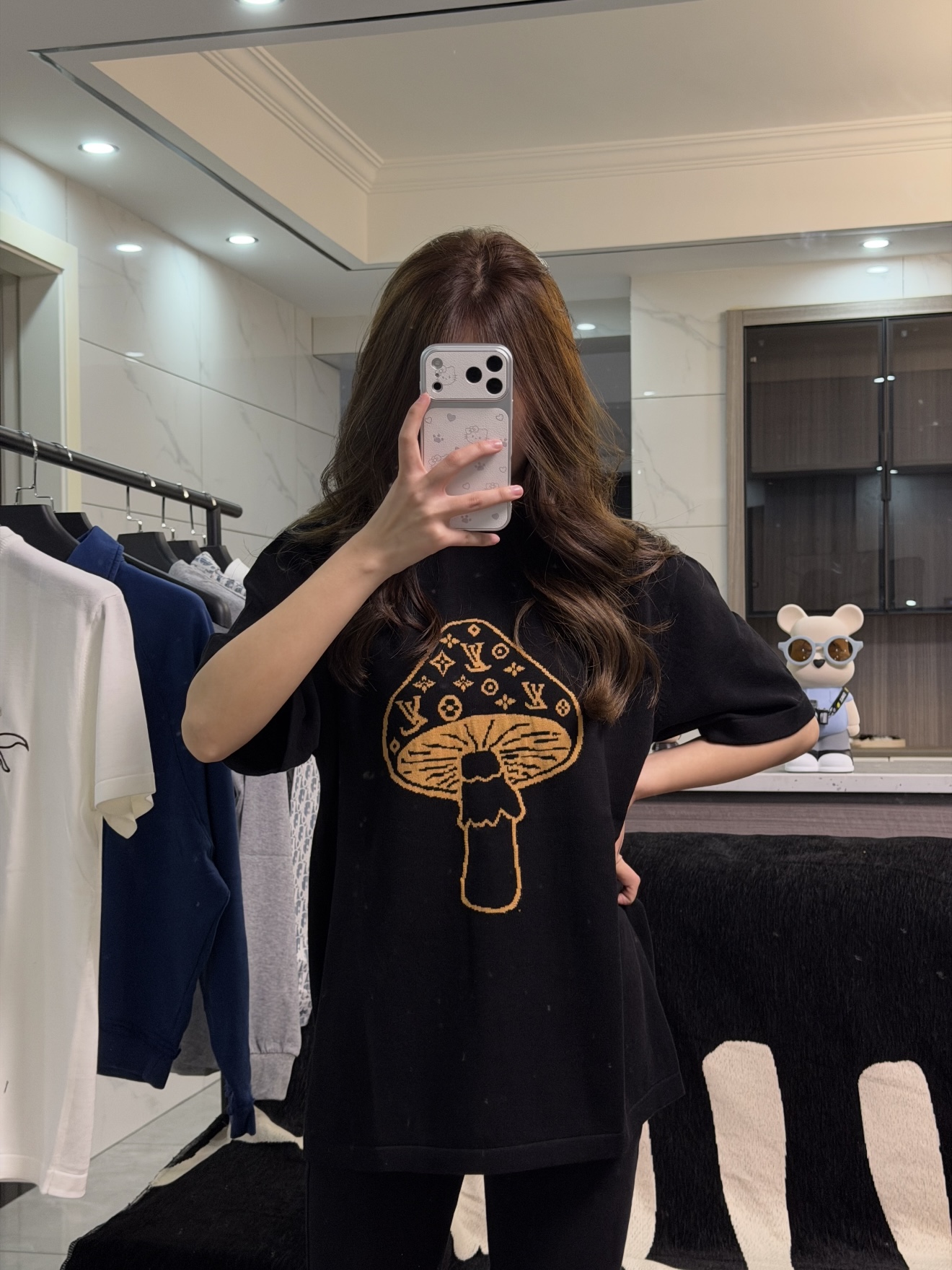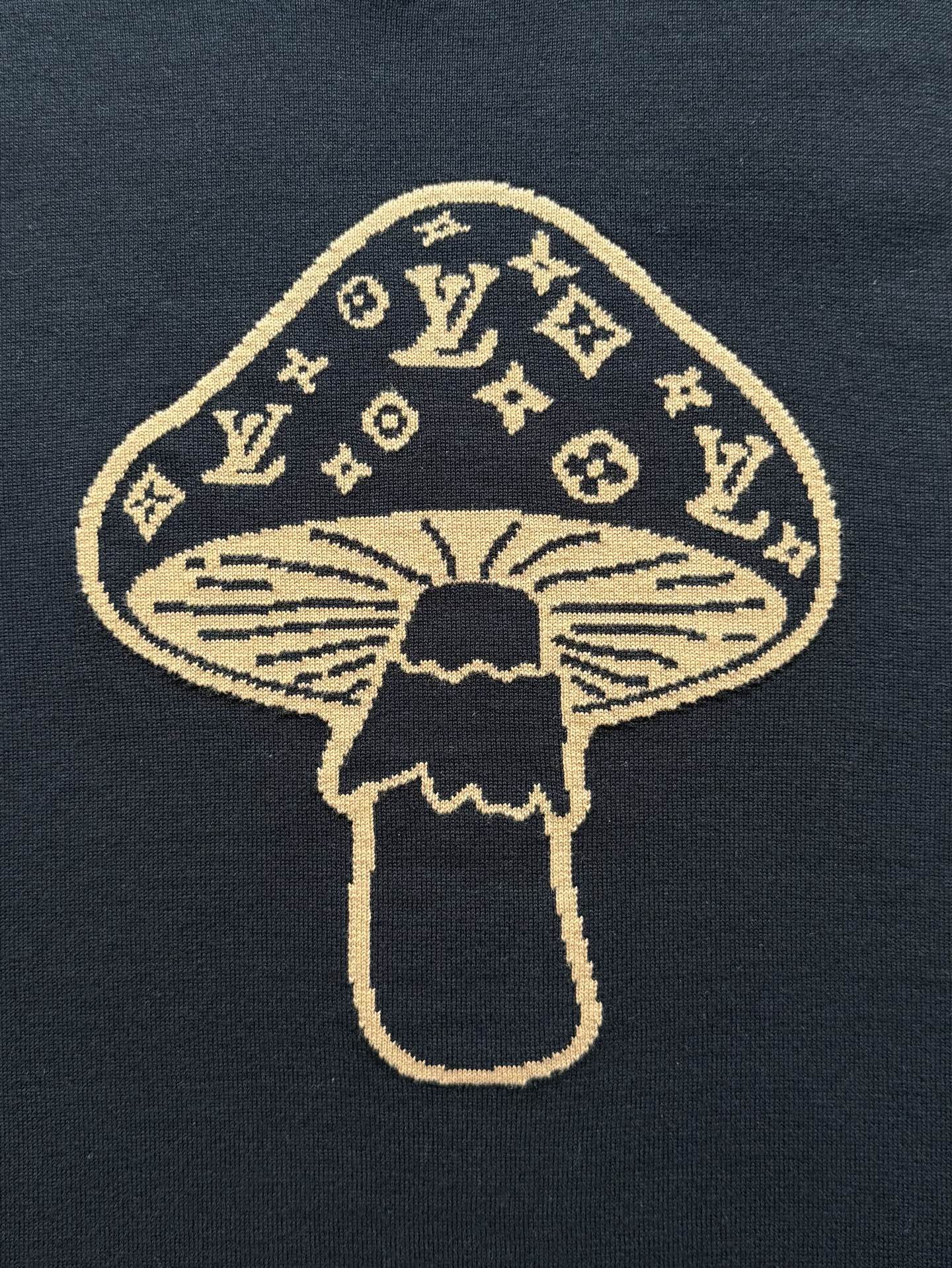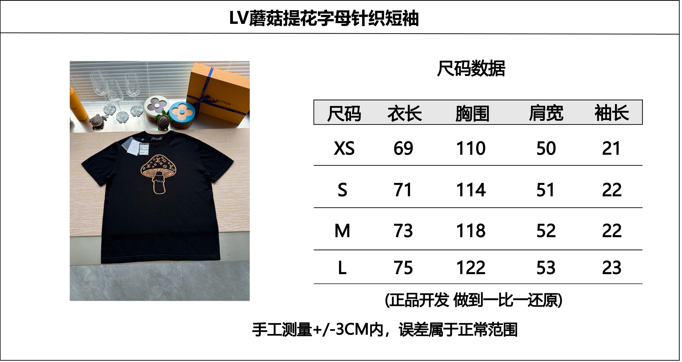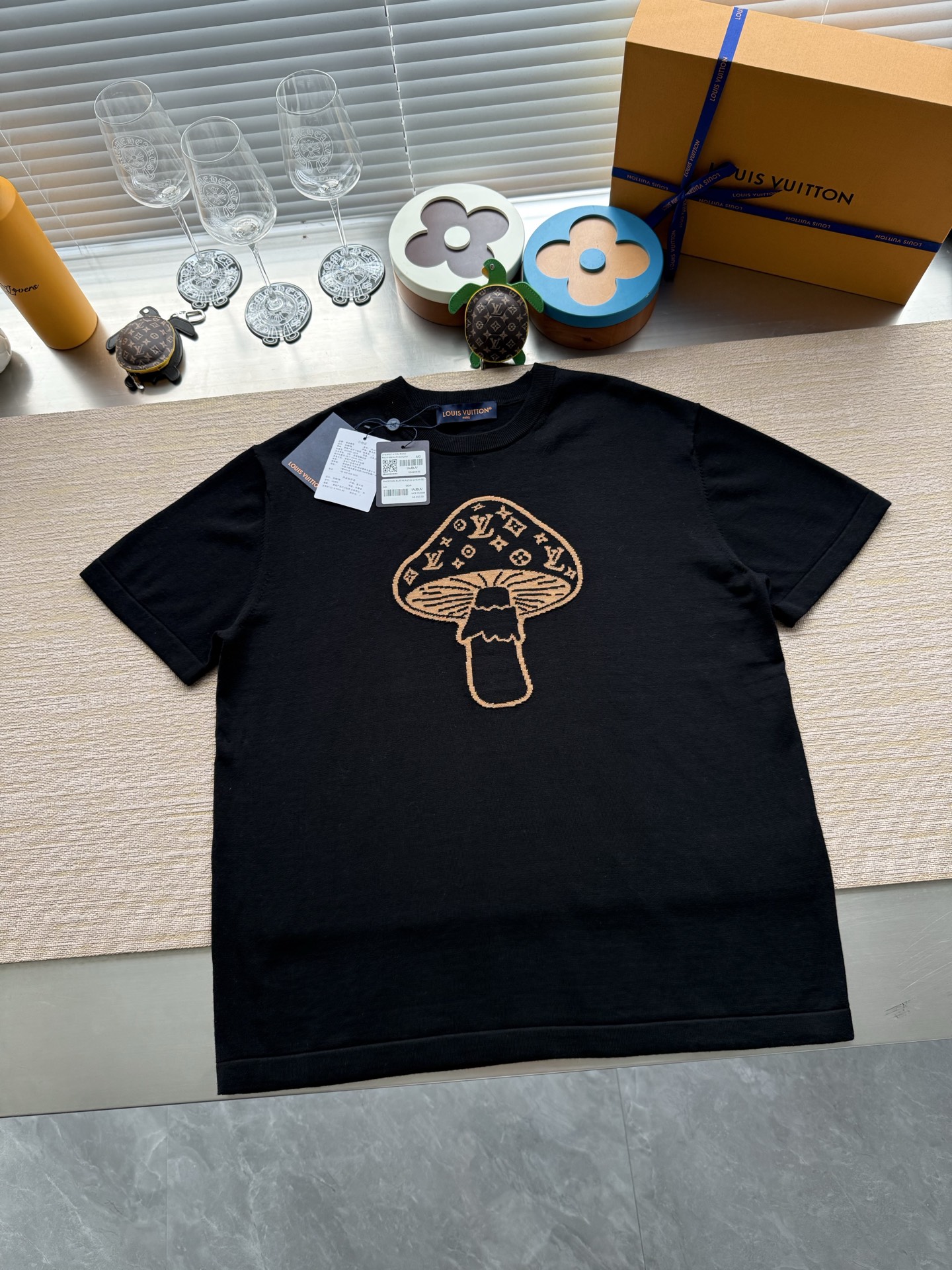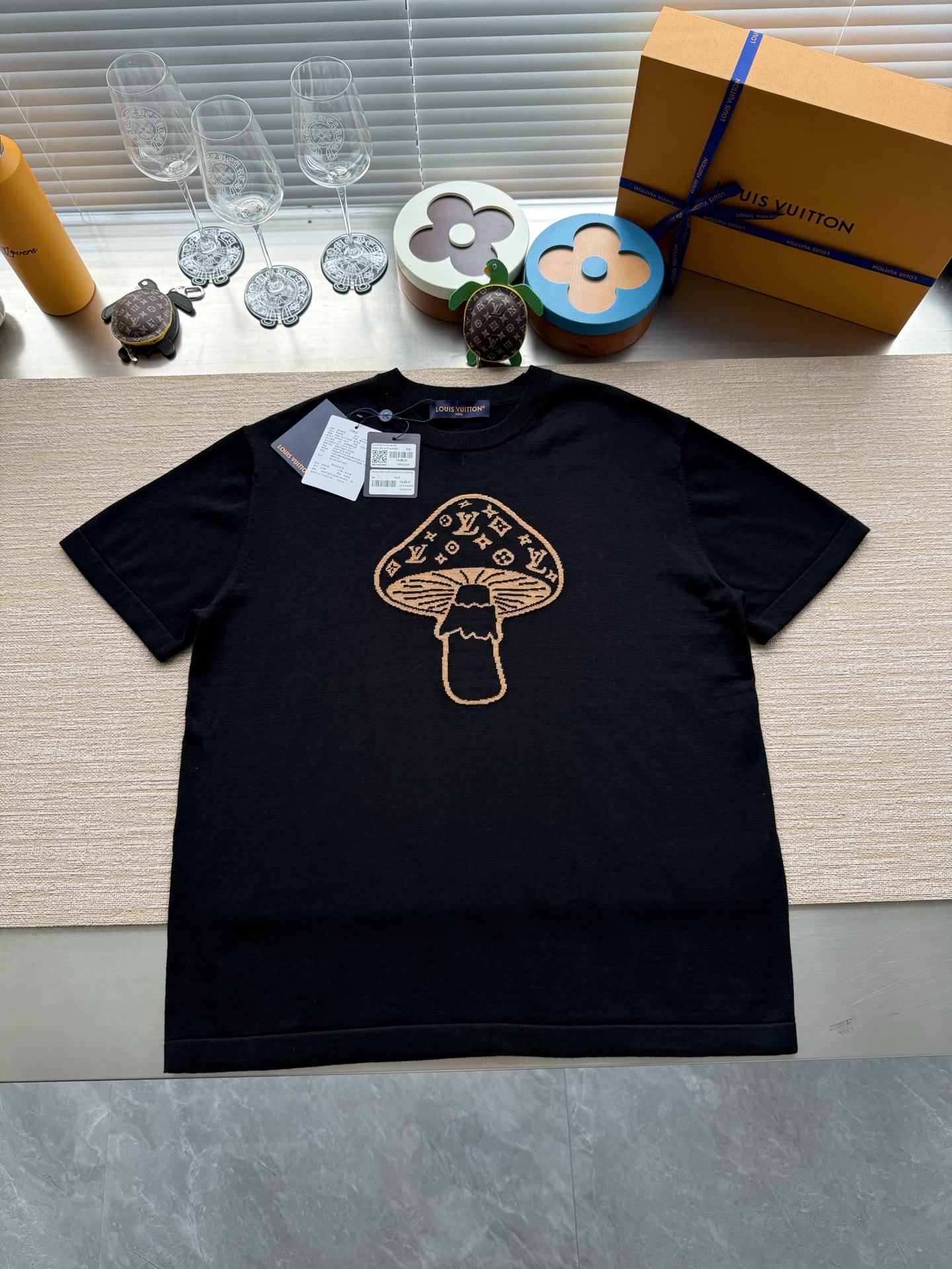 Louis Vuitton25ss蘑菇提花字母针织短袖‼️整件衣服8950购买ZP拆解打造,采用定制黑色棉质针织面料,做到100%全棉进口纱线,意大利制造,前幅饰以蘑菇图案字母标识提花,提花做到与面料融为一体,定织标志性罗纹领口 袖口 下摆,超紧密度局部编织,真正做到1:1copy 码数:XS S M L