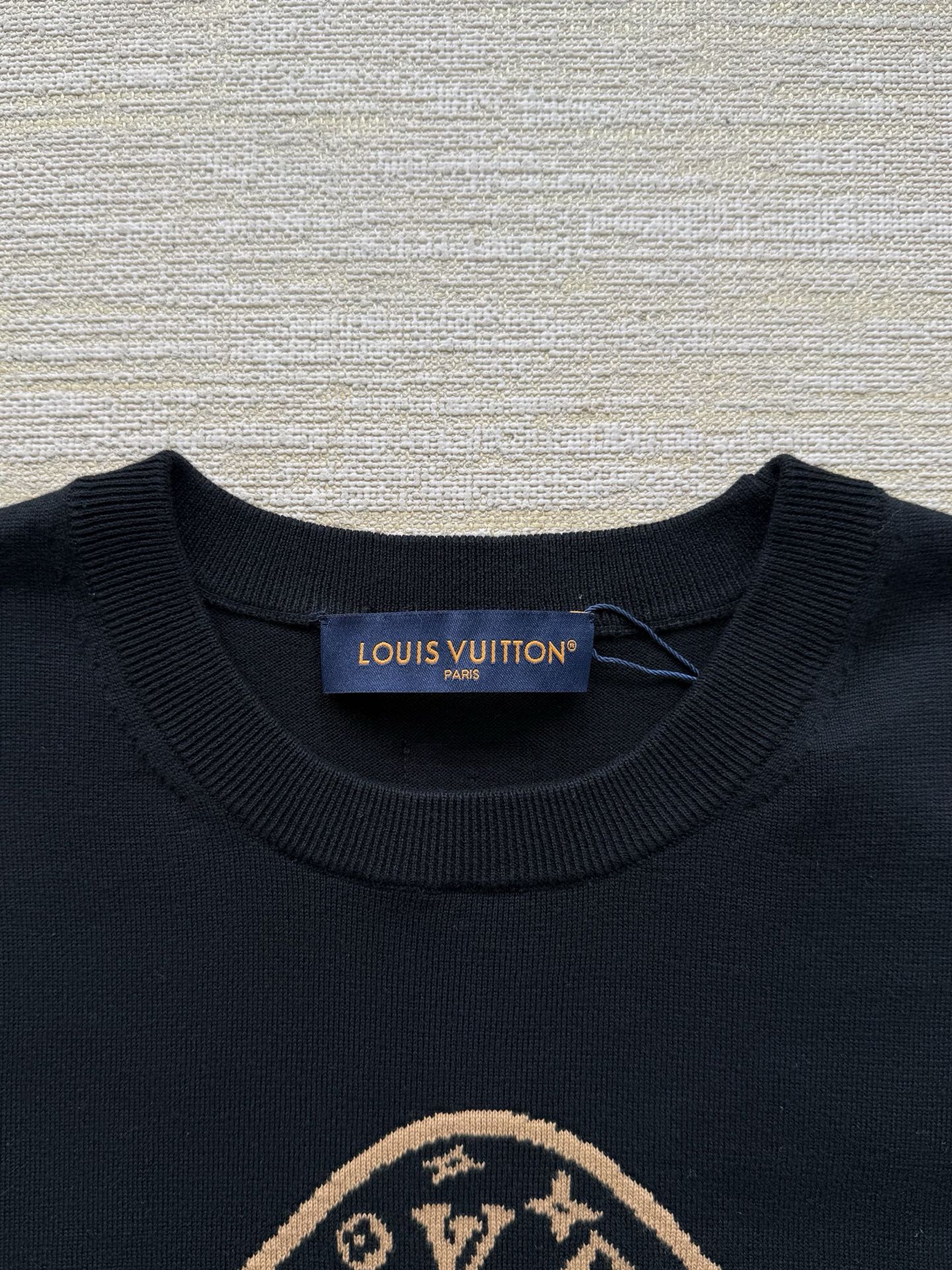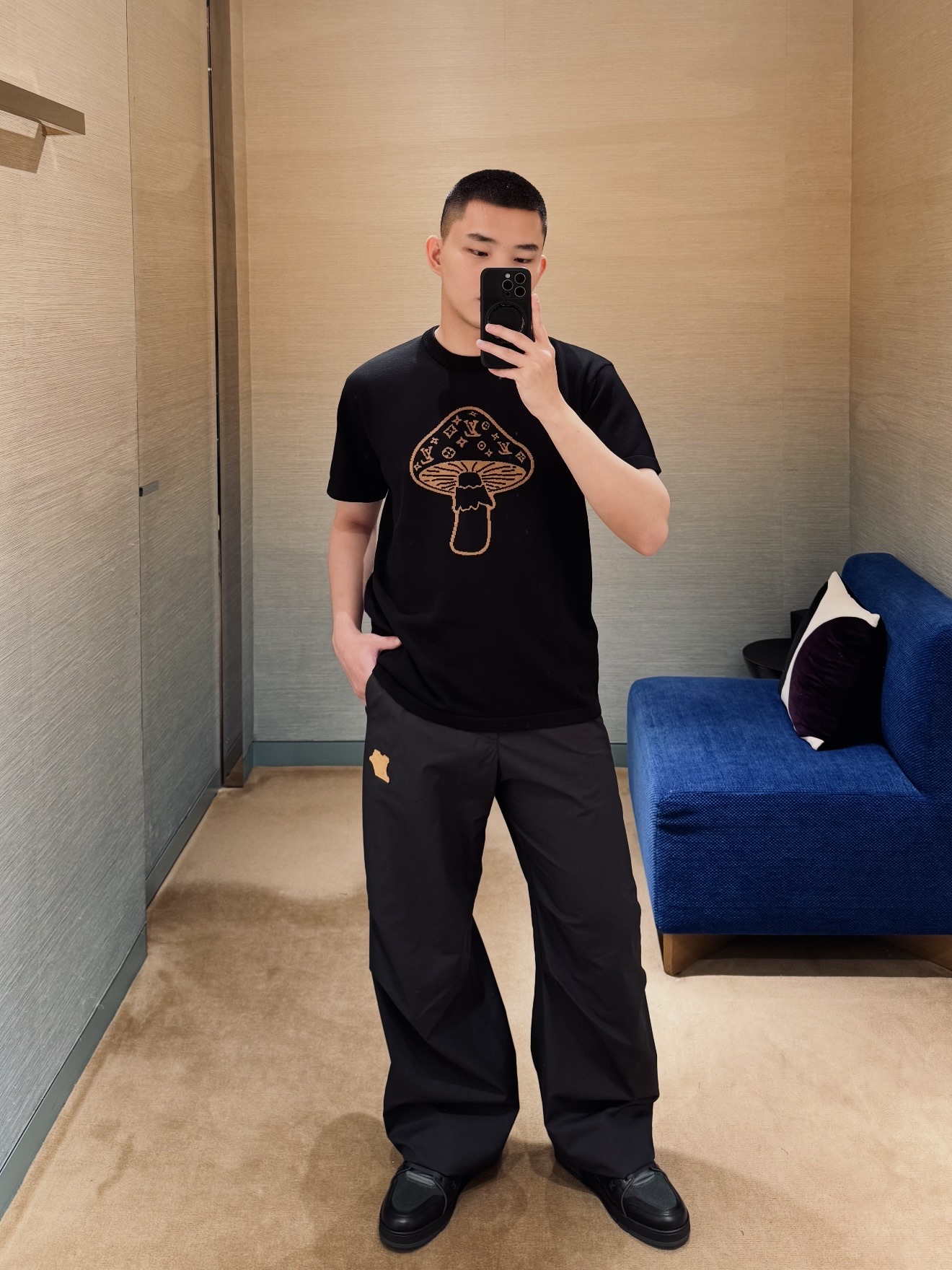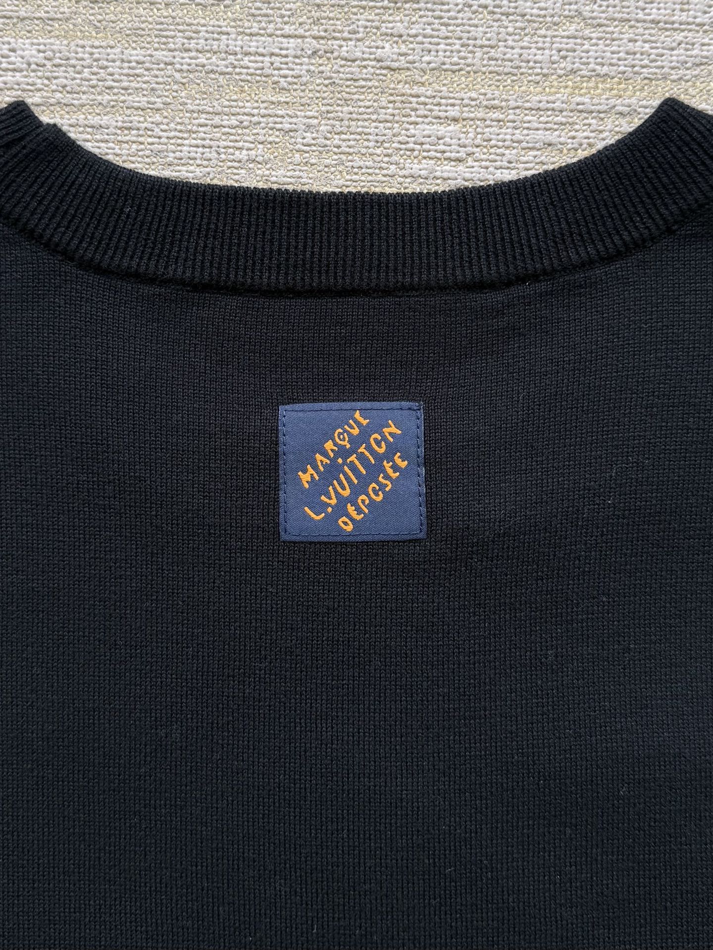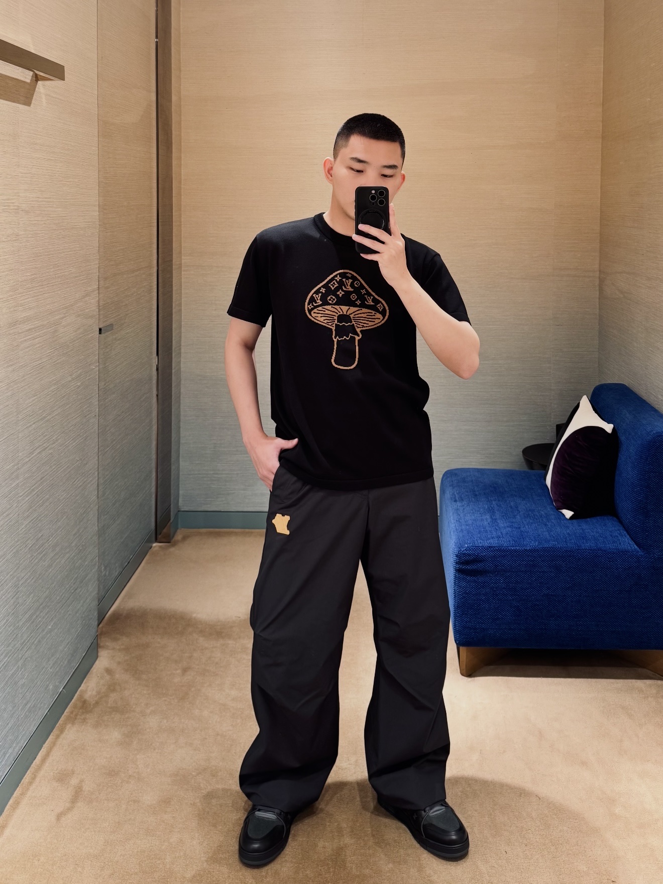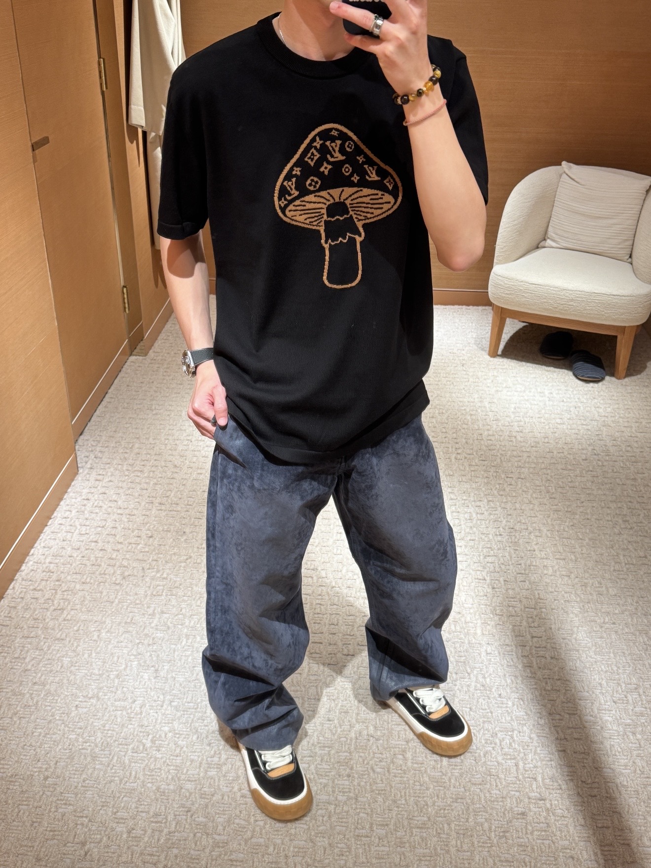 Louis Vuitton25ss蘑菇提花字母针织短袖‼️整件衣服8950购买ZP拆解打造,采用定制黑色棉质针织面料,做到100%全棉进口纱线,意大利制造,前幅饰以蘑菇图案字母标识提花,提花做到与面料融为一体,定织标志性罗纹领口 袖口 下摆,超紧密度局部编织,真正做到1:1copy 码数:XS S M L