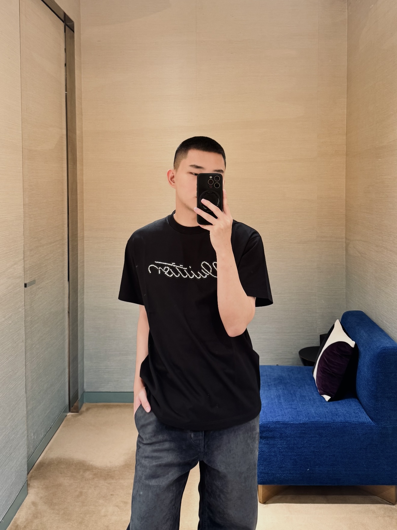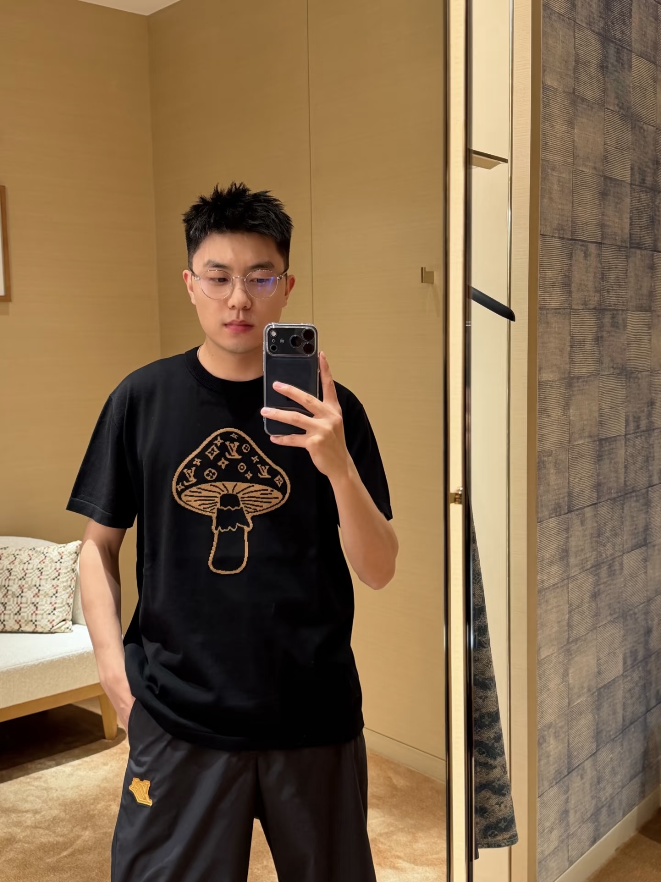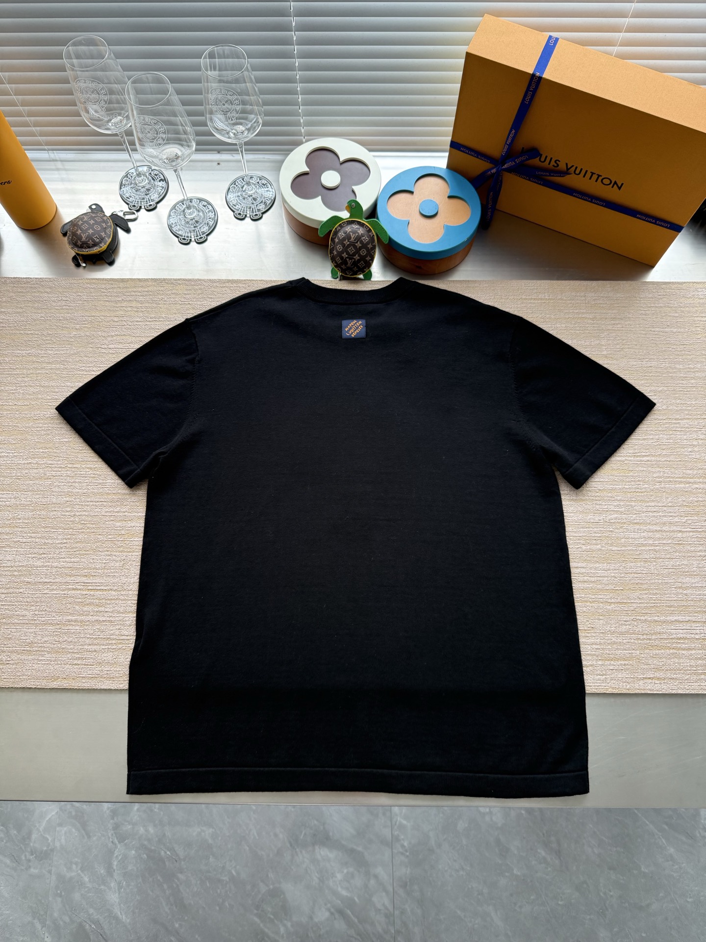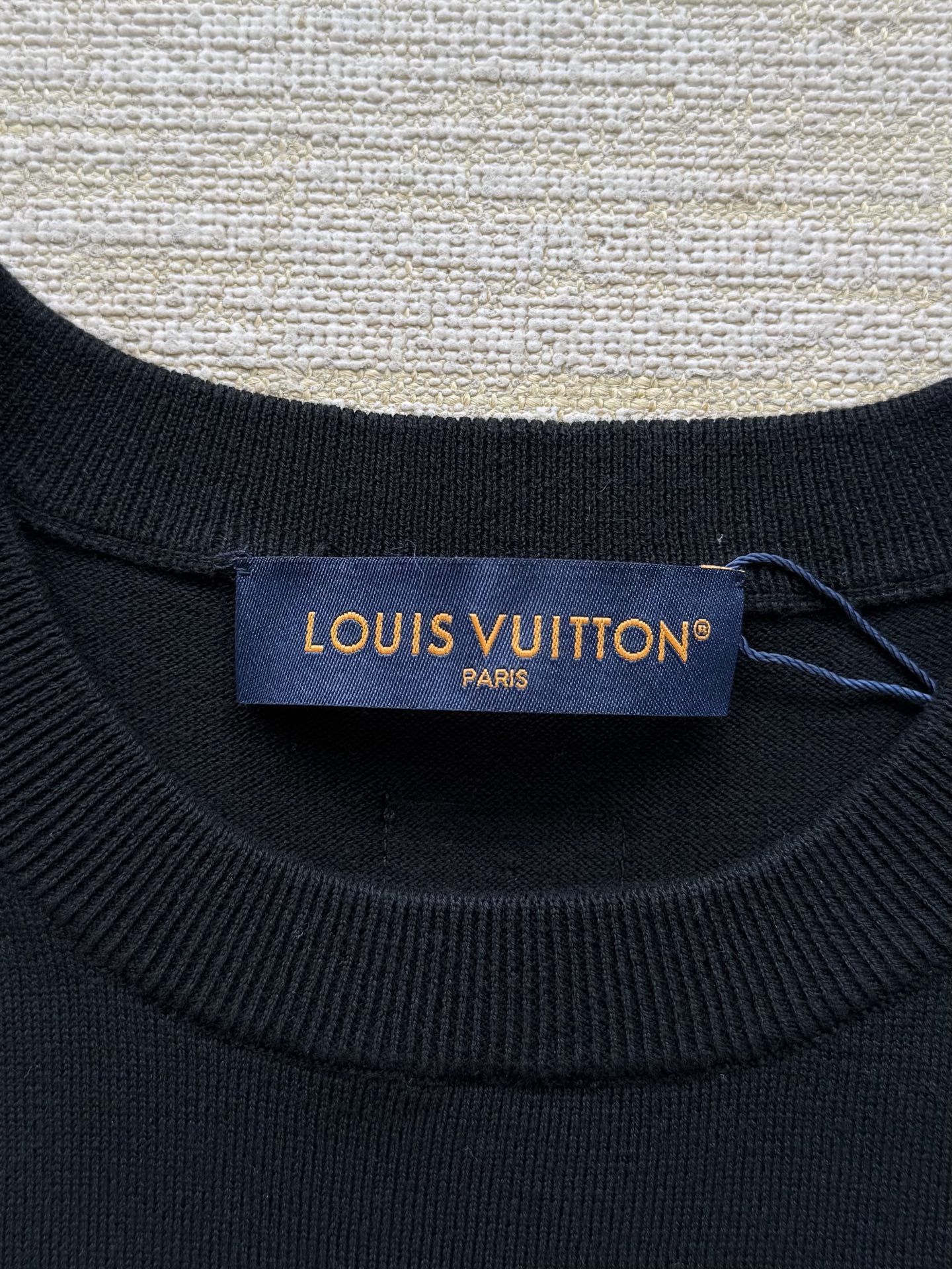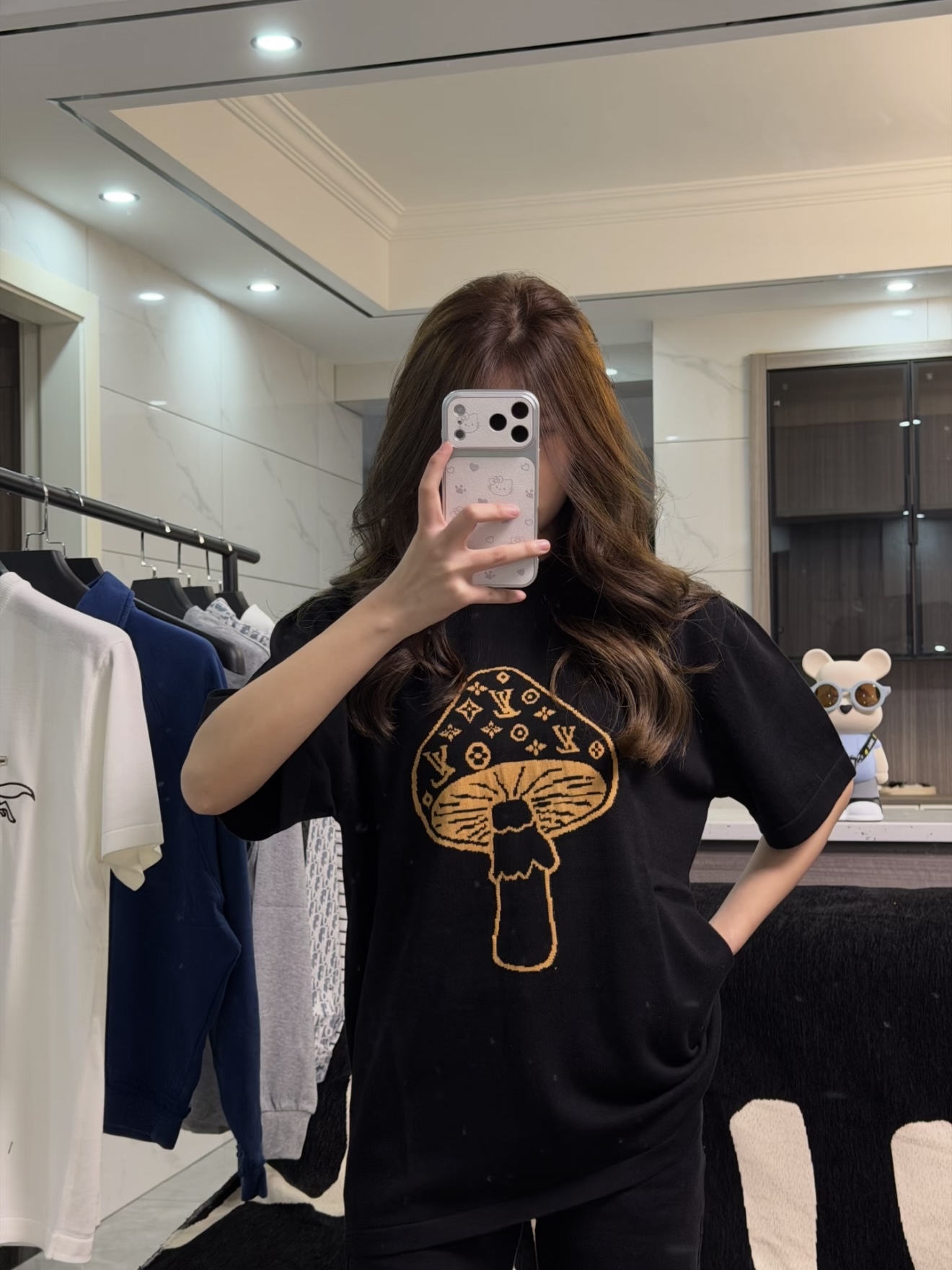 Louis Vuitton25ss蘑菇提花字母针织短袖‼️整件衣服8950购买ZP拆解打造,采用定制黑色棉质针织面料,做到100%全棉进口纱线,意大利制造,前幅饰以蘑菇图案字母标识提花,提花做到与面料融为一体,定织标志性罗纹领口 袖口 下摆,超紧密度局部编织,真正做到1:1copy 码数:XS S M L