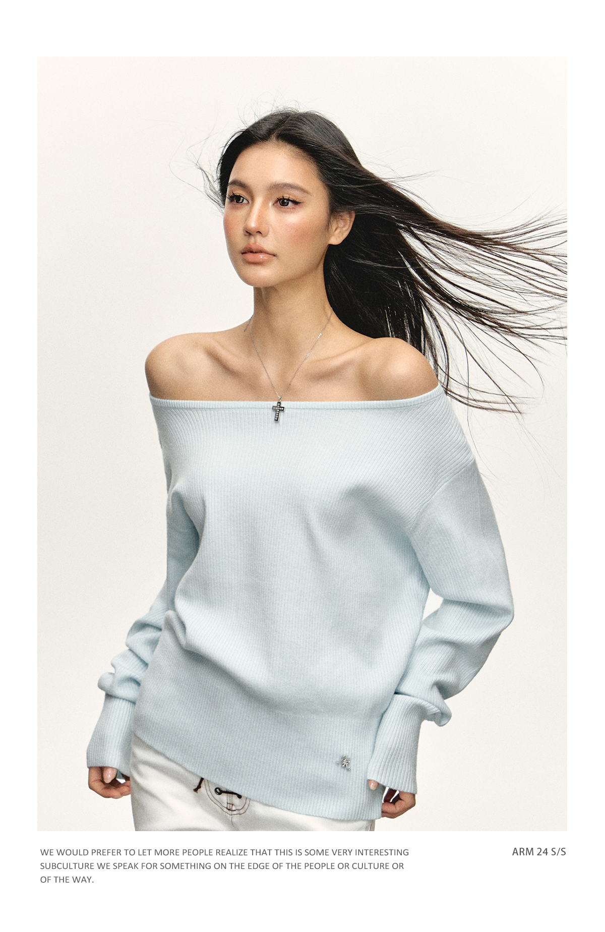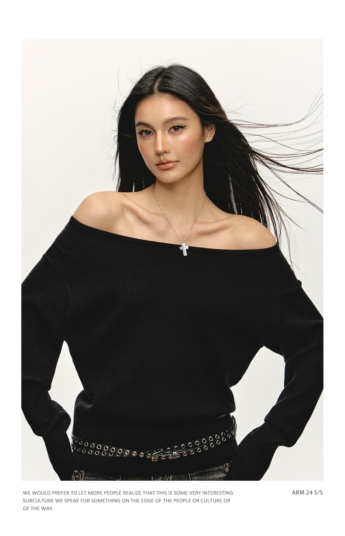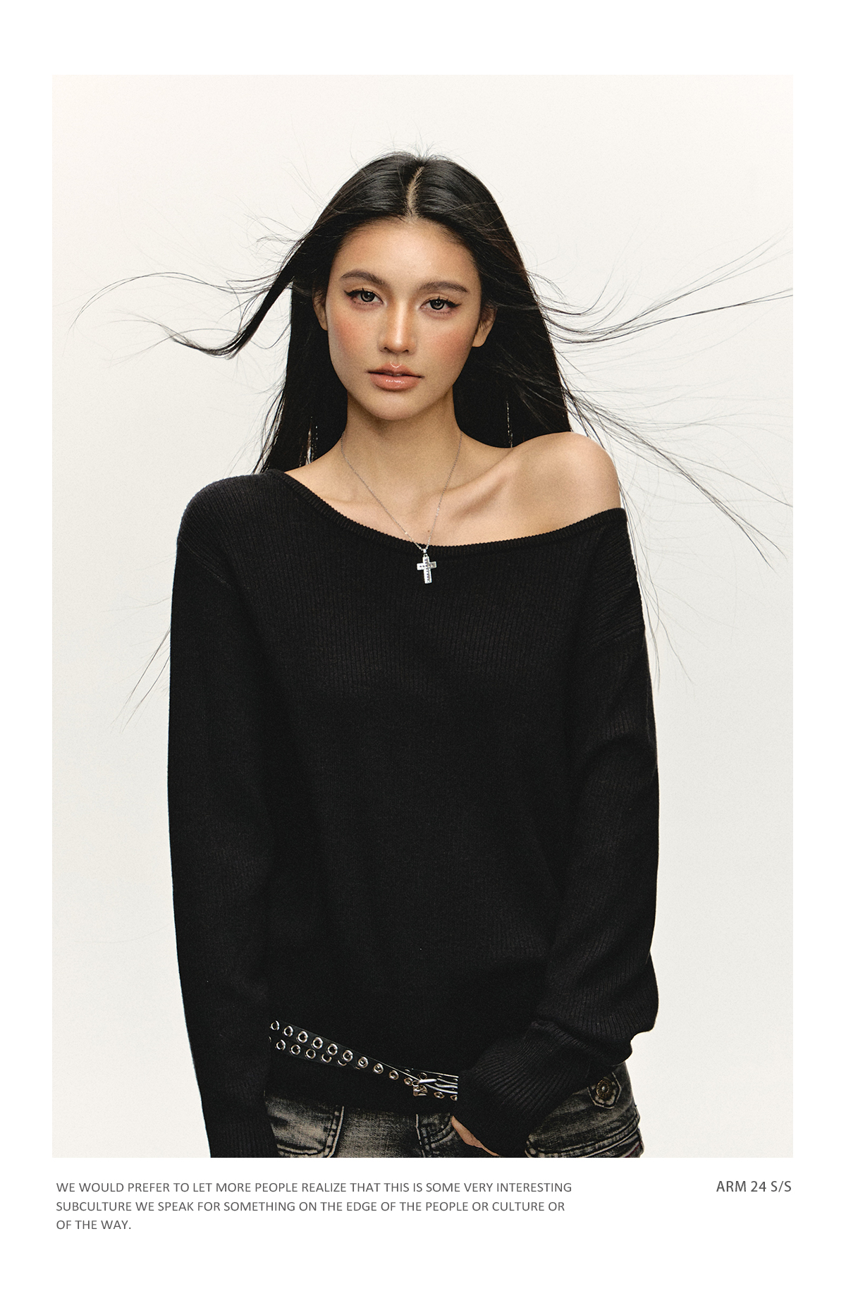 Ariseism 美式复古斜肩套头长袖针织衫女春季新款内搭打底上衣