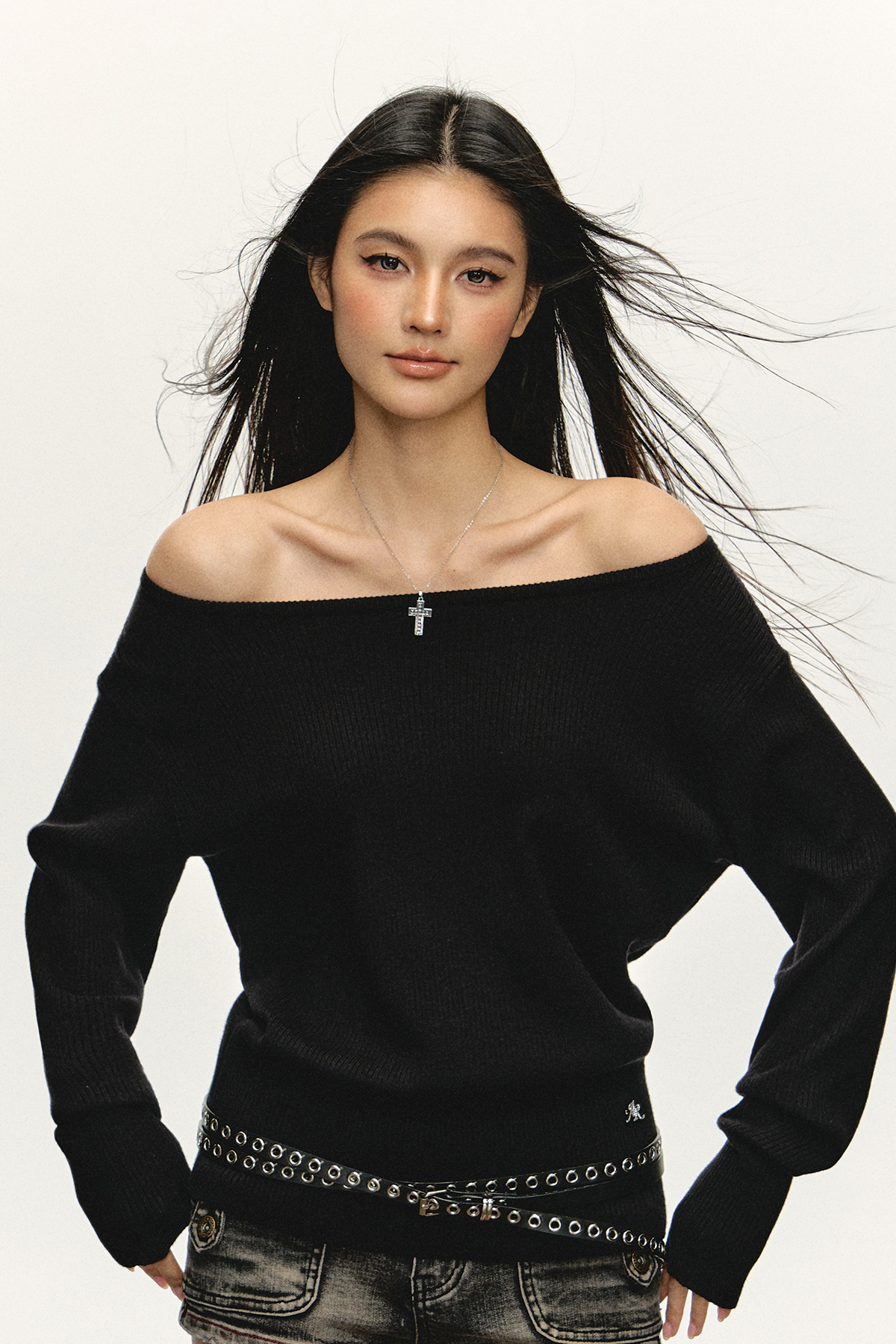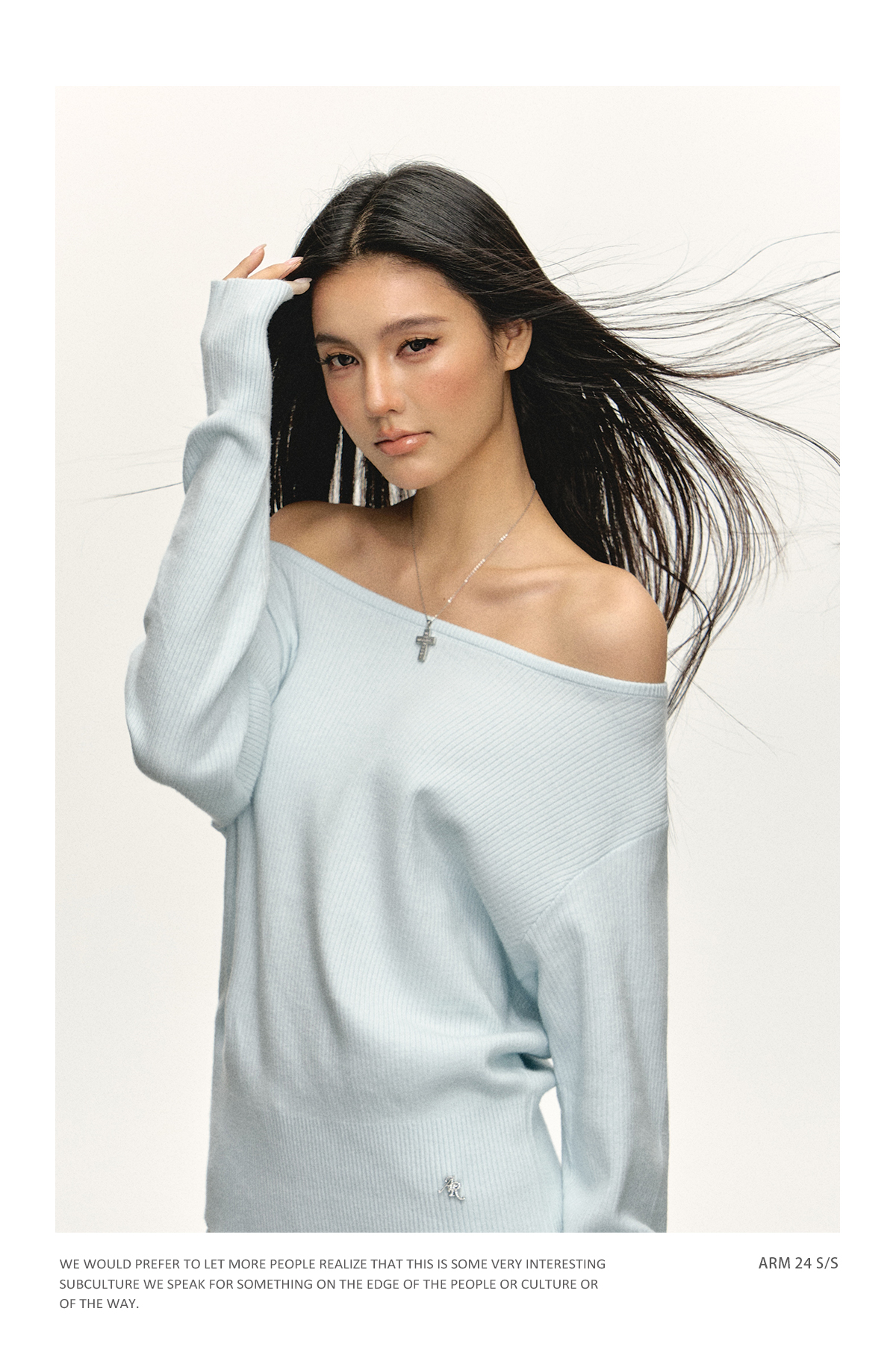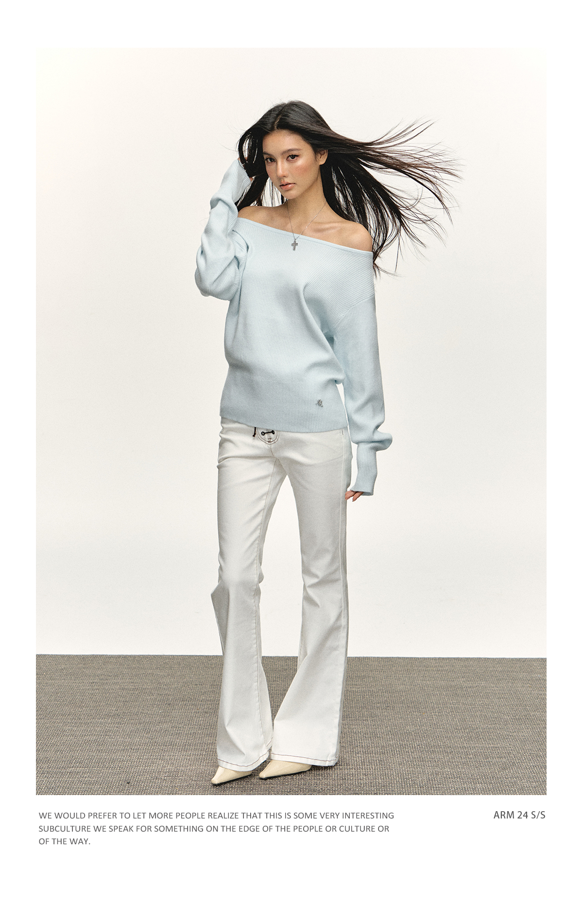 Ariseism 美式复古斜肩套头长袖针织衫女春季新款内搭打底上衣