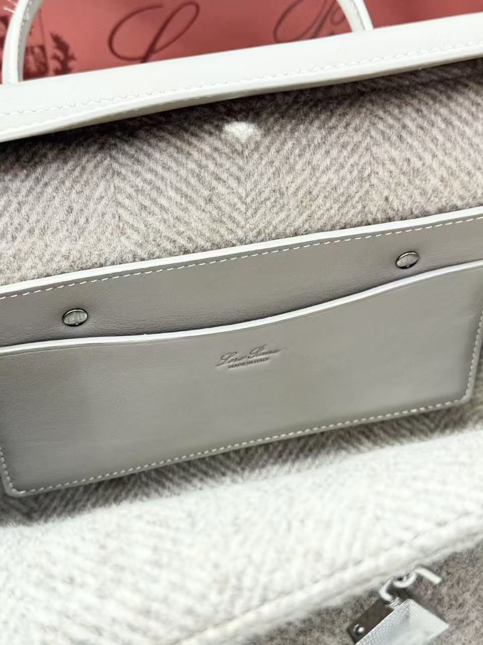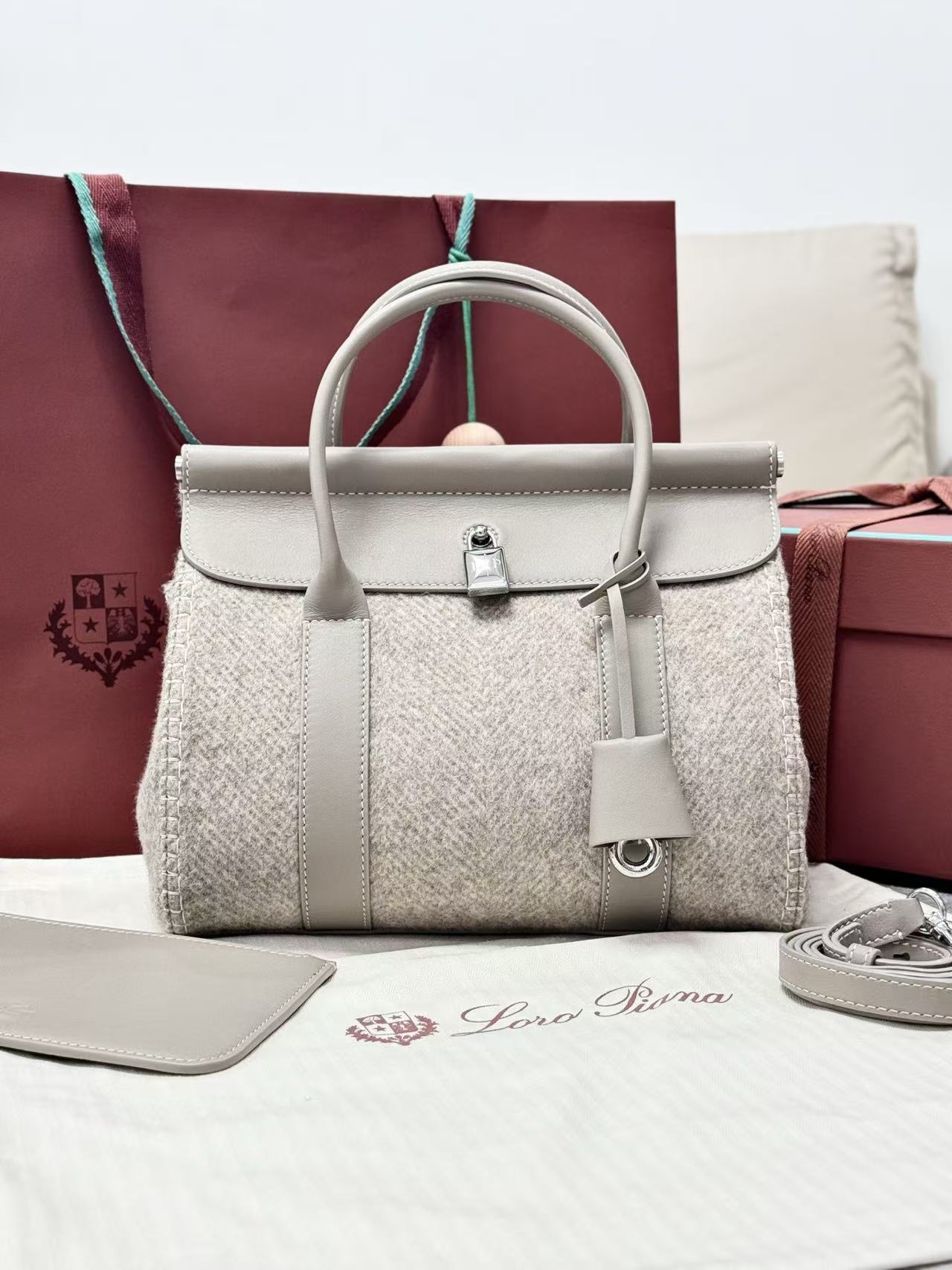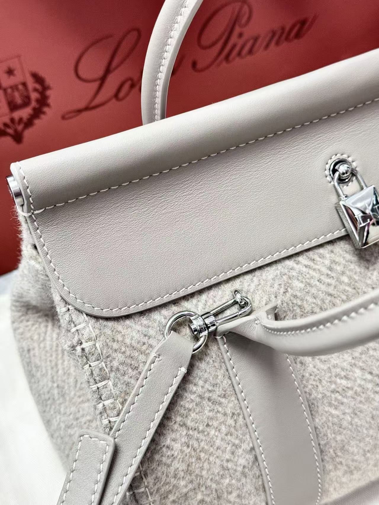 这款手袋采用采用羊绒面料匠心打造,饰以别具一格的人字纹图案,点缀精致挂锁,既可闭合佩戴,也可敞开营造更率性洒脱的造型,尽显标志性格调。下方配有金属条,皮革提手。饰有标志性可更换Loro Piana吊饰,压印徽标的皮革开口内袋,可拆卸皮革内袋,羊绒衬里,底部环形护脚,手袋正面底部压印同色系徽标。
