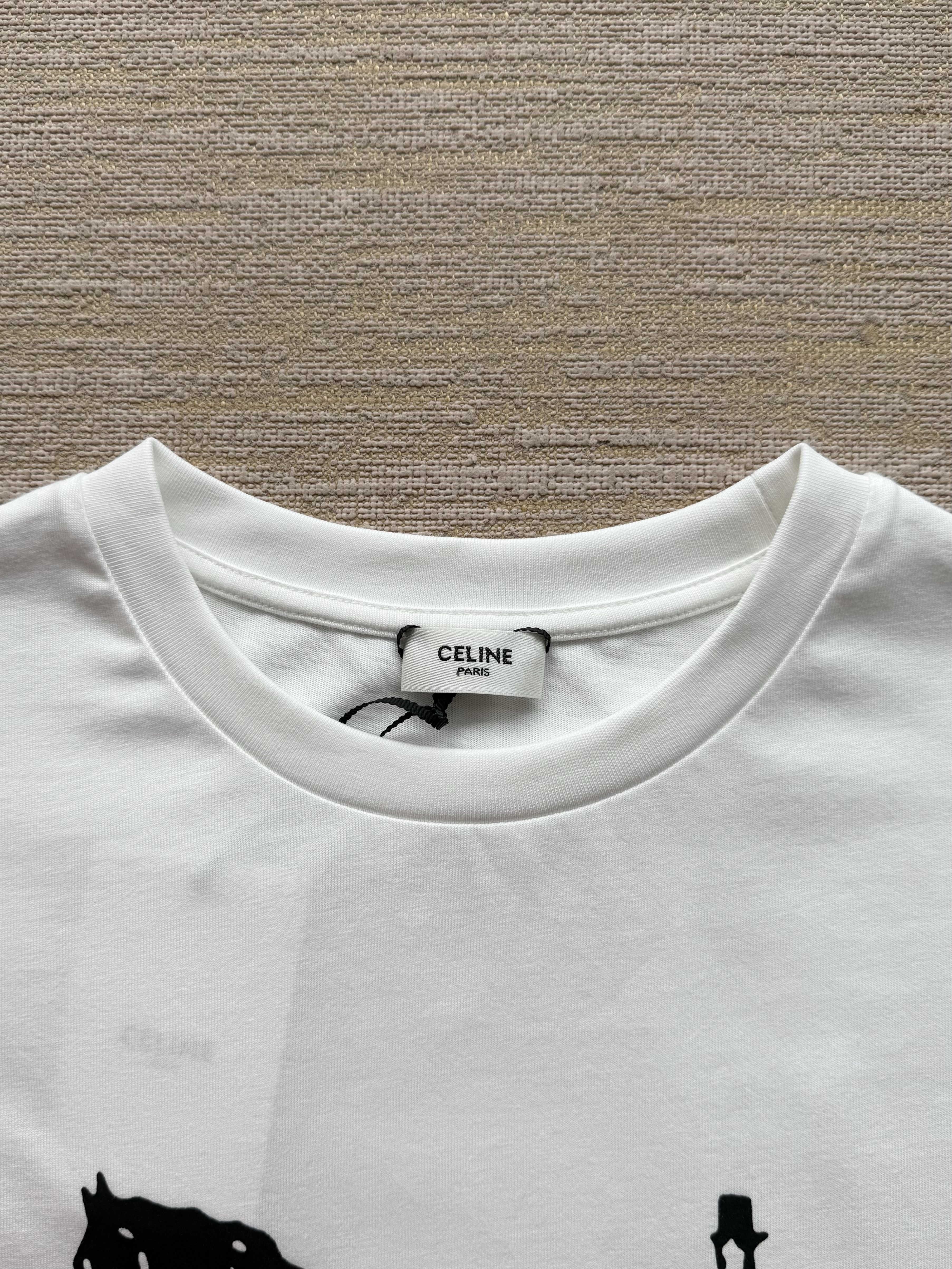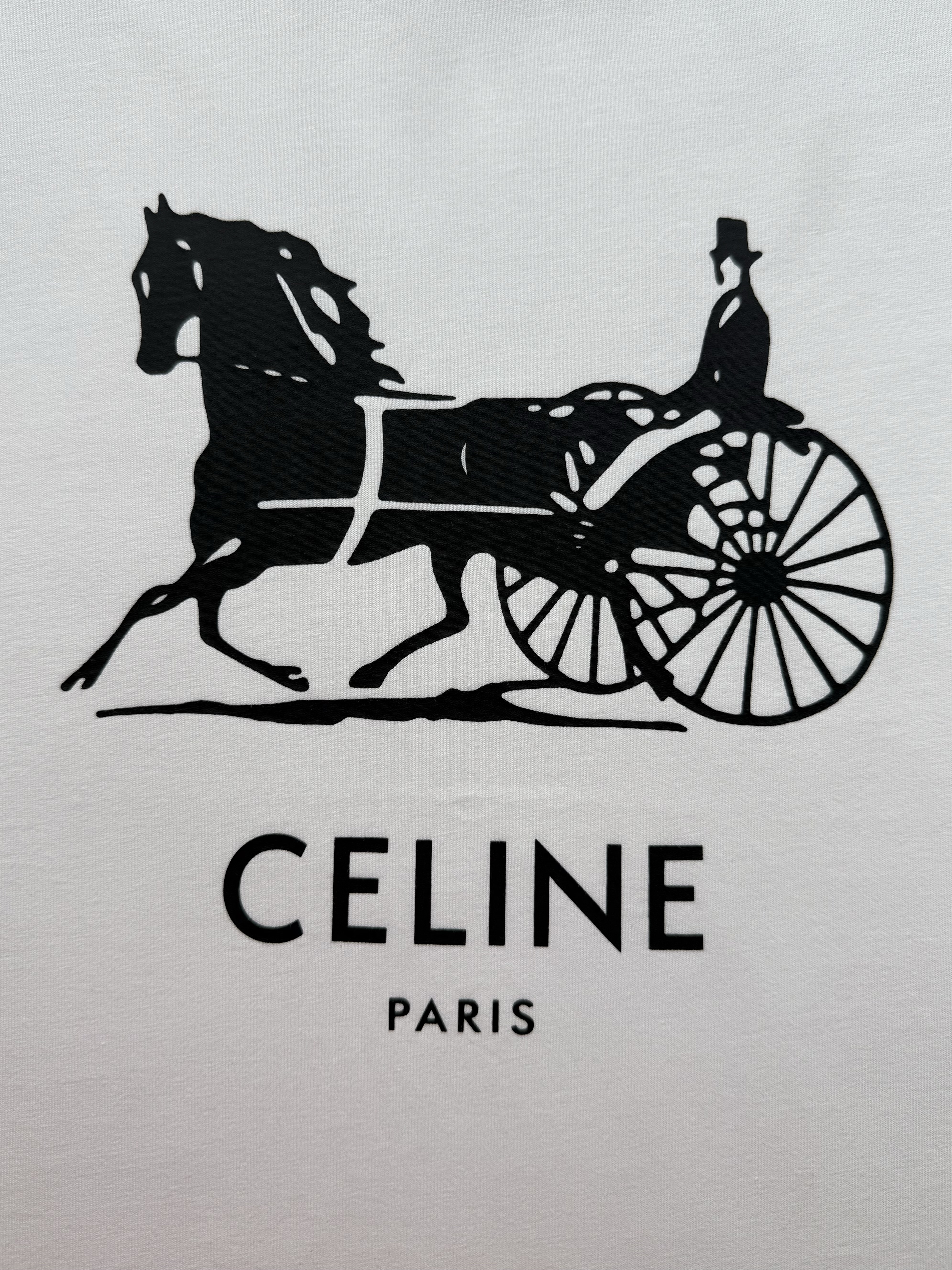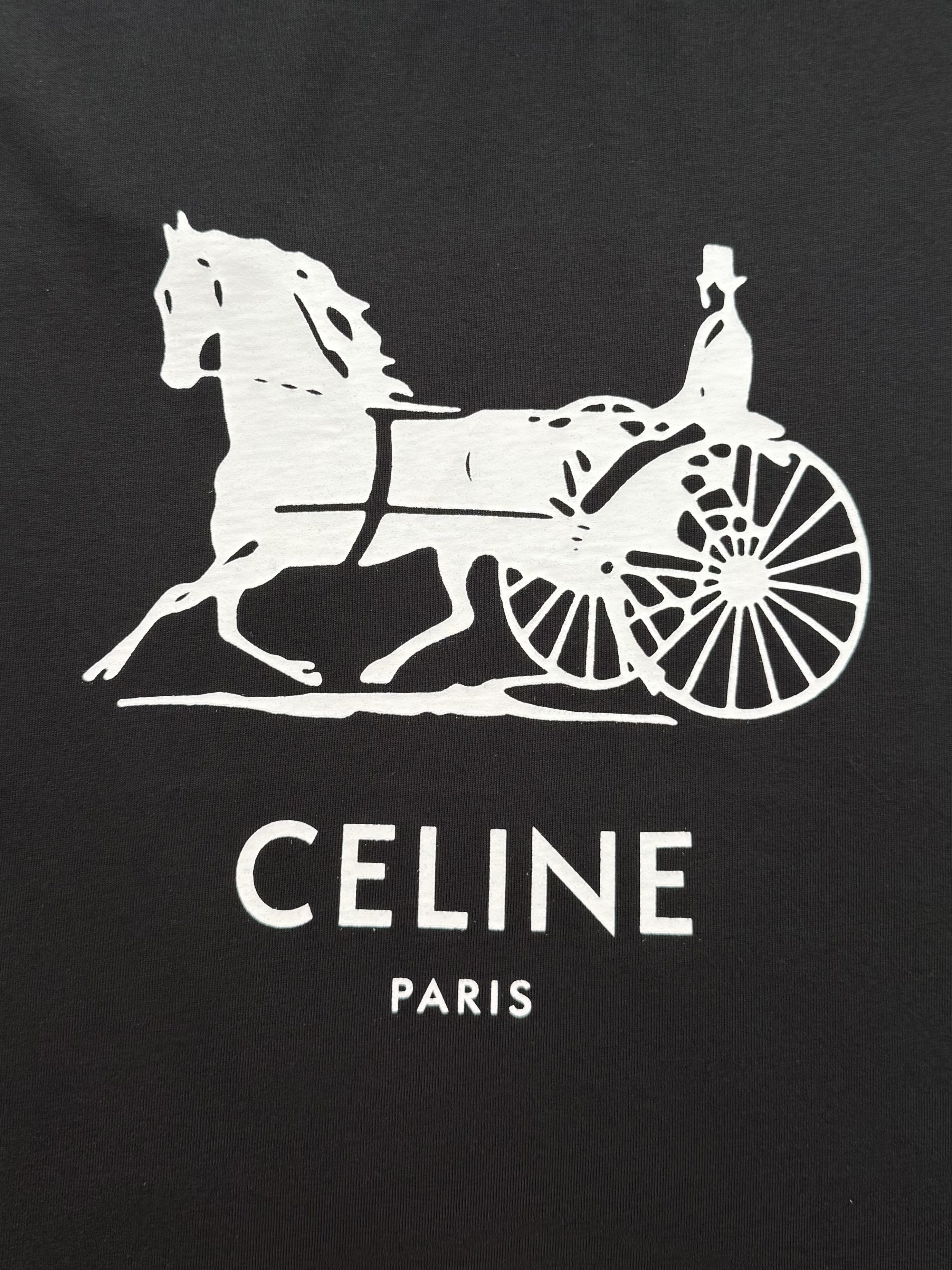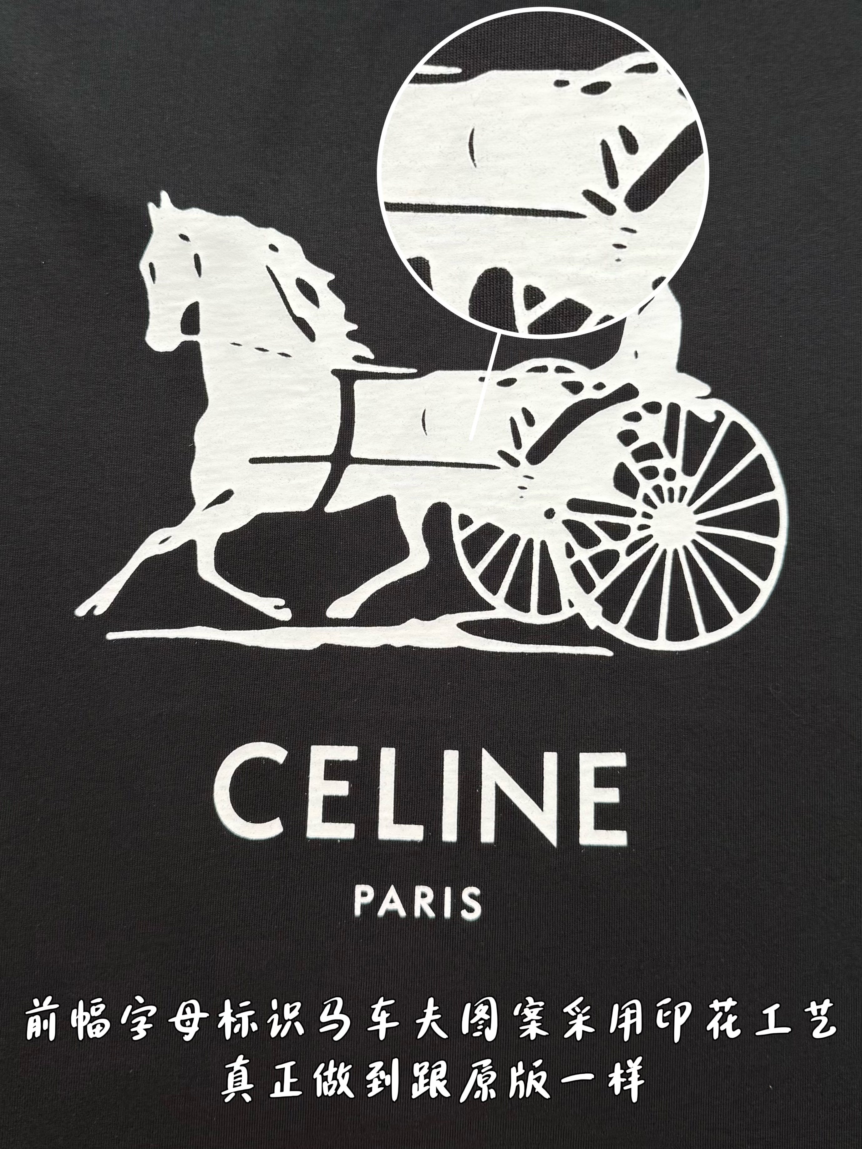 Celine 25ss字母标识马车印花短袖T恤‼️整件衣服4900购买ZP拆解打造,定制定染黑色纯棉面料,做到100%全棉进口纱线,意大利进口制造,定织标志性罗纹领口,前幅饰以字母标识马车夫图案印花,袖口 下摆双层锁边超高密度走线,真正做到1:1copy 闭眼入 码数:XS S M L