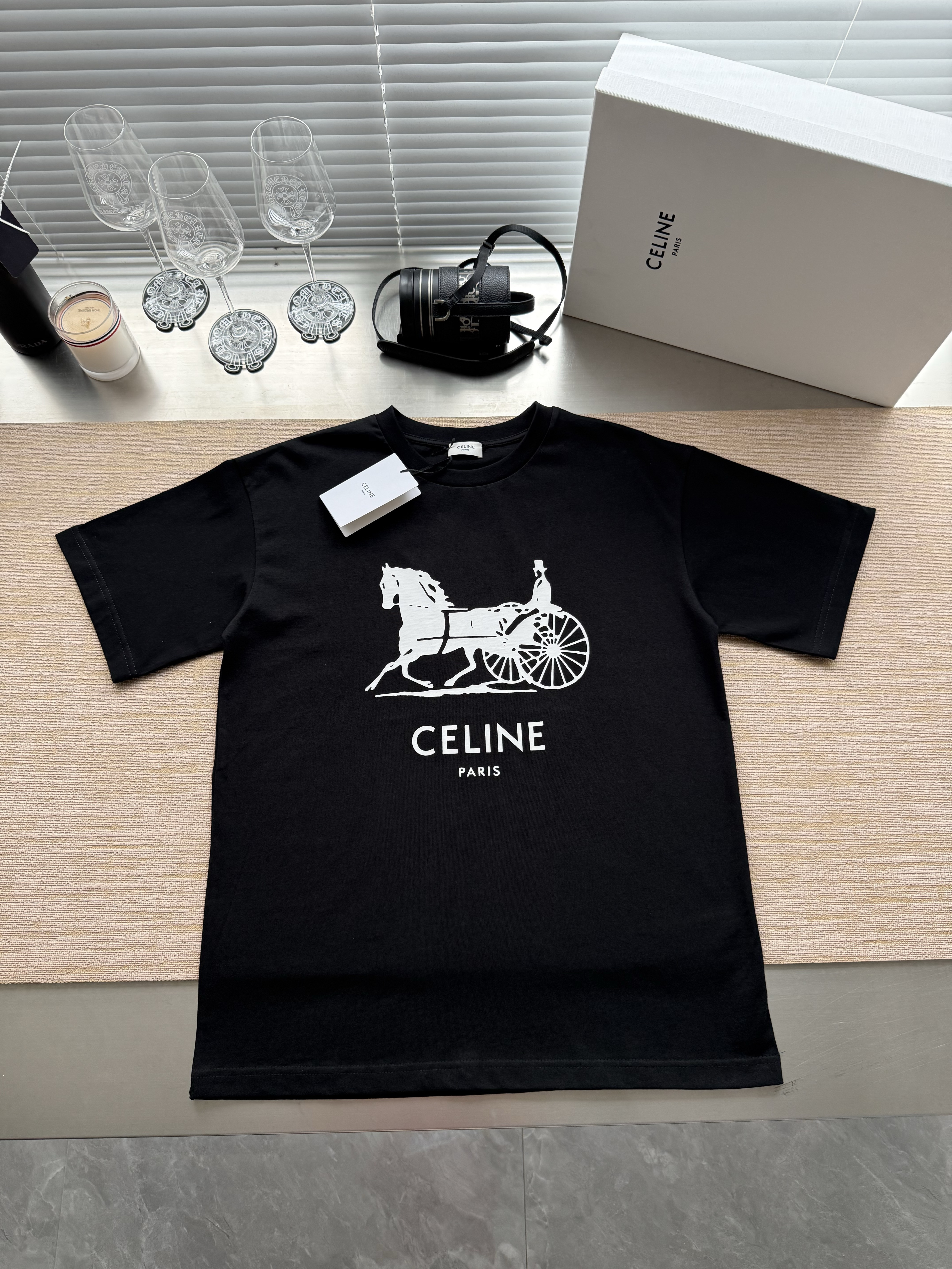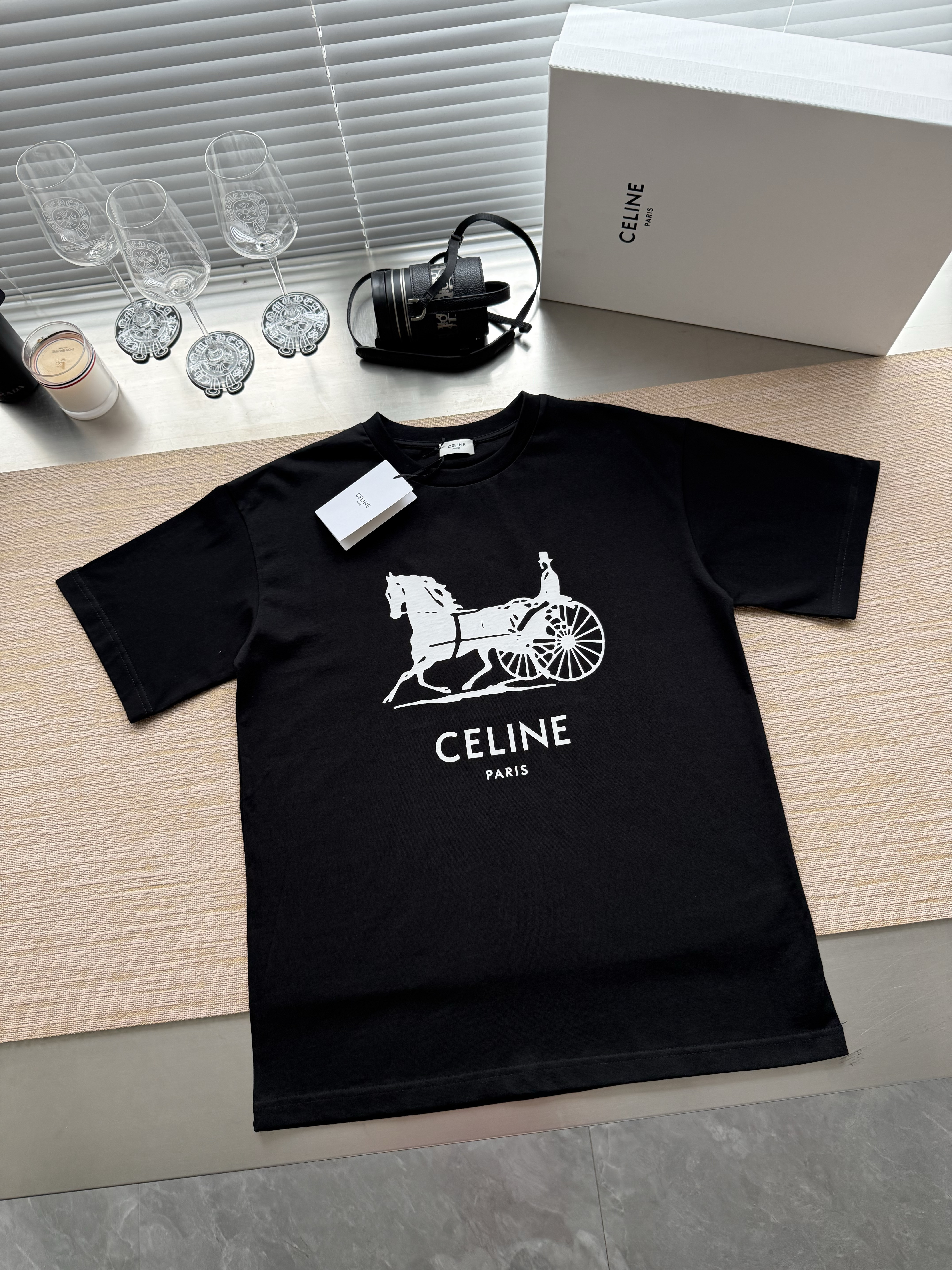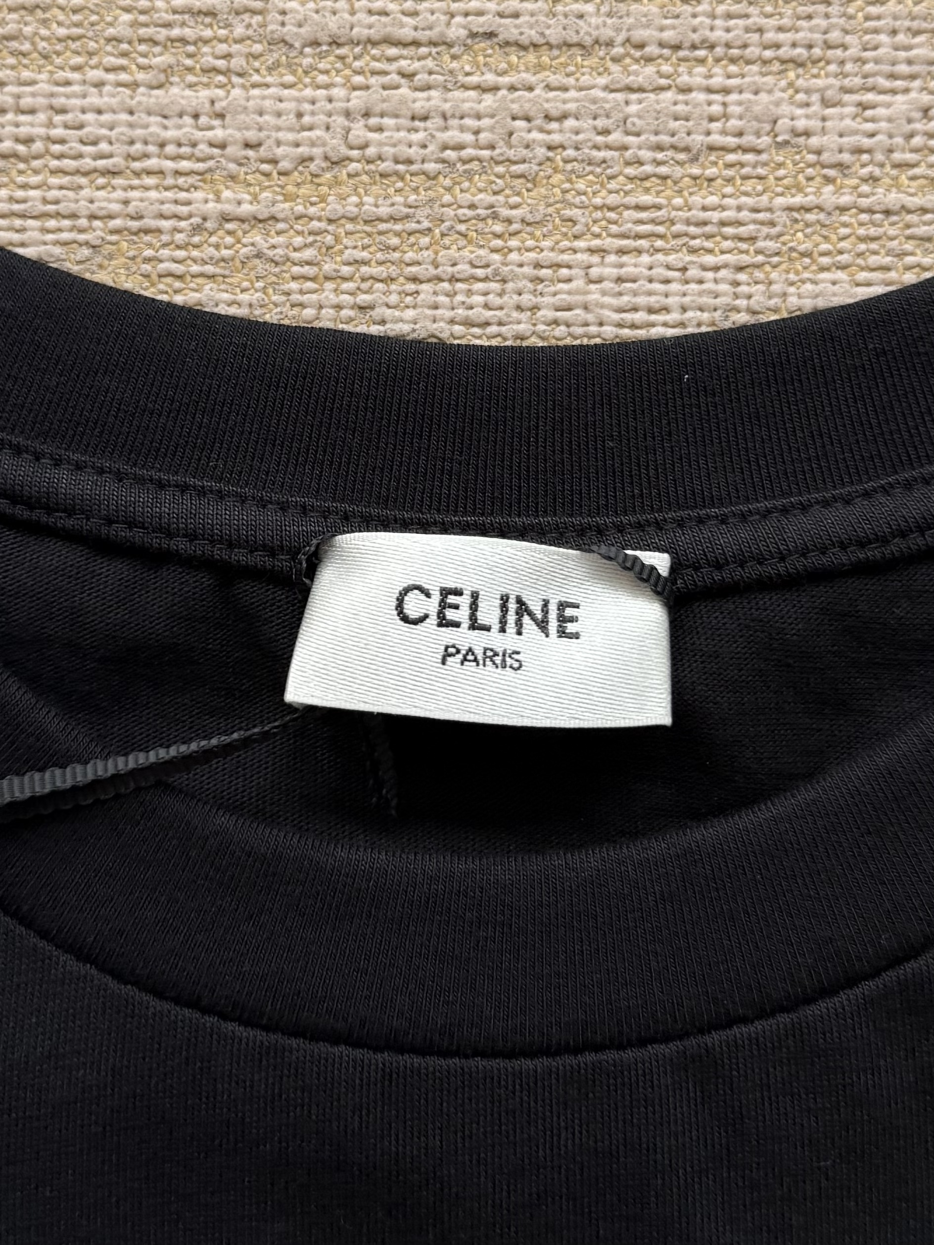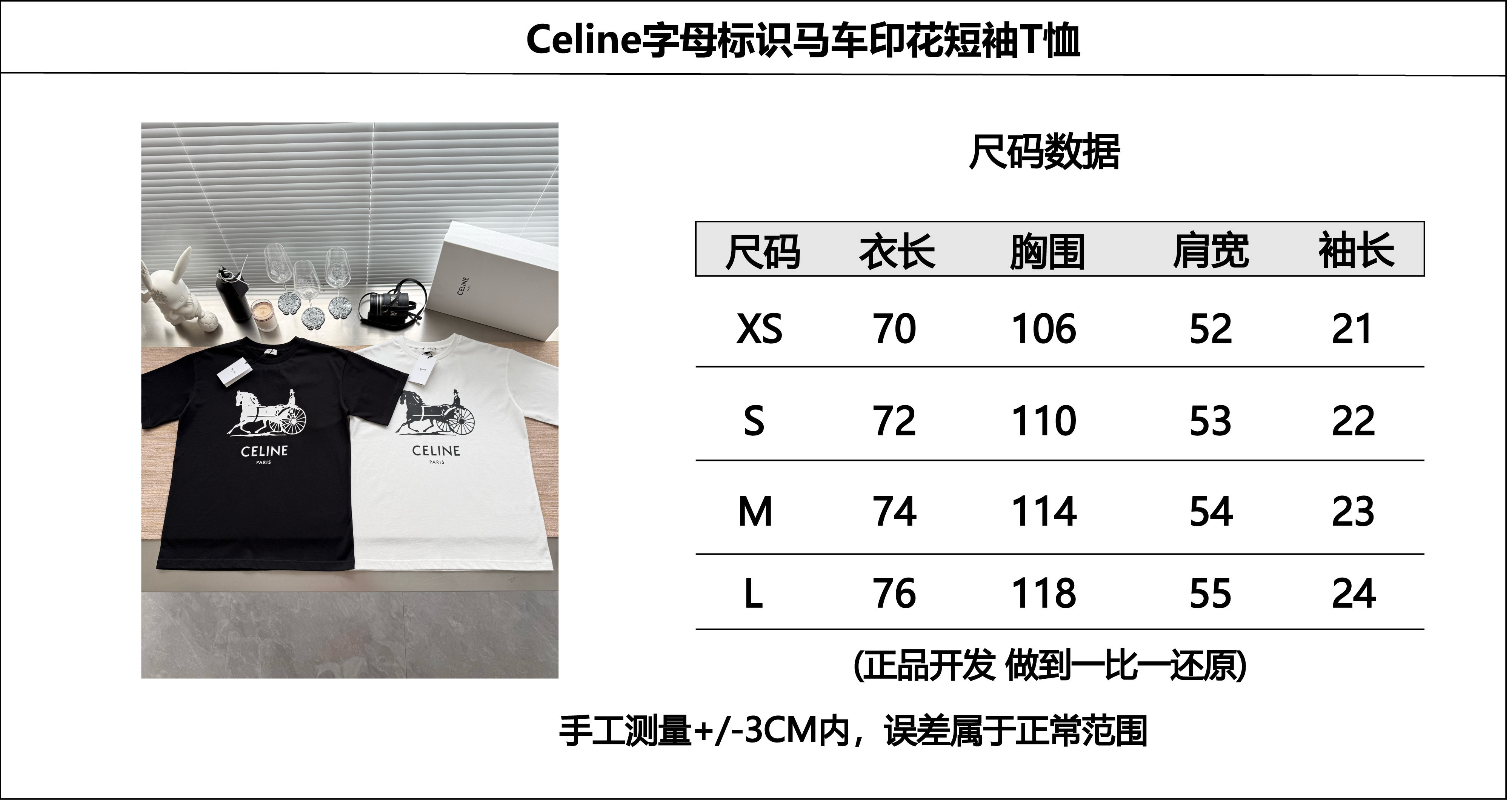 Celine 25ss字母标识马车印花短袖T恤‼️整件衣服4900购买ZP拆解打造,定制定染黑色纯棉面料,做到100%全棉进口纱线,意大利进口制造,定织标志性罗纹领口,前幅饰以字母标识马车夫图案印花,袖口 下摆双层锁边超高密度走线,真正做到1:1copy 闭眼入 码数:XS S M L