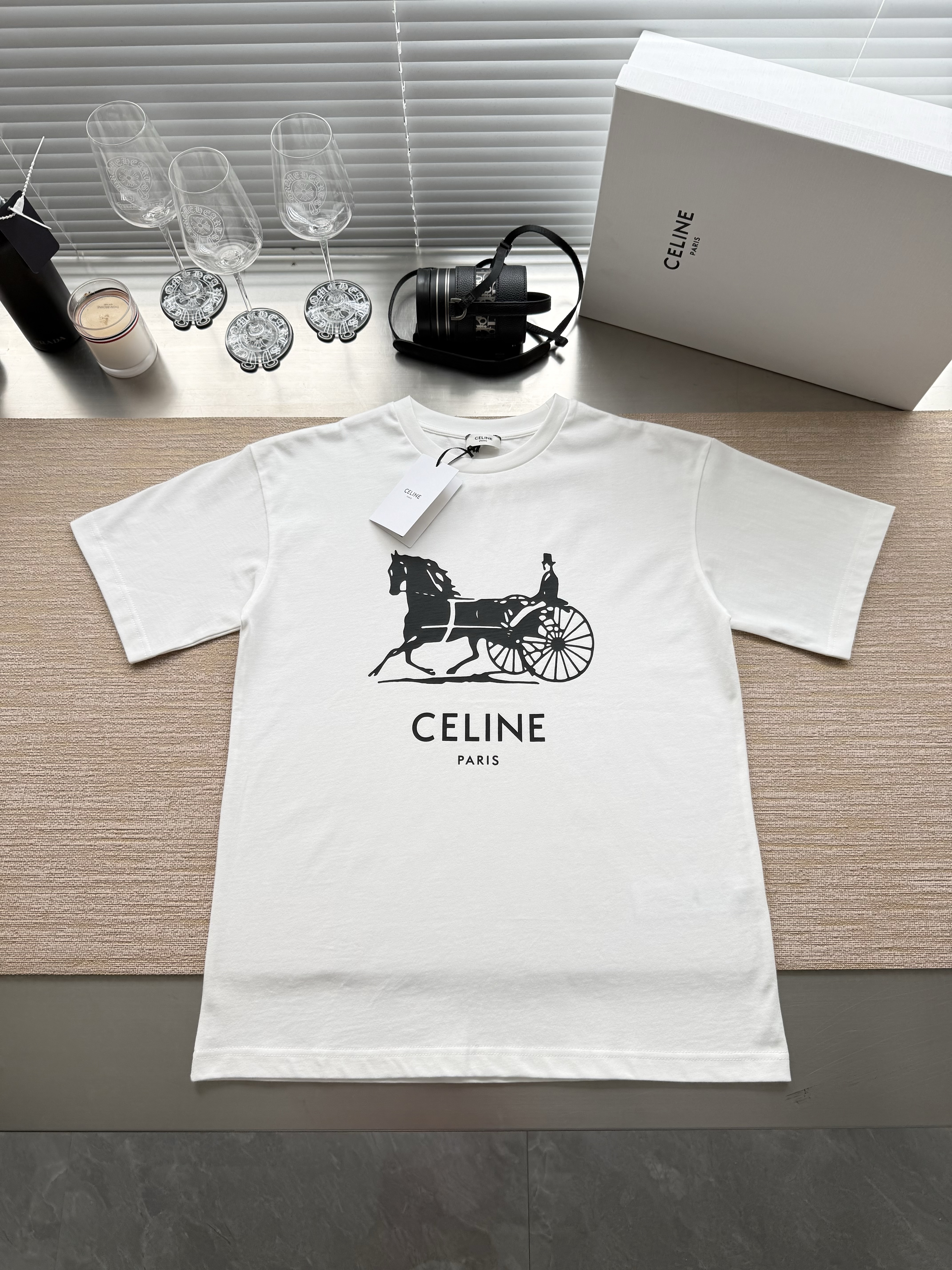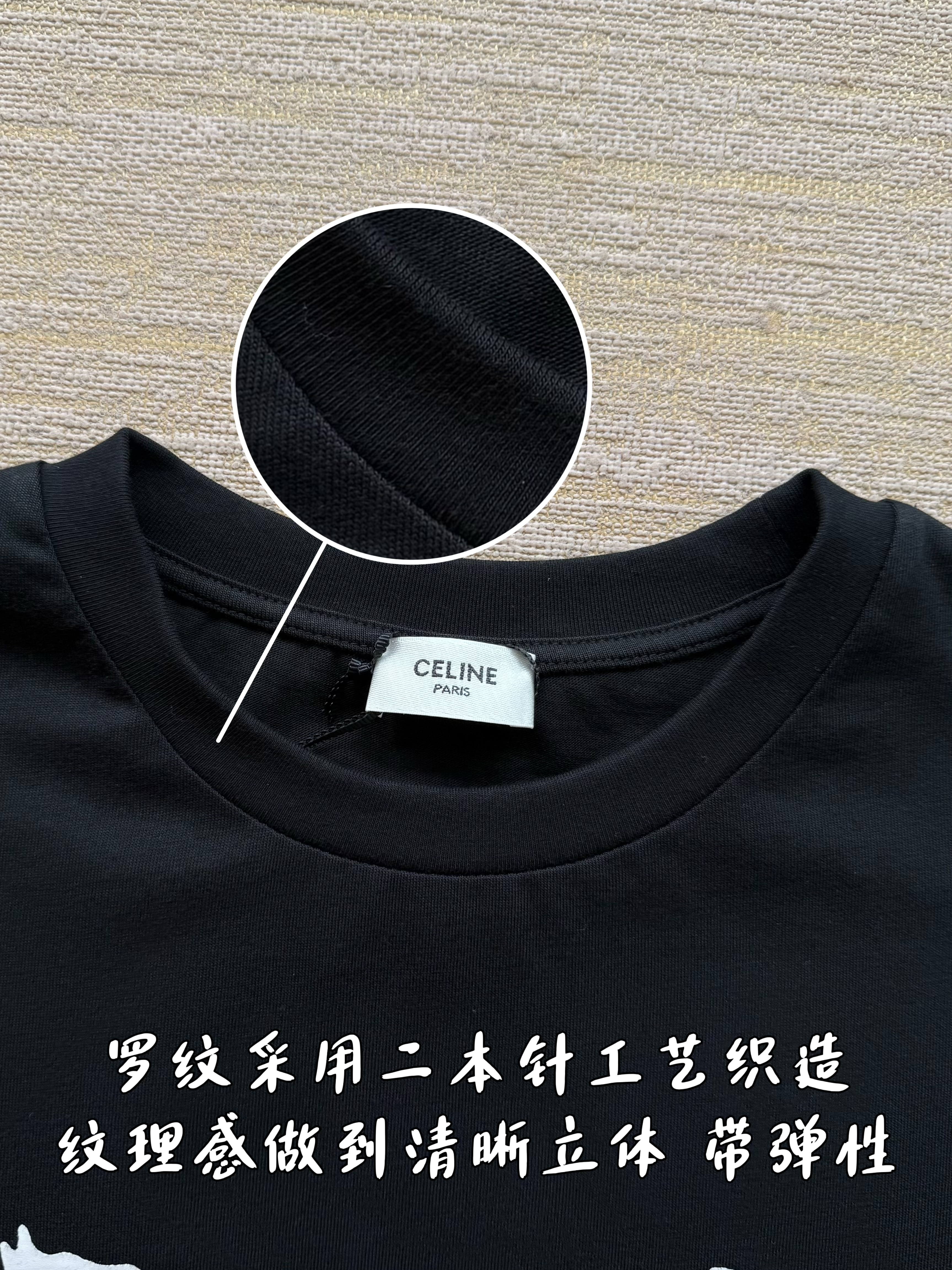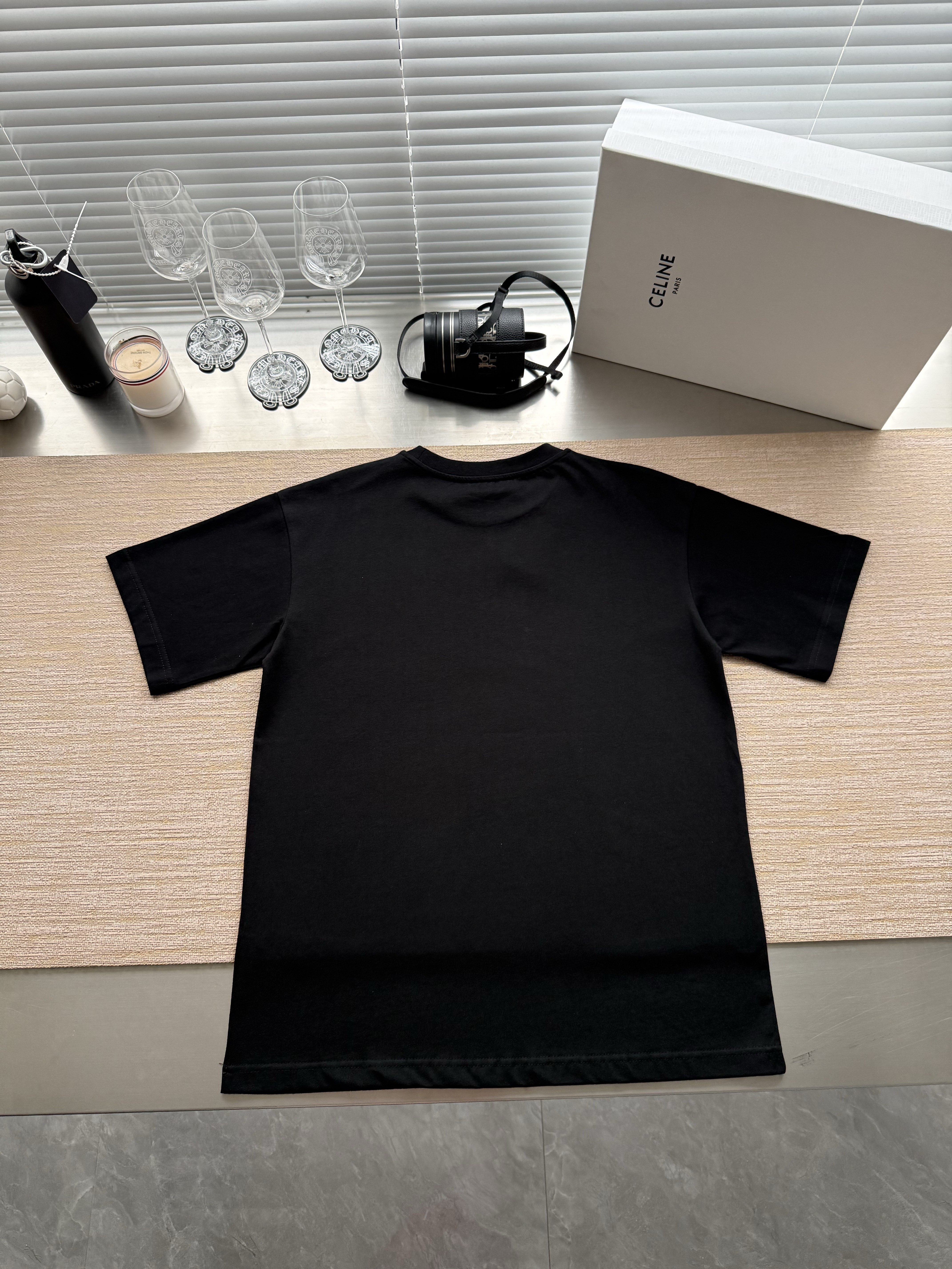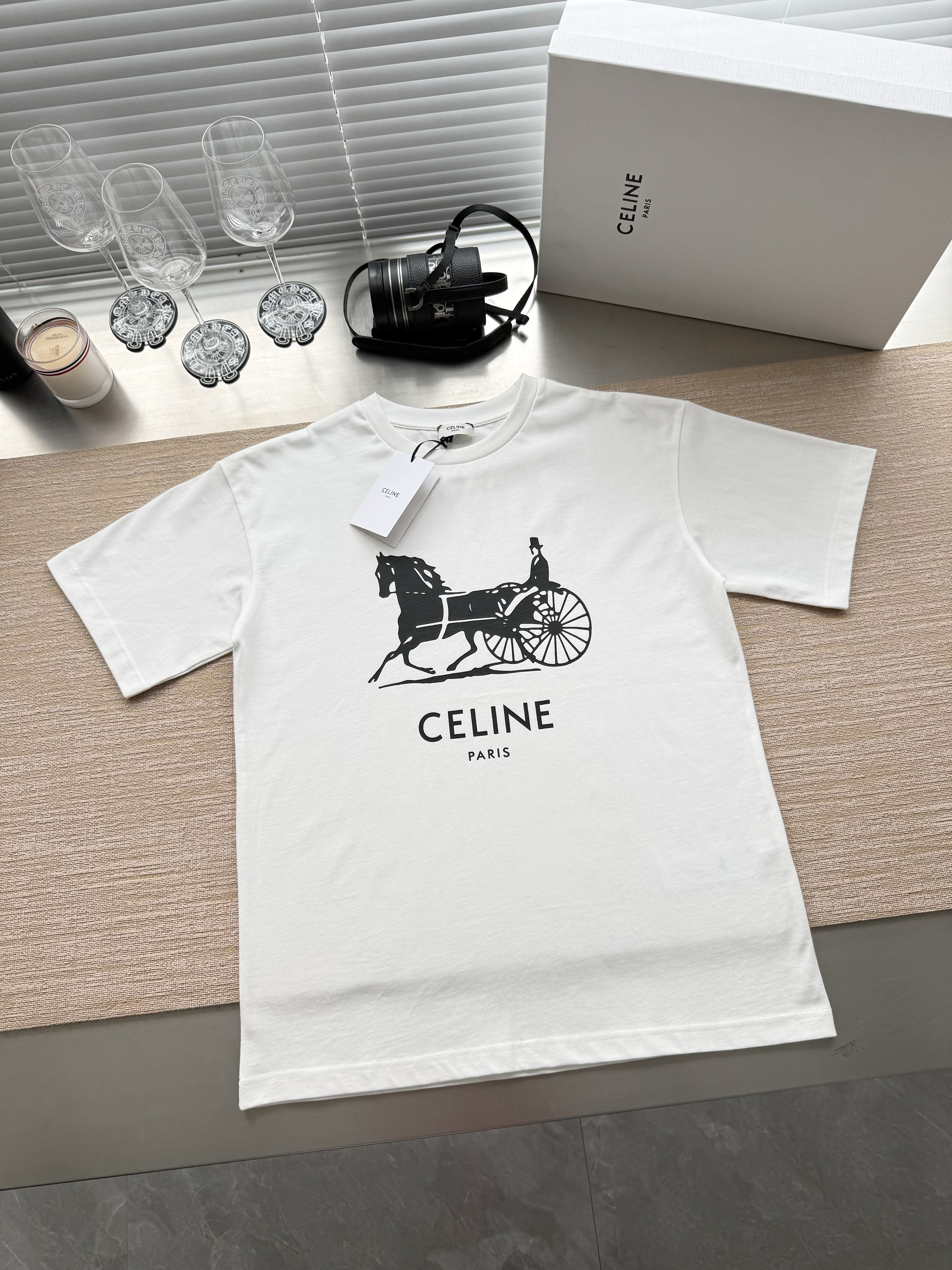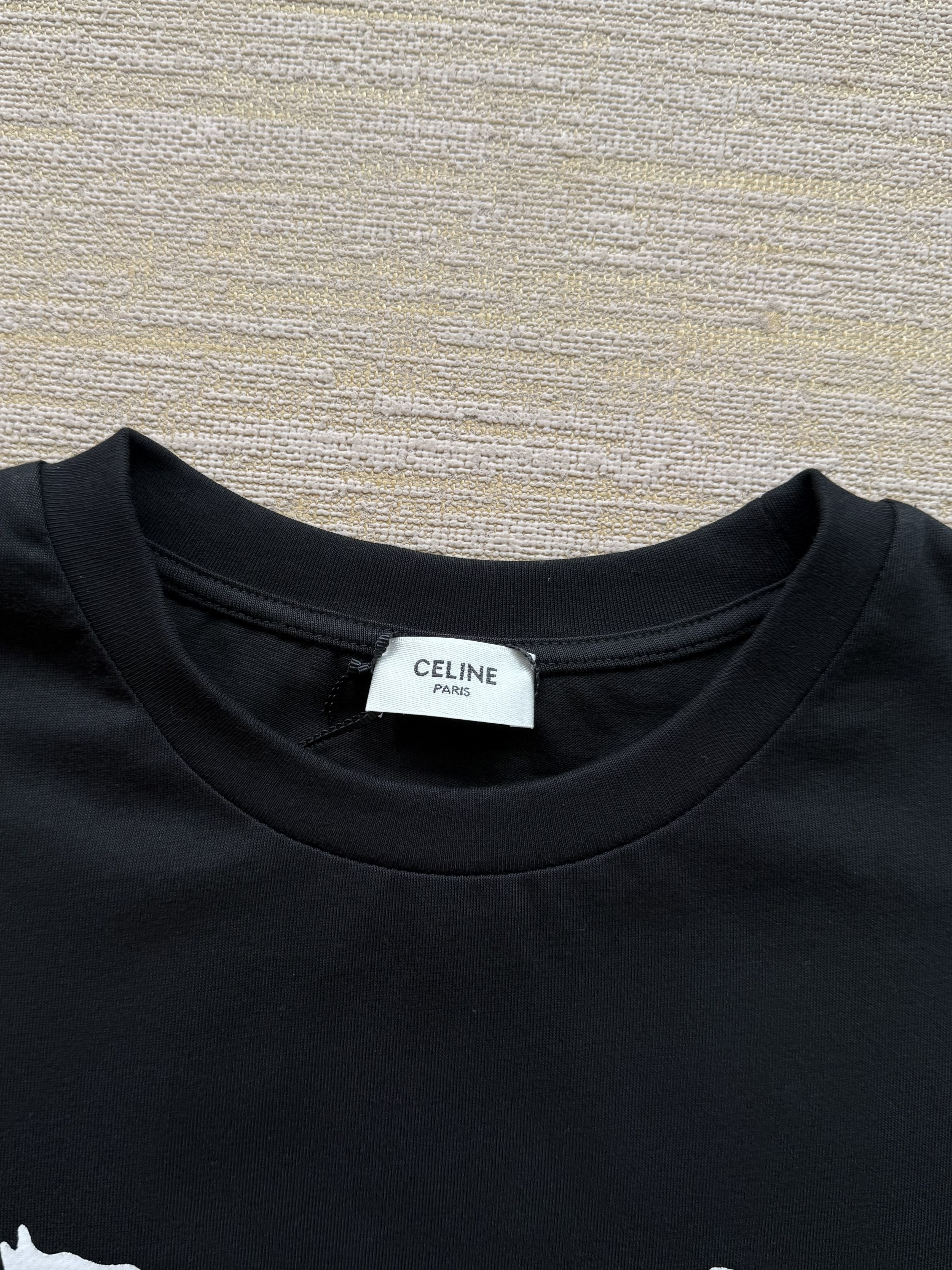 Celine 25ss字母标识马车印花短袖T恤‼️整件衣服4900购买ZP拆解打造,定制定染黑色纯棉面料,做到100%全棉进口纱线,意大利进口制造,定织标志性罗纹领口,前幅饰以字母标识马车夫图案印花,袖口 下摆双层锁边超高密度走线,真正做到1:1copy 闭眼入 码数:XS S M L